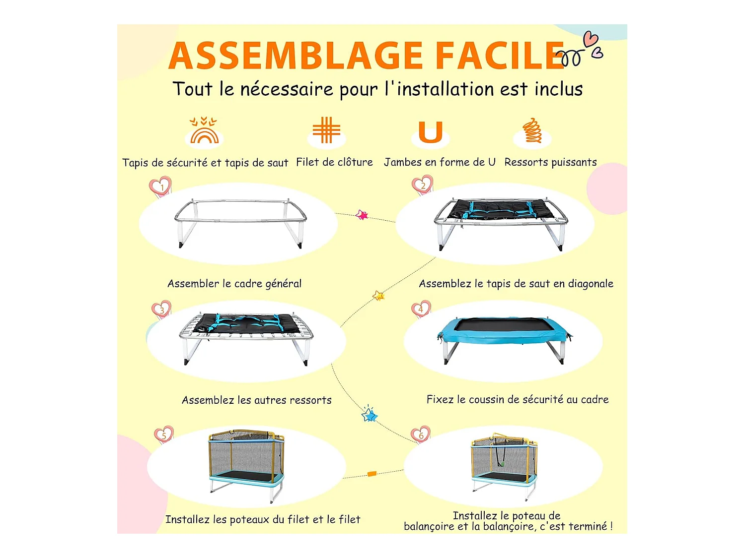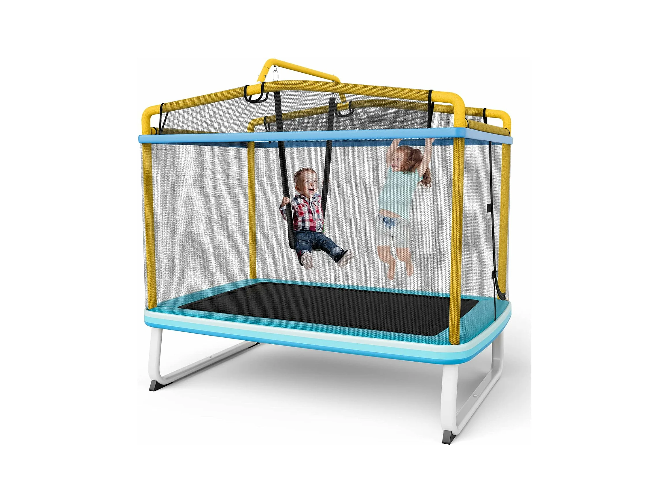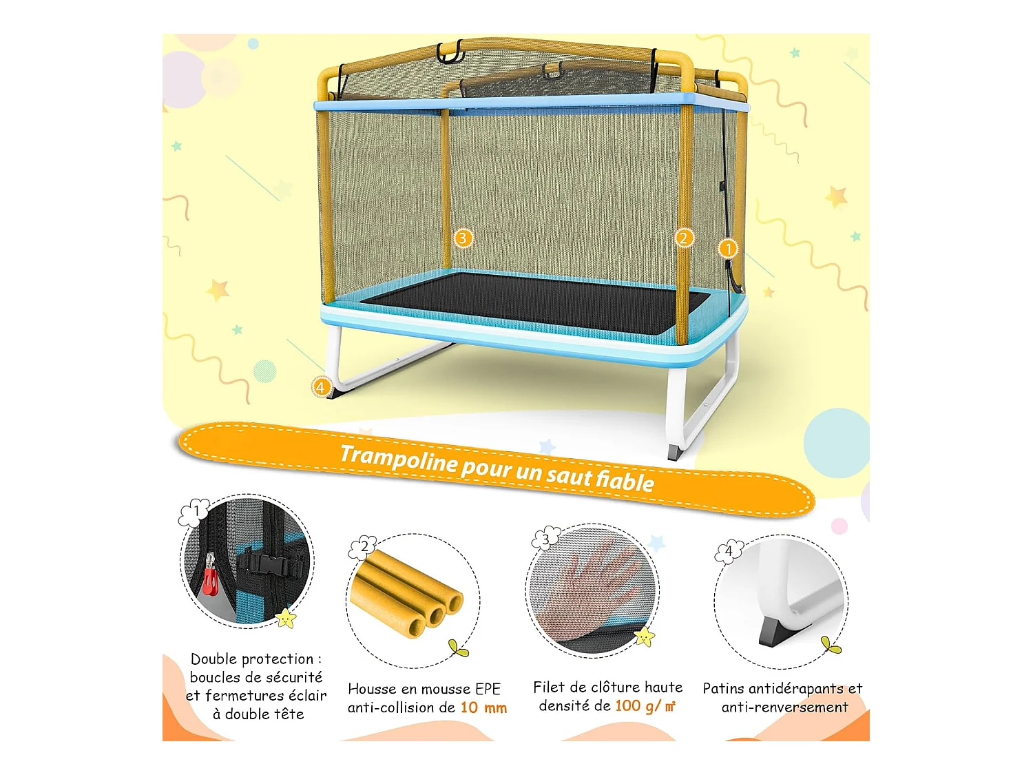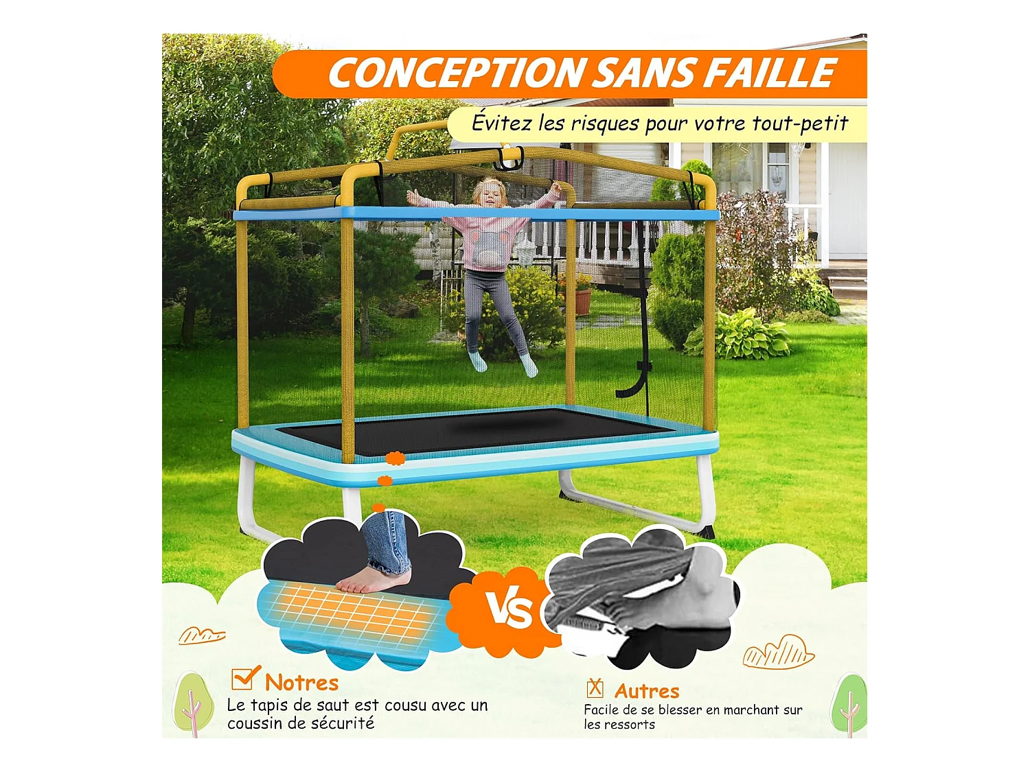 3 en 1 Trampoline Extérieur Enfants Rectangulair (190x124cm) avec Balançoire & Barre Horizontale, Trampoline de Jardin avec Filet de Sécurité, Charge Max 110kg, Jaune