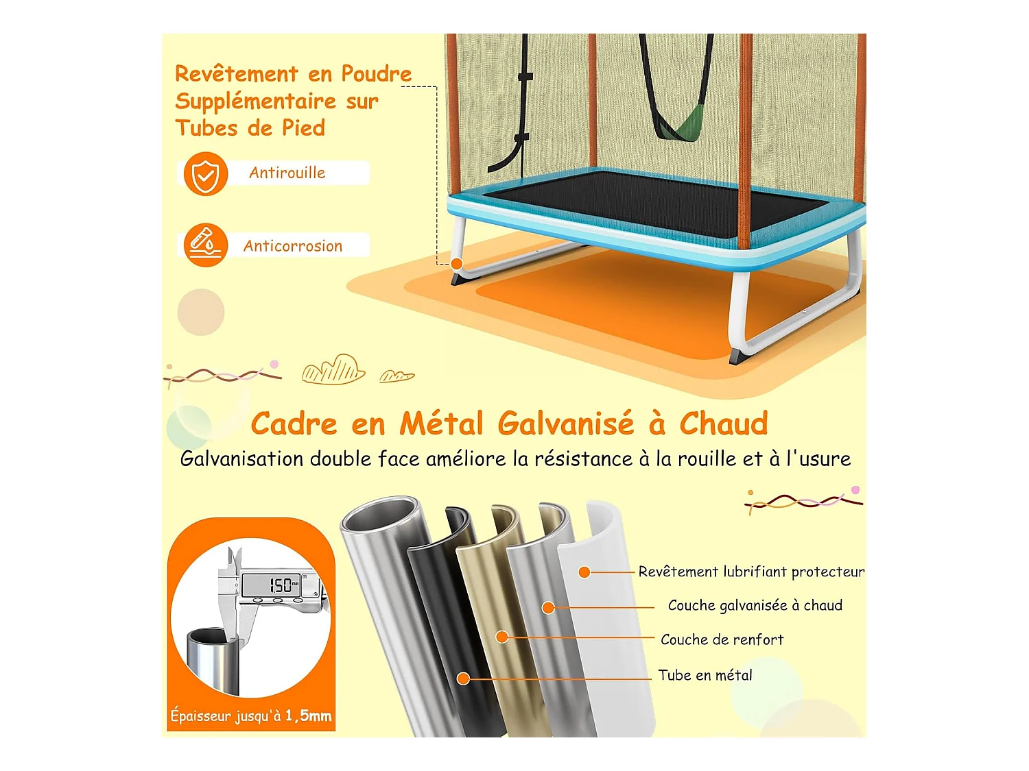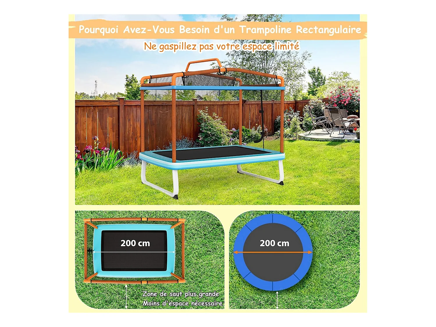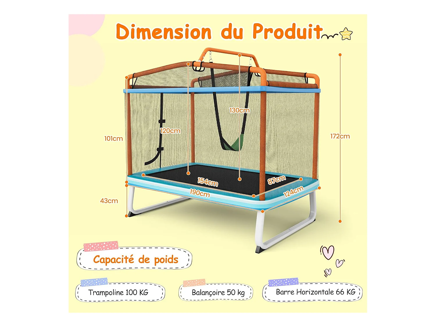 3 en 1 Trampoline Extérieur Enfants Rectangulaire (190x124cm) avec Balançoire & Barre Horizontale, Trampoline de Jardin avec Filet de Sécurité, Charge Max 110kg pour Garçon et Fille