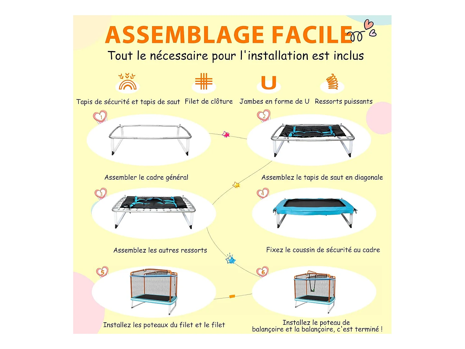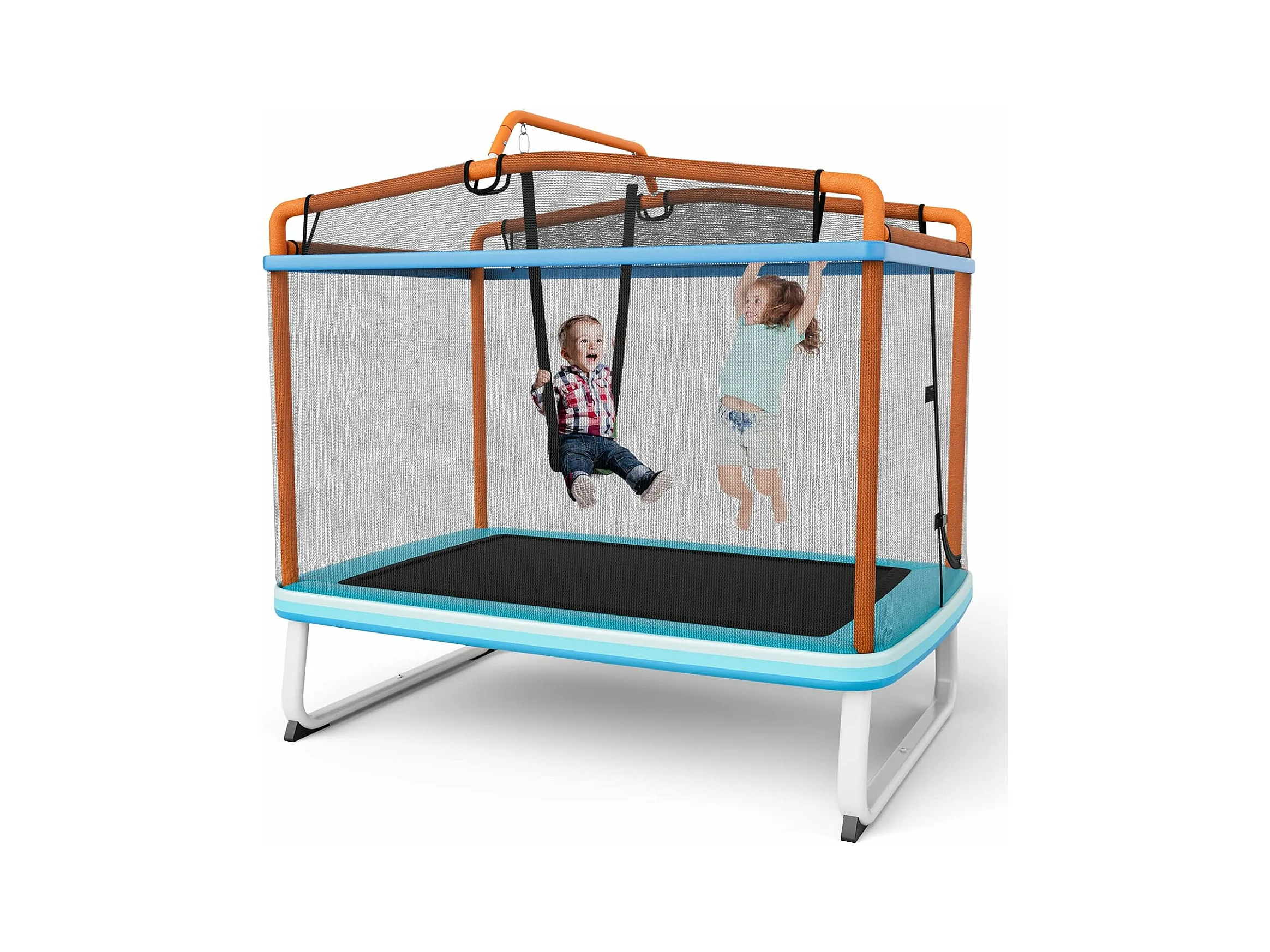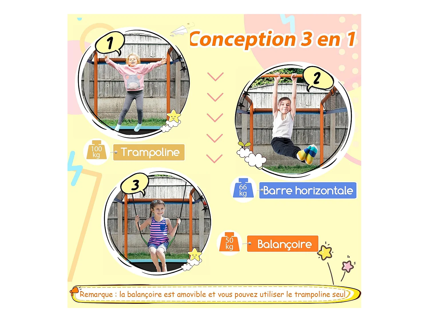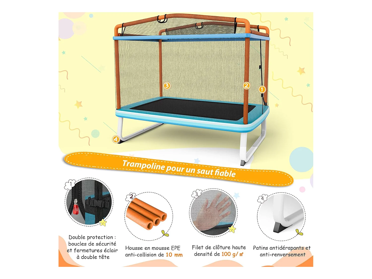 3 en 1 Trampoline Extérieur Enfants Rectangulaire (190x124cm) avec Balançoire & Barre Horizontale, Trampoline de Jardin avec Filet de Sécurité, Charge Max 110kg pour Garçon et Fille