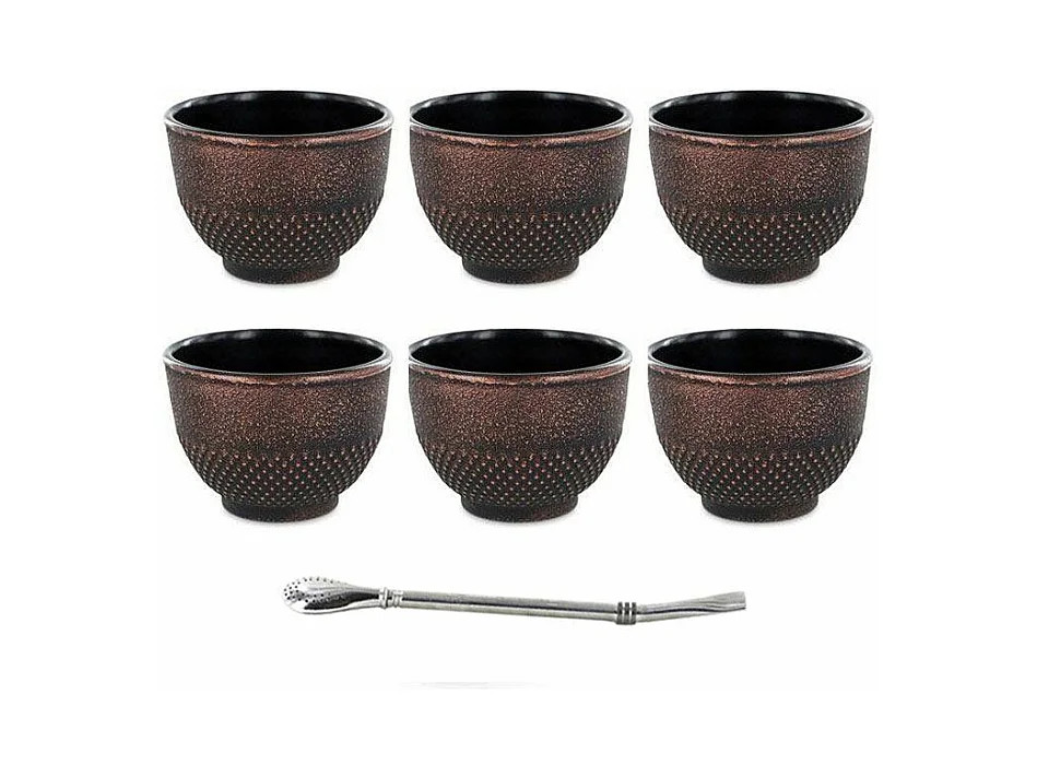 6 tasses en fonte noires & bronze 15 cl + paille inox avec filtre