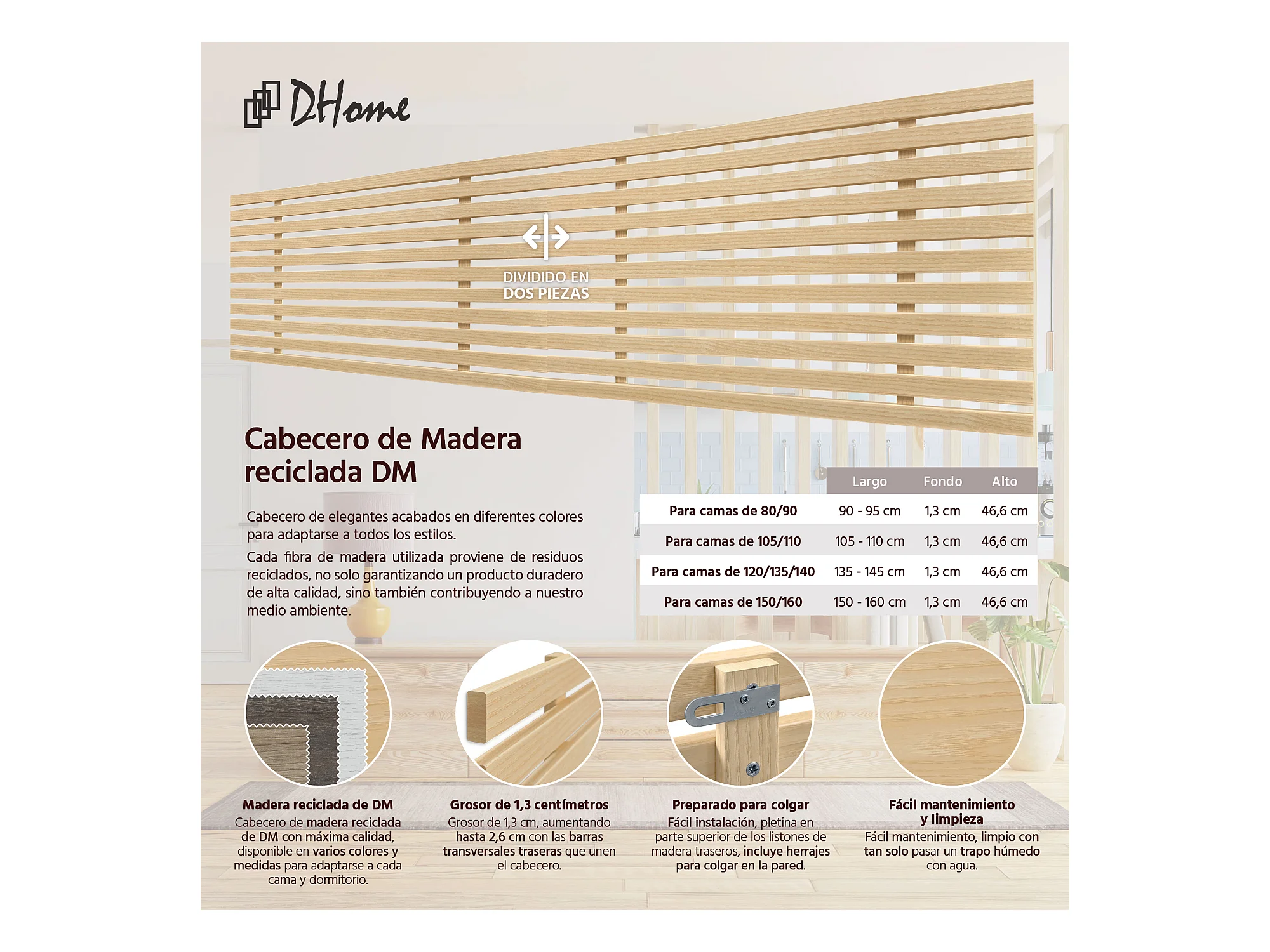 DHOME Tête de Lit en Bois DM Recyclé Double Style Palette Horizontale 180x46cm Lits 180 - Finition Lin