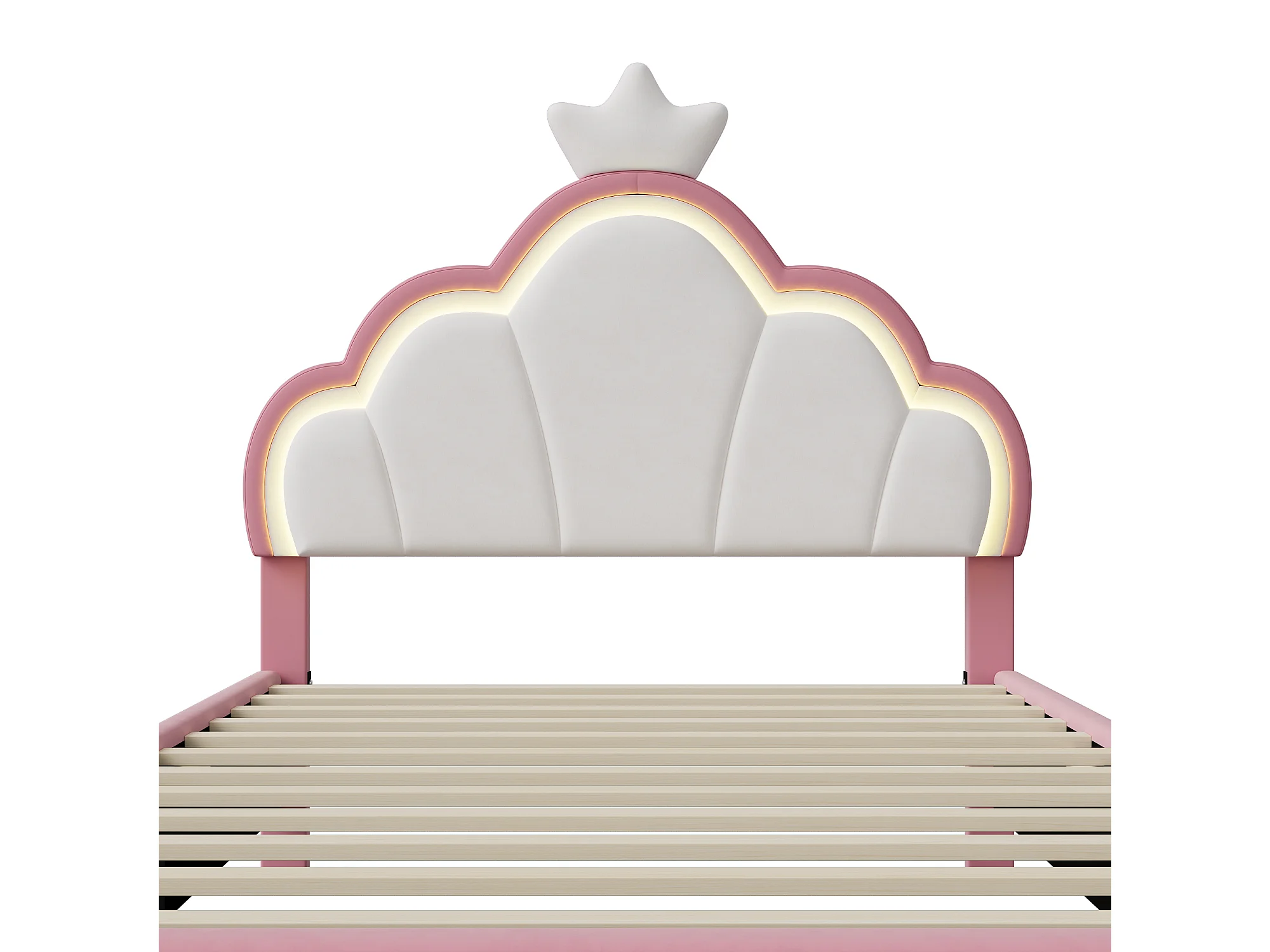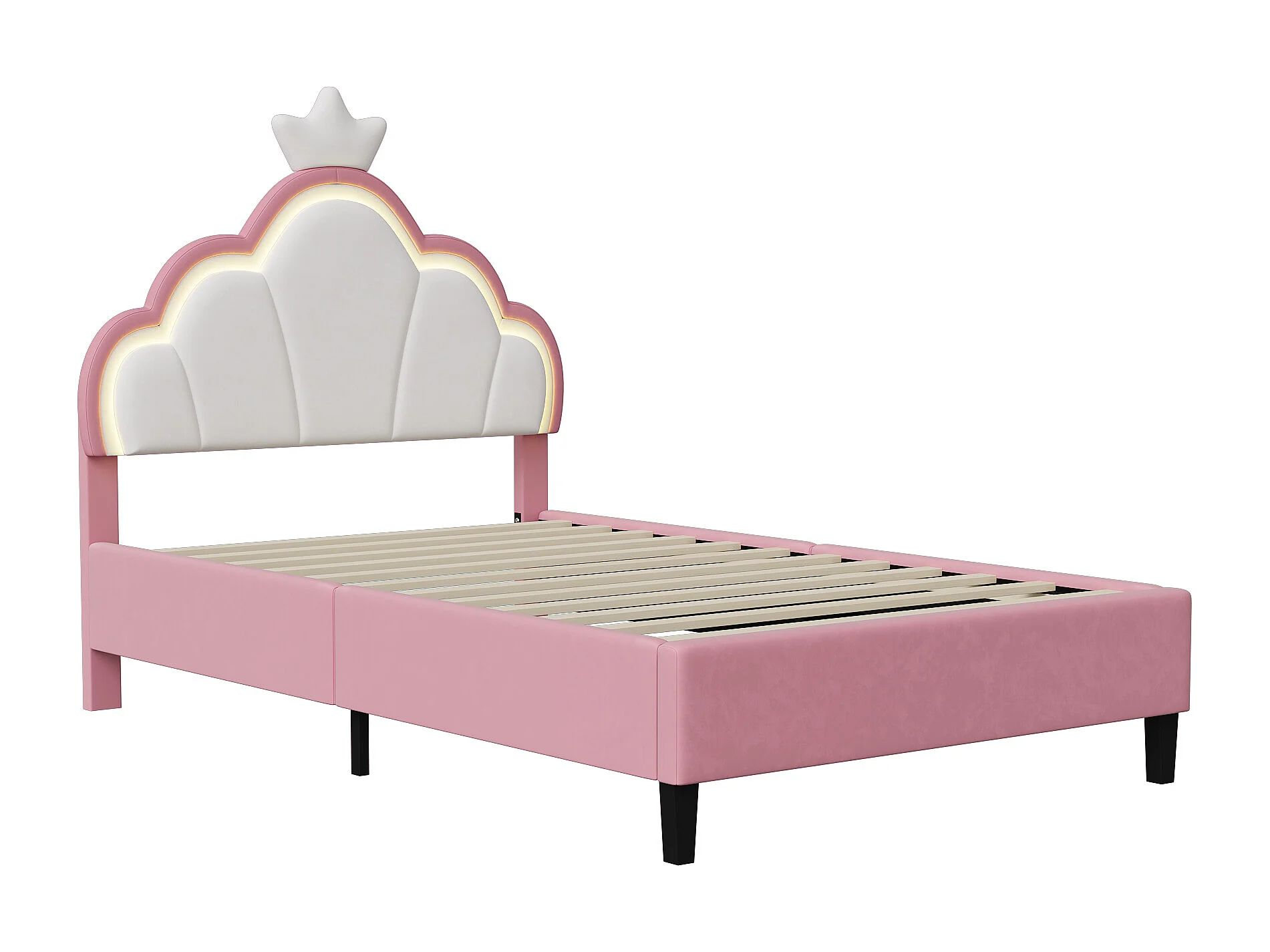 Lit Enfant 90x200 cm, Lit Enfant Fille Rembourré avec Bande LED, Lit Princesse avec Sommier à Lattes, Lit Simple en forme de Couronne, Tête de Lit, Velours, Rose