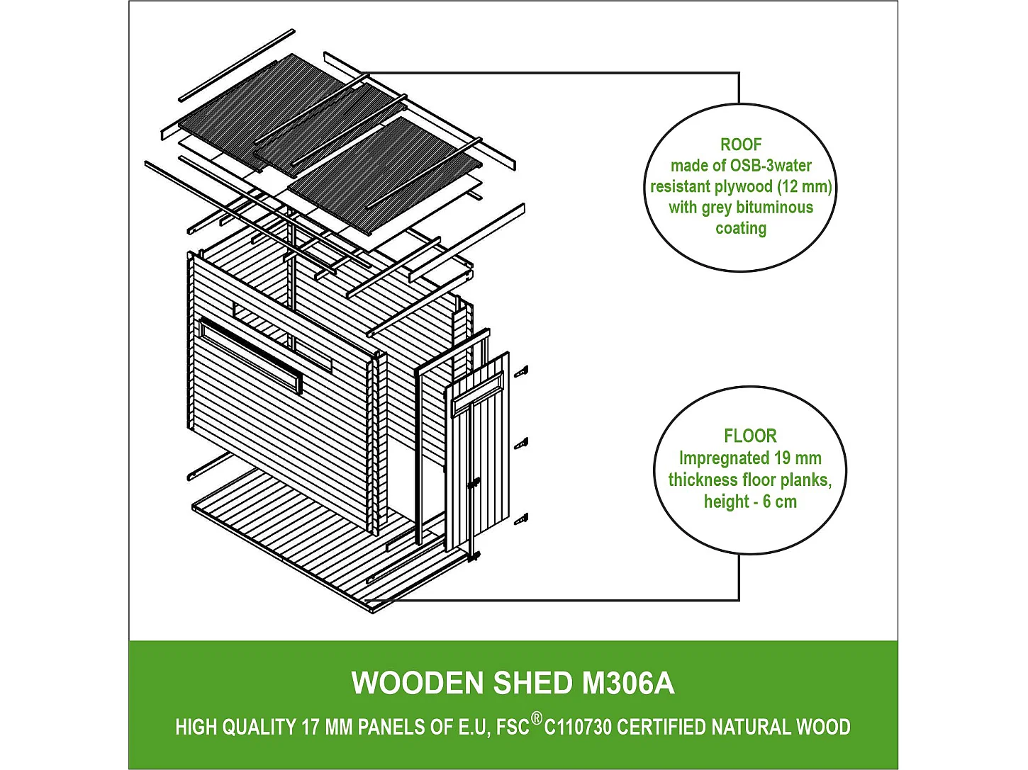 Abri de jardin en bois avec sol traité - l239xL144xH198 cm/2.63 m2 - M306A+M306G