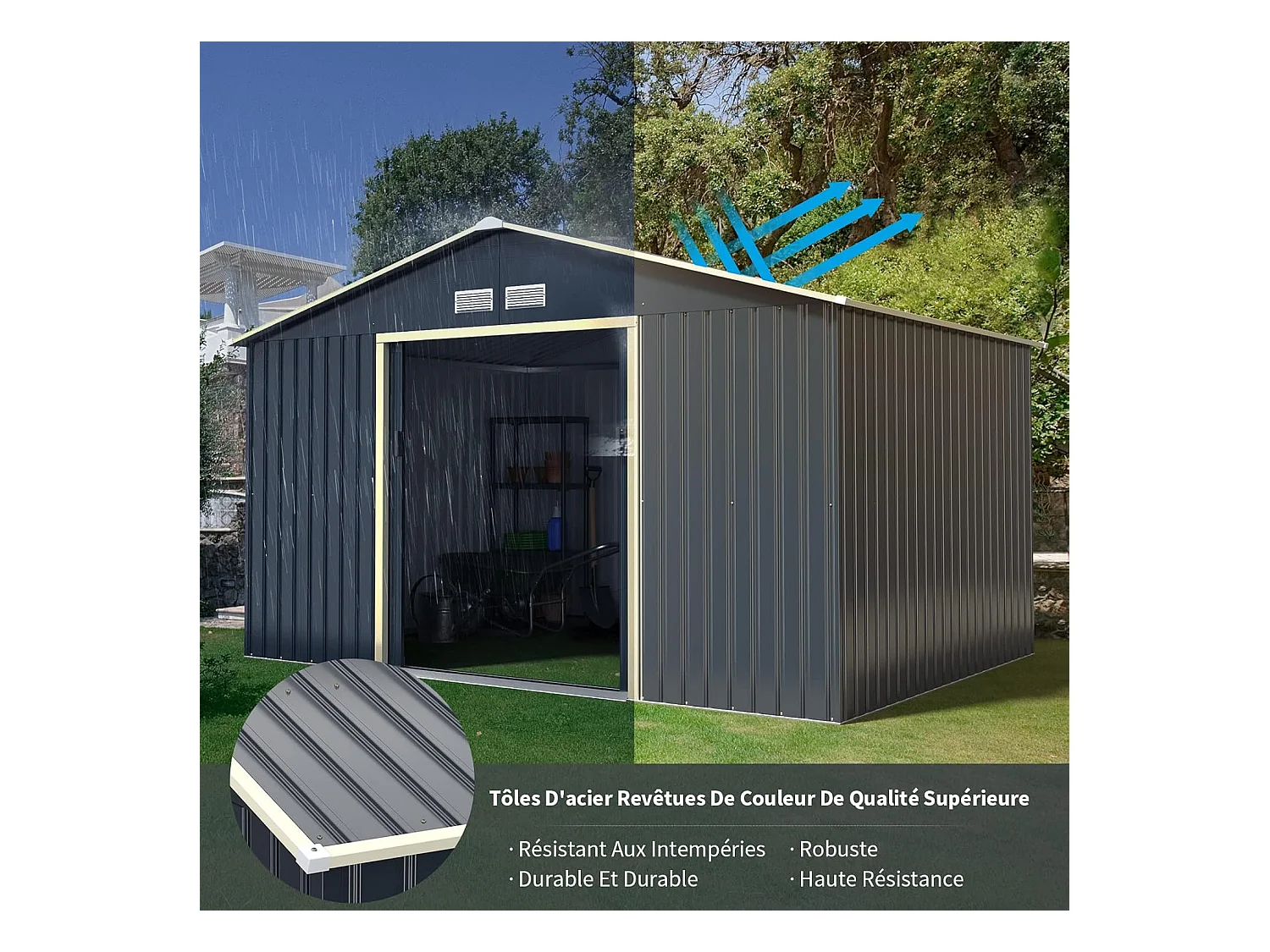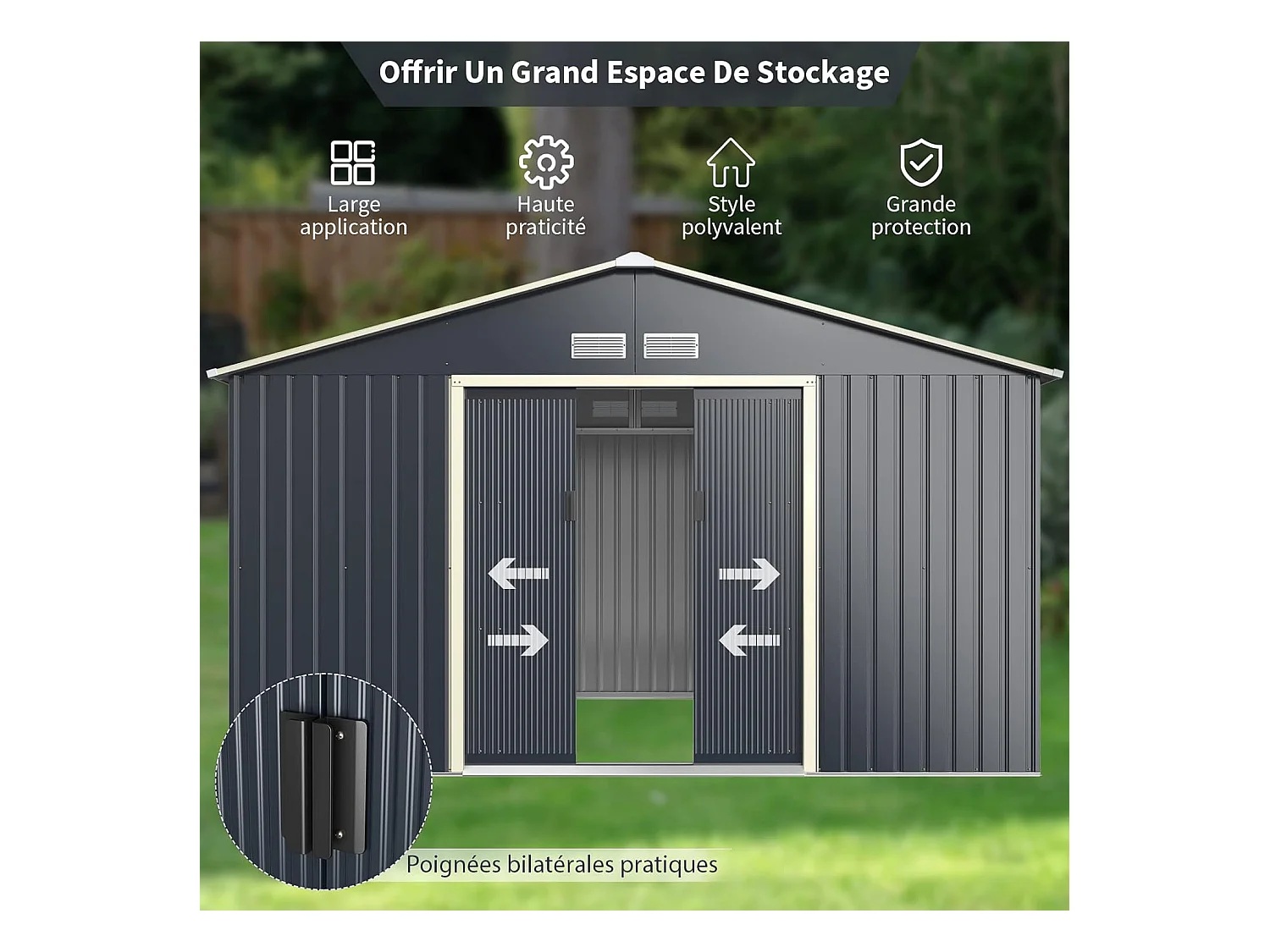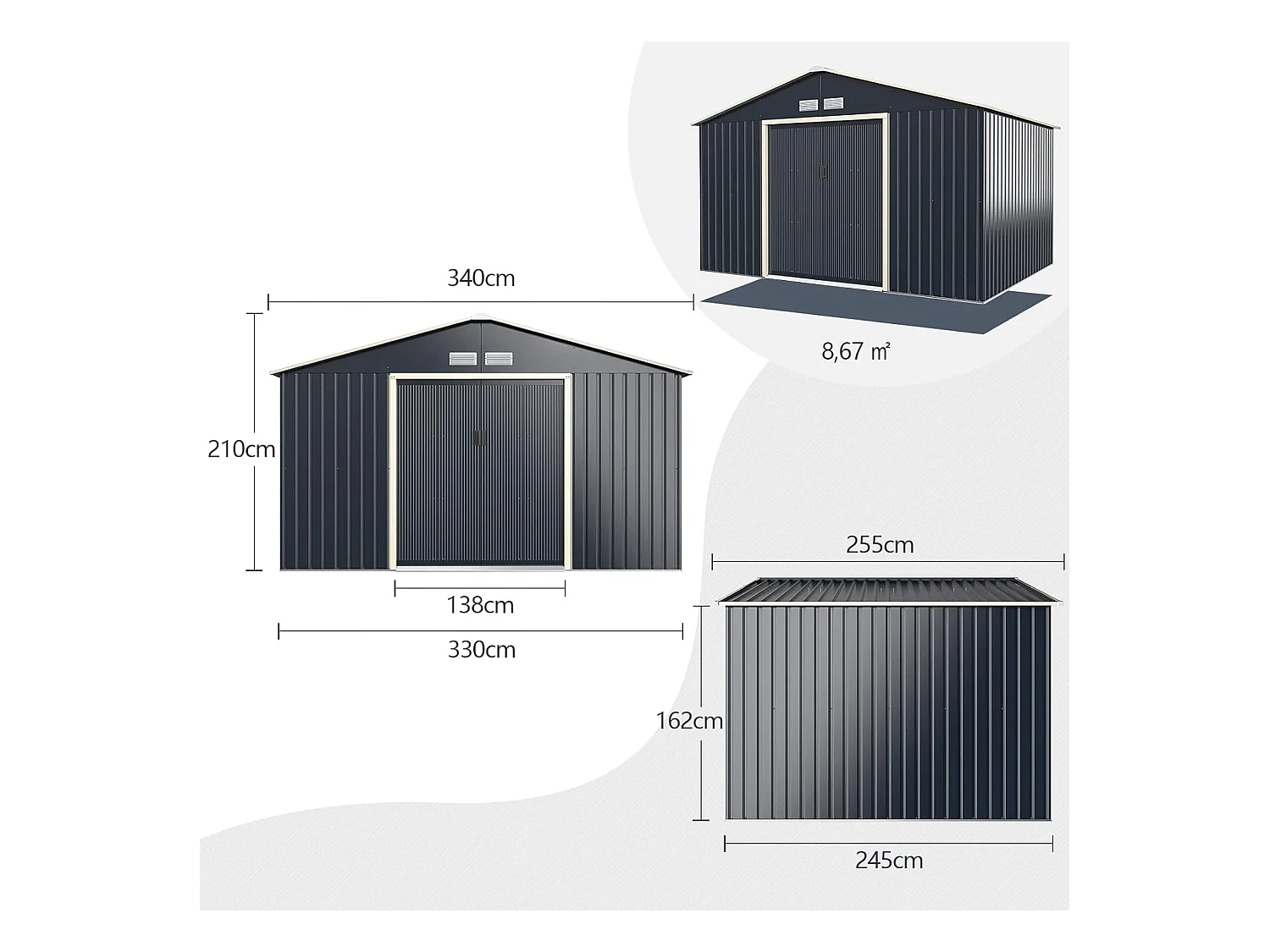 Abri de Jardin Métal 8,7㎡- 2 Portes Coulissantes Verrouillables, 4 Trous d’Aération, Toit Penché, Cabane Exterieur pour Vélo, Poubelle, 340 x 255 x 210 cm (Gris)
