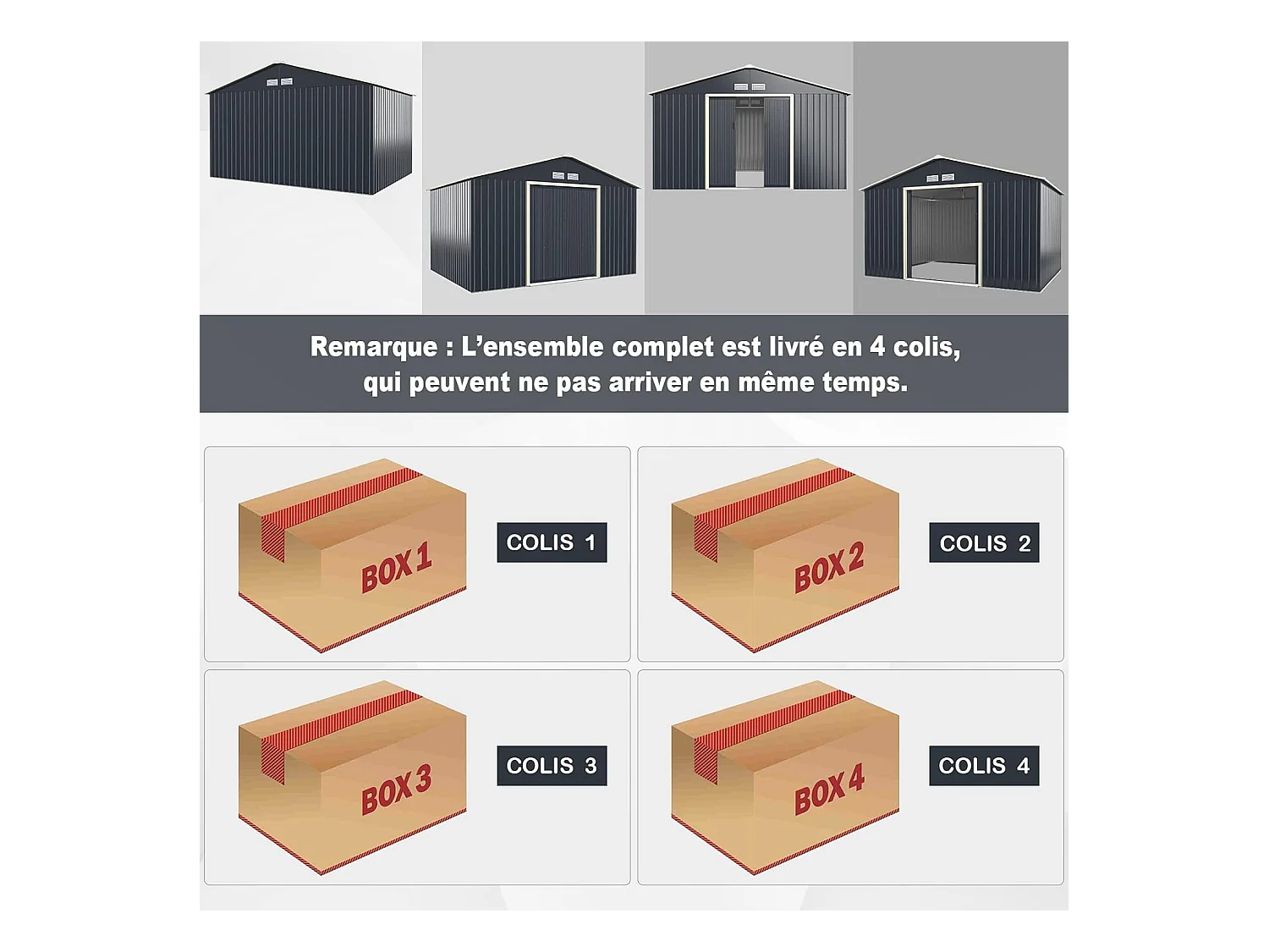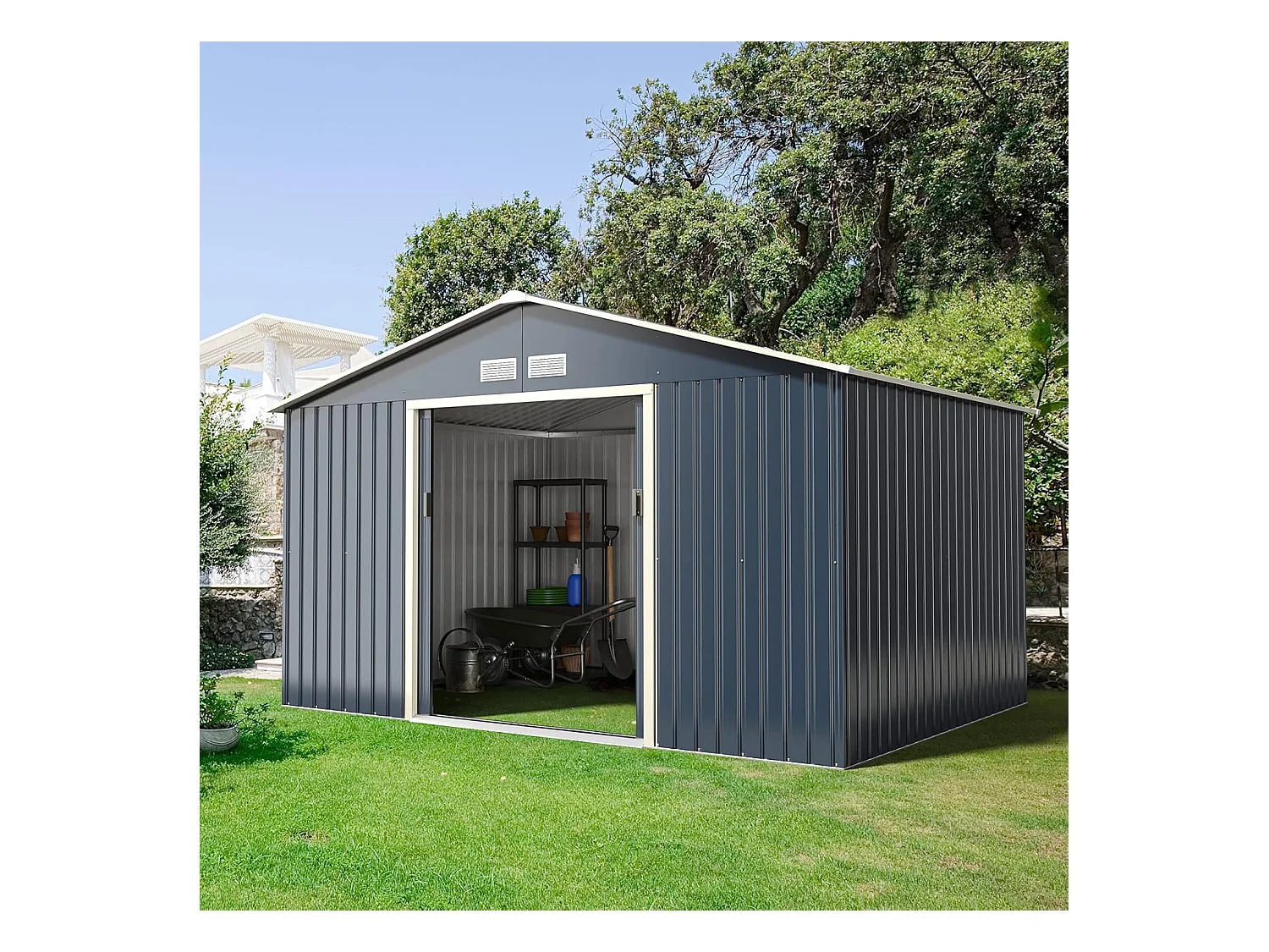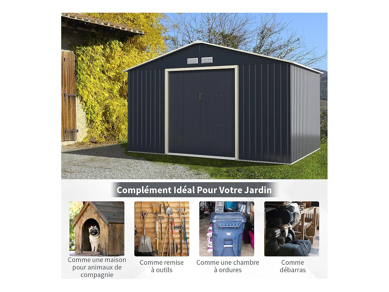 Abri de Jardin Métal 8,7㎡- 2 Portes Coulissantes Verrouillables, 4 Trous d’Aération, Toit Penché, Cabane Exterieur pour Vélo, Poubelle, 340 x 255 x 210 cm (Gris)