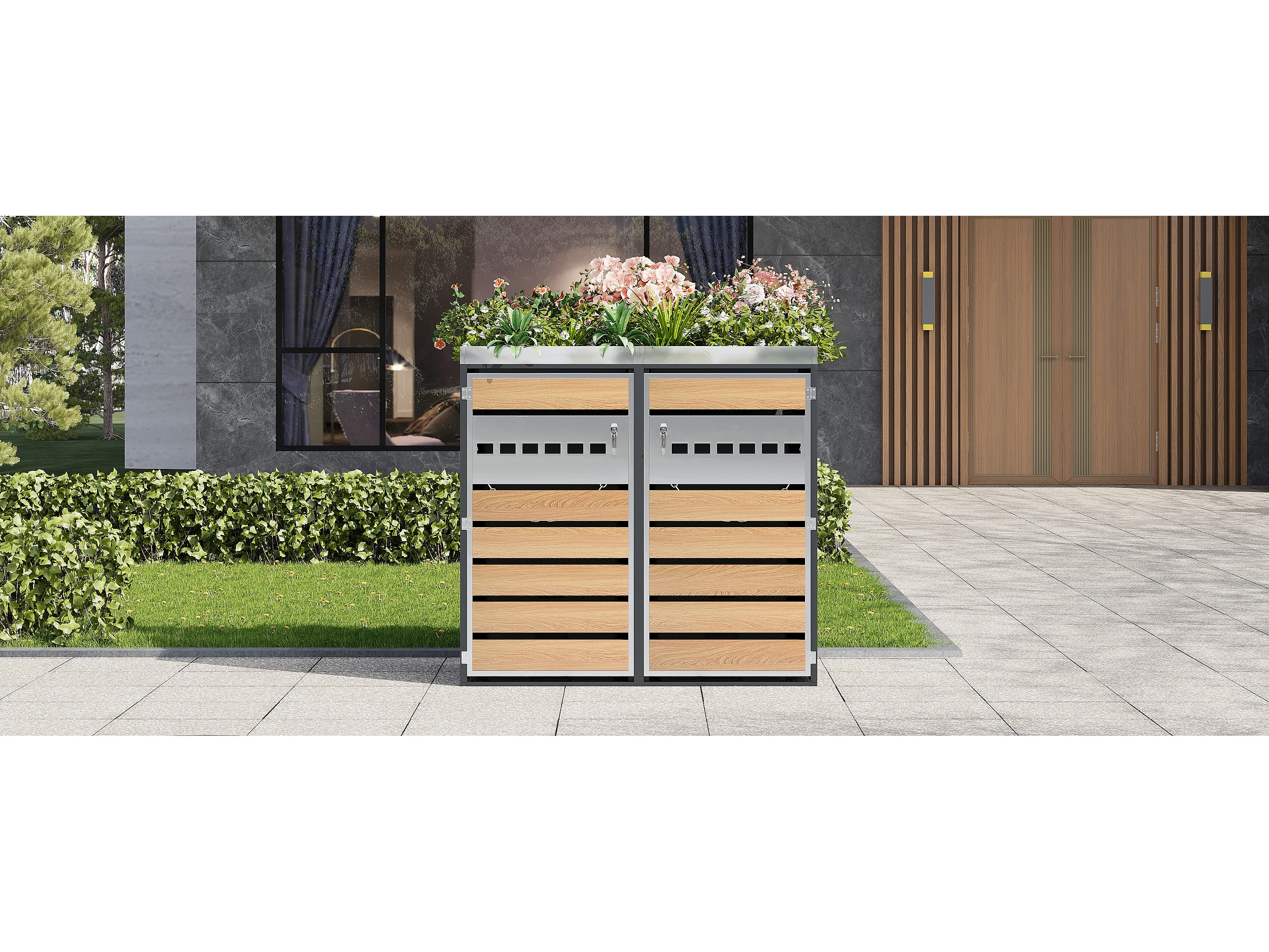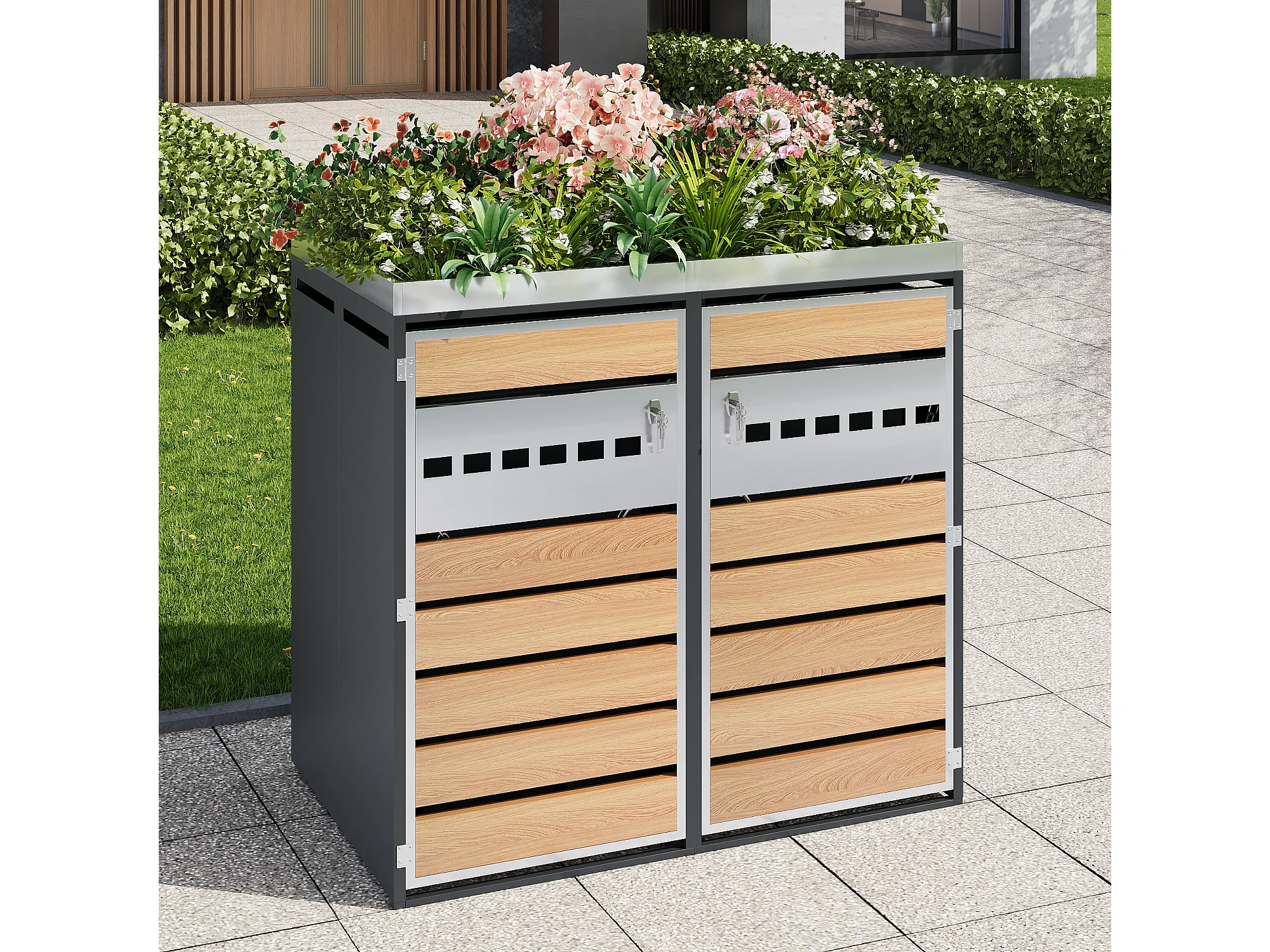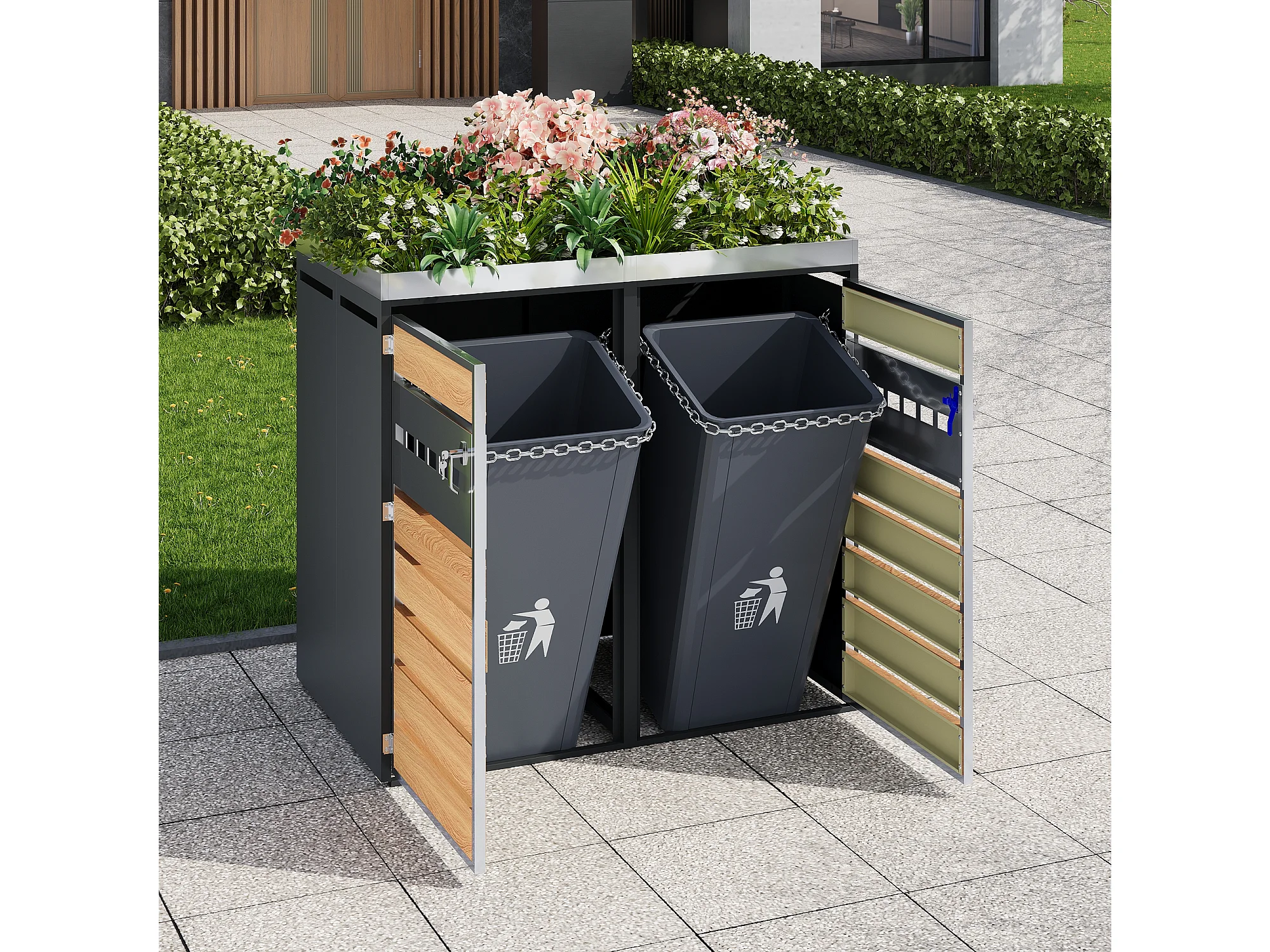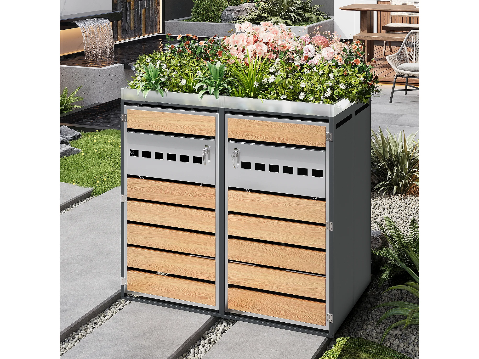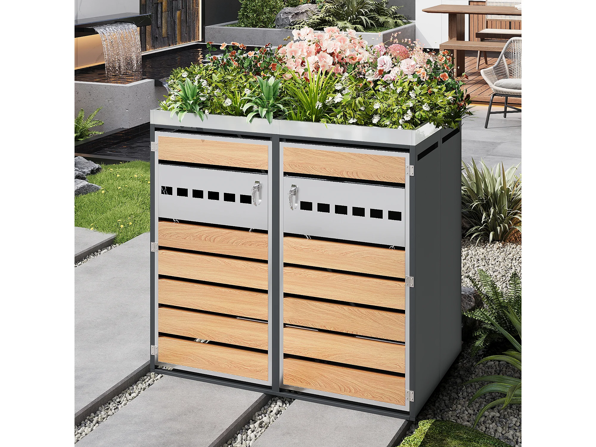 Abri pour 2 poubelles de jardin - 132 x 80 x 124.5 cm - avec 2 portes + plantation + verrouillable - métal - gris + naturel