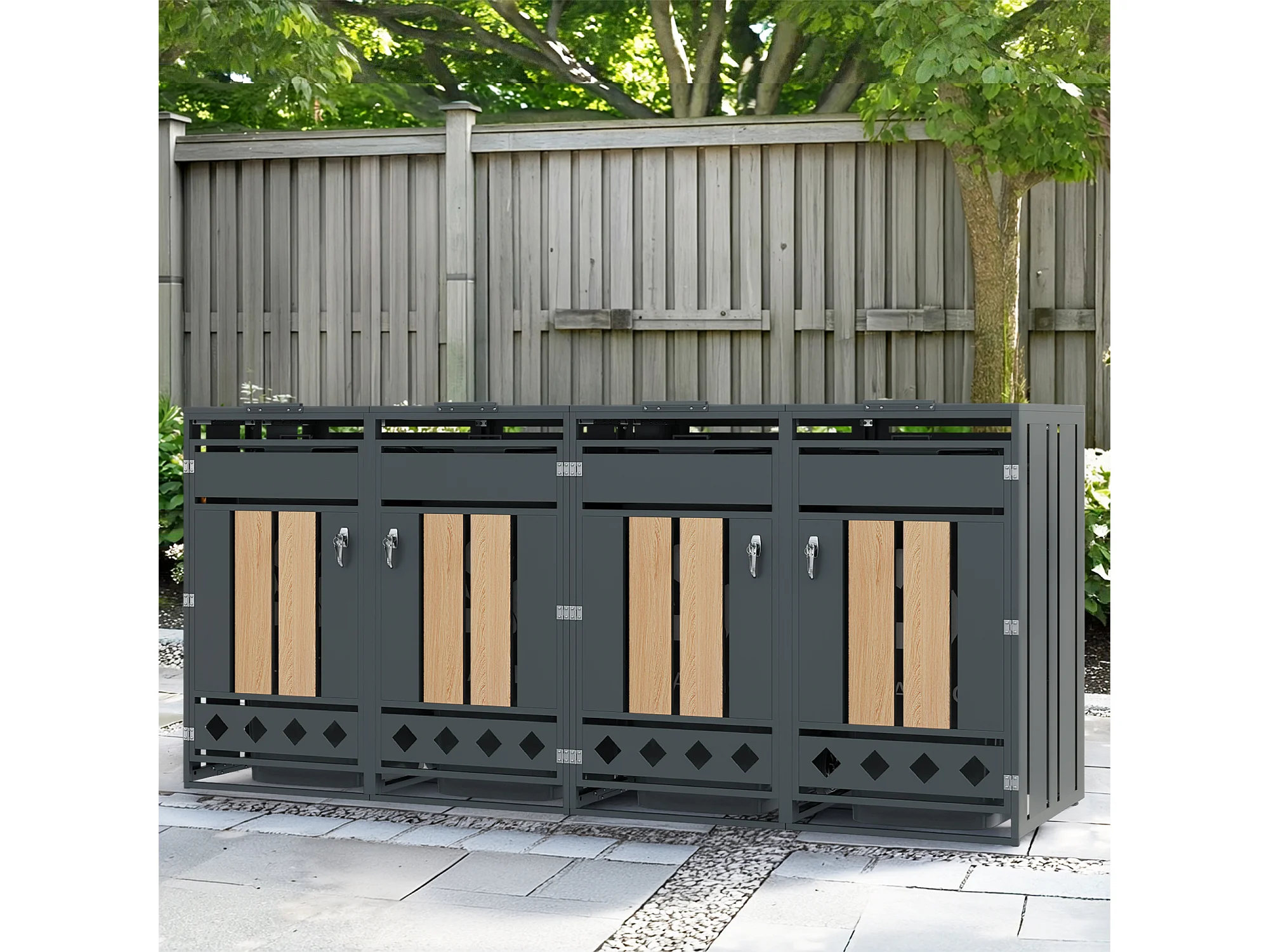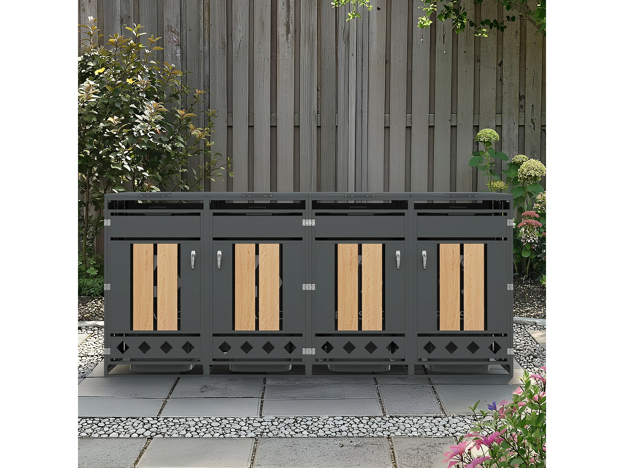 Abri pour 4 poubelles de jardin - 2 x 132 x 80 x 118.5 cm - avec couvercle à charnières + verrouillable + 2 portes - métal - gris + naturel