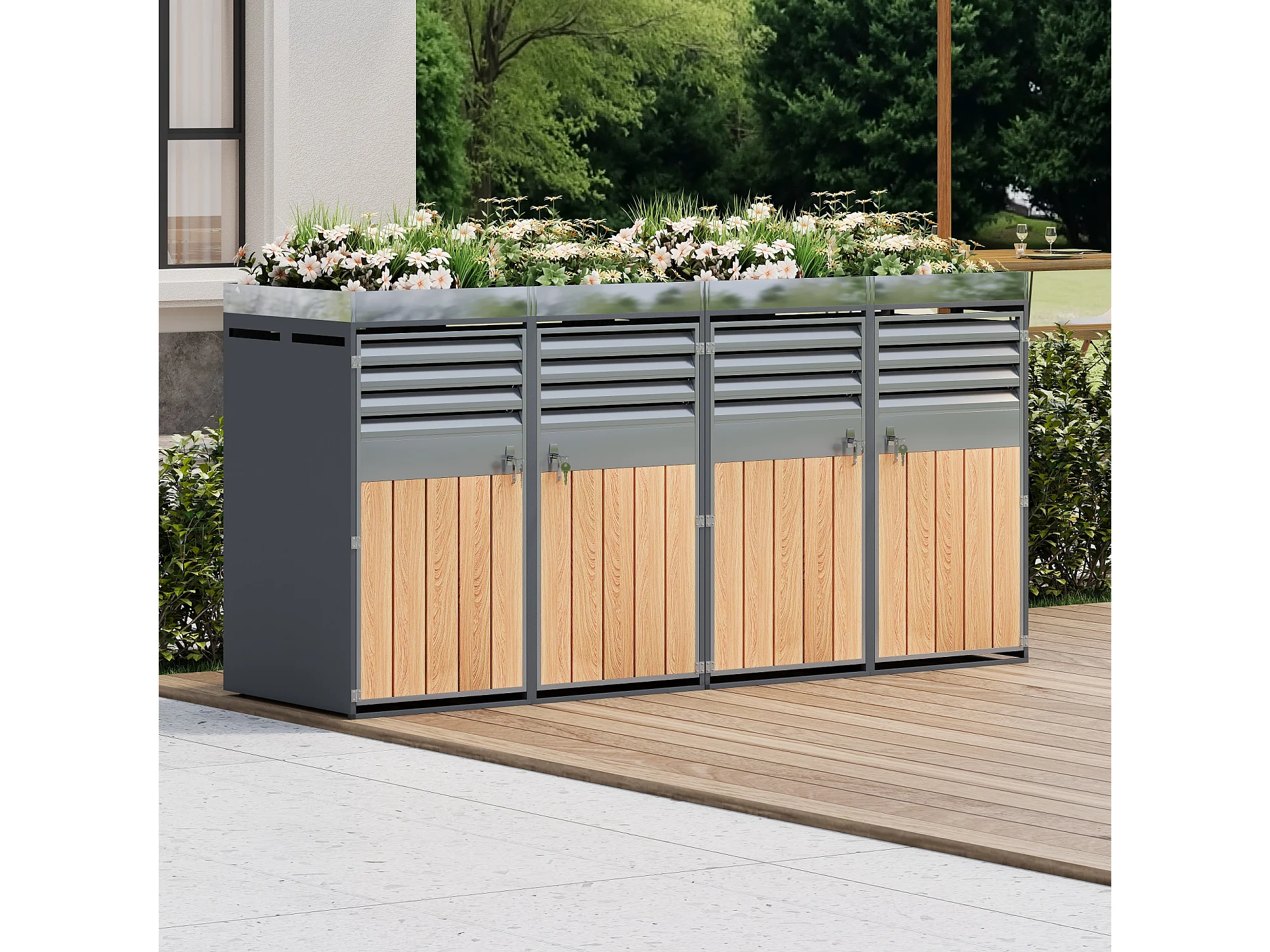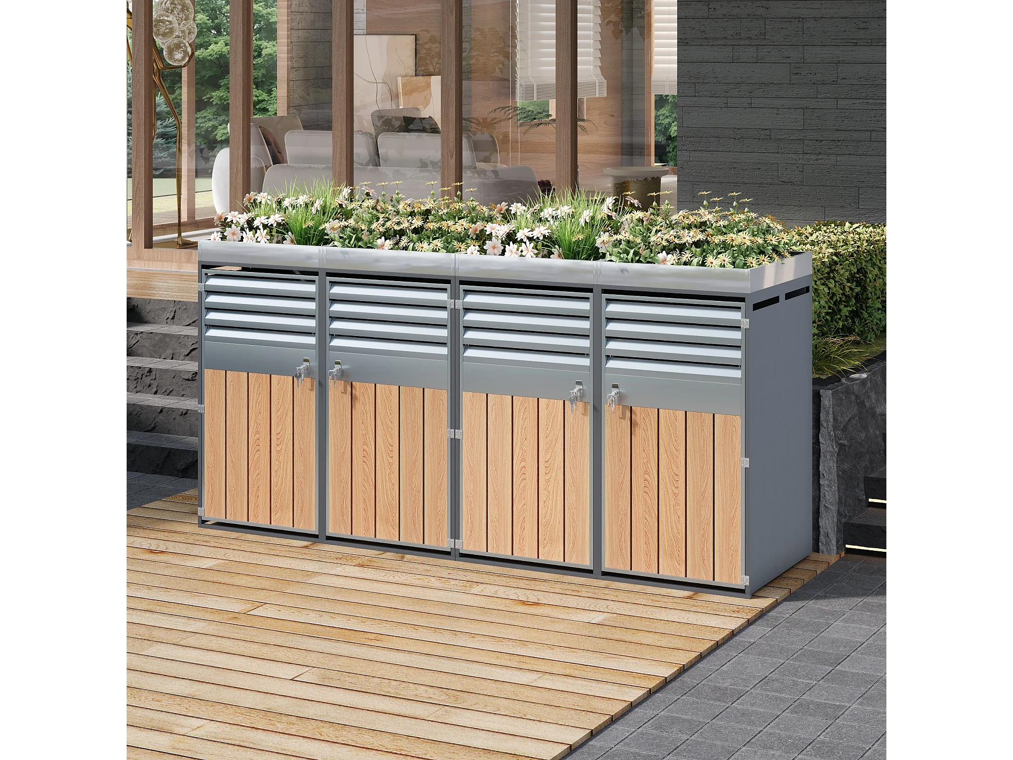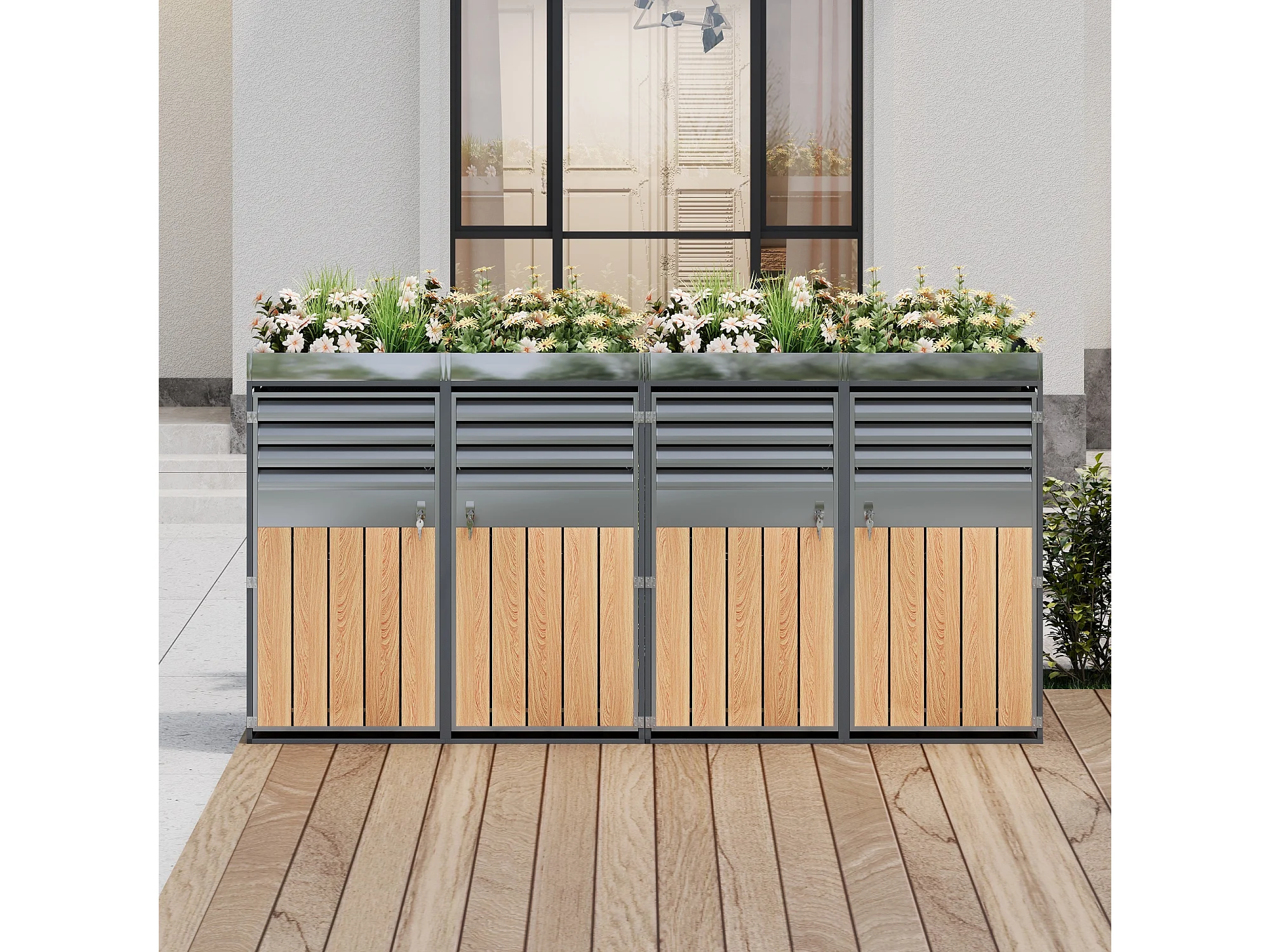 Abri pour 4 poubelles de jardin - 2 x 132 x 80 x 124.5 cm - avec persiennes + verrouillable + 2 portes + plantation - métal - gris + naturel