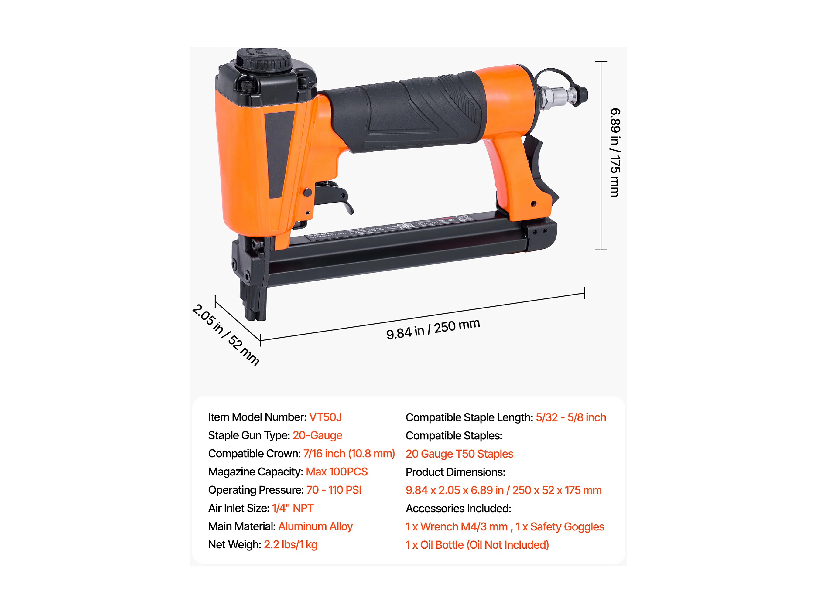Agrafeuse Pneumatique SucceBuy, Calibre 20, Compatible avec Agrafes T50 Non Inclues de Largeur de Couronne 1.08 cm, de Longueur 0.4-1.6 cm, 4,8-7,6 bar