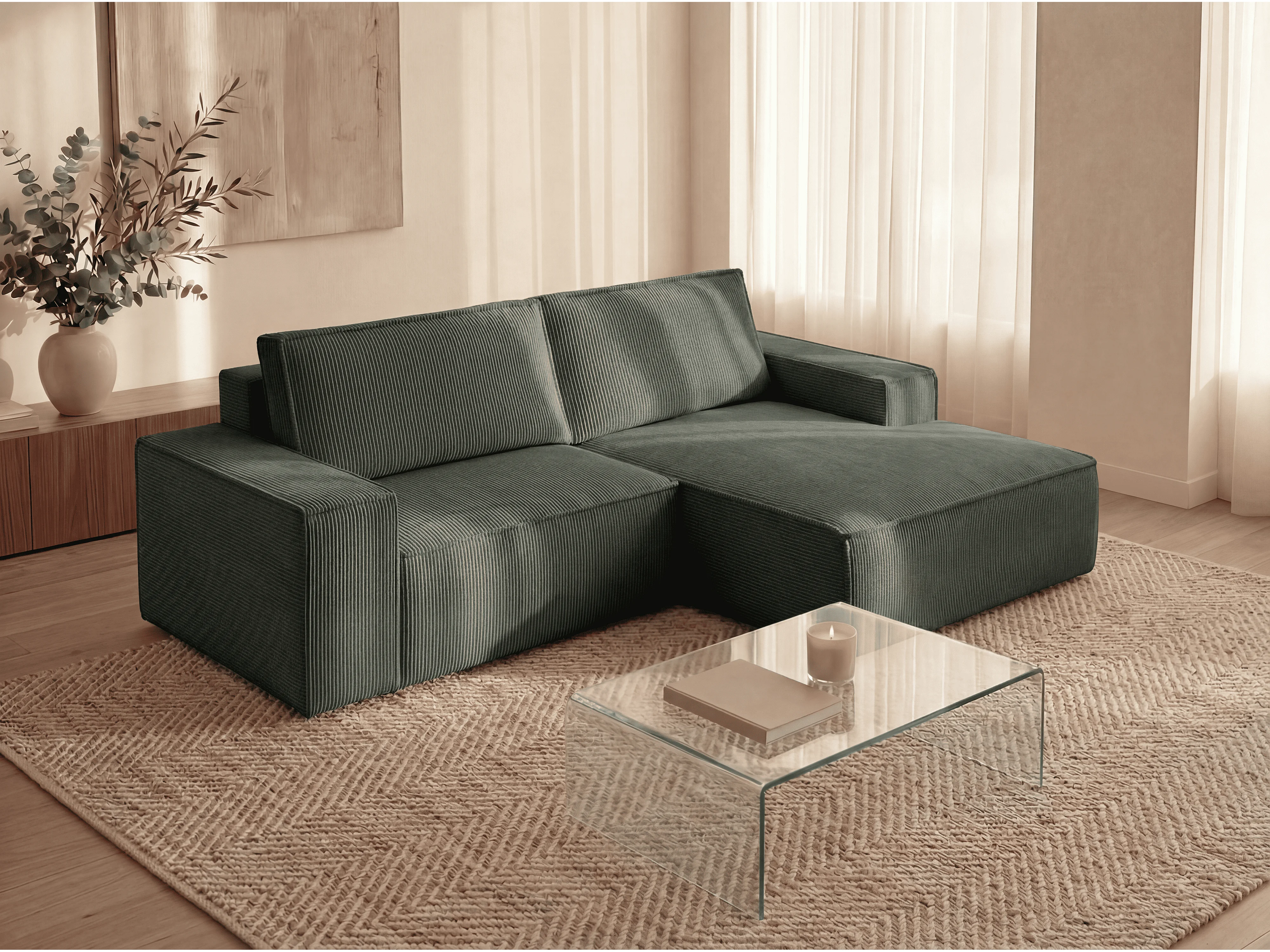 Petit canapé d'angle droit convertible en velours côtelé vert sapin AMELIA