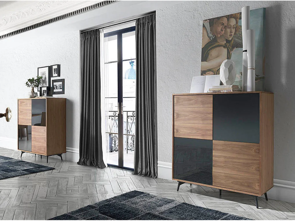 Buffet haut en verre noir effet miroir, noyer et acier noir 3059 ANGEL CERDA