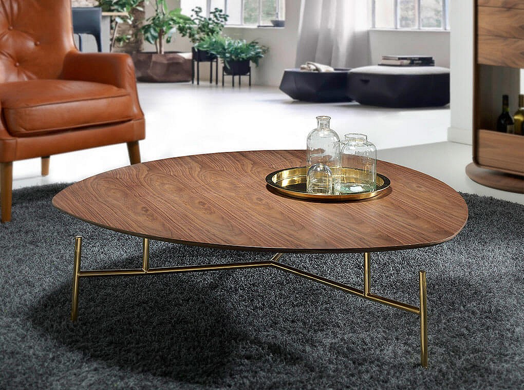 Table basse en bois de noyer et acier doré