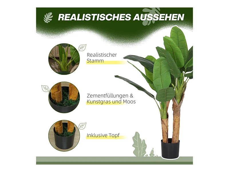 Arbre à banane artificiel 2 pièces, avec pot et mousse artificielle, plastique, vert (17x17x120 cm)