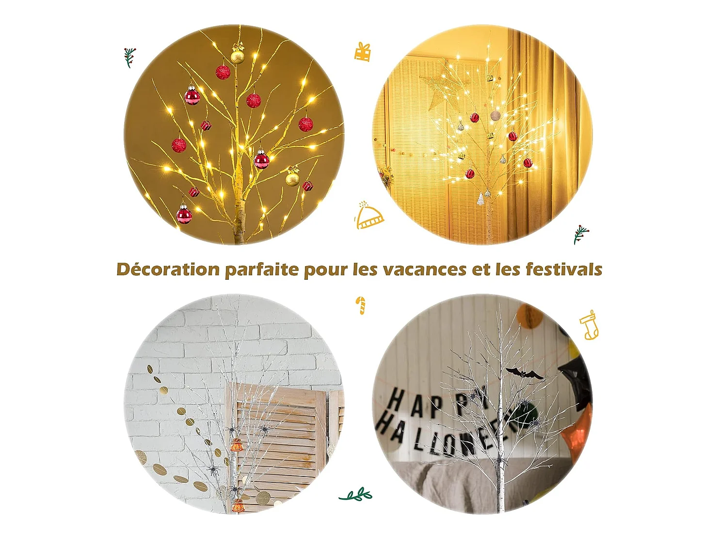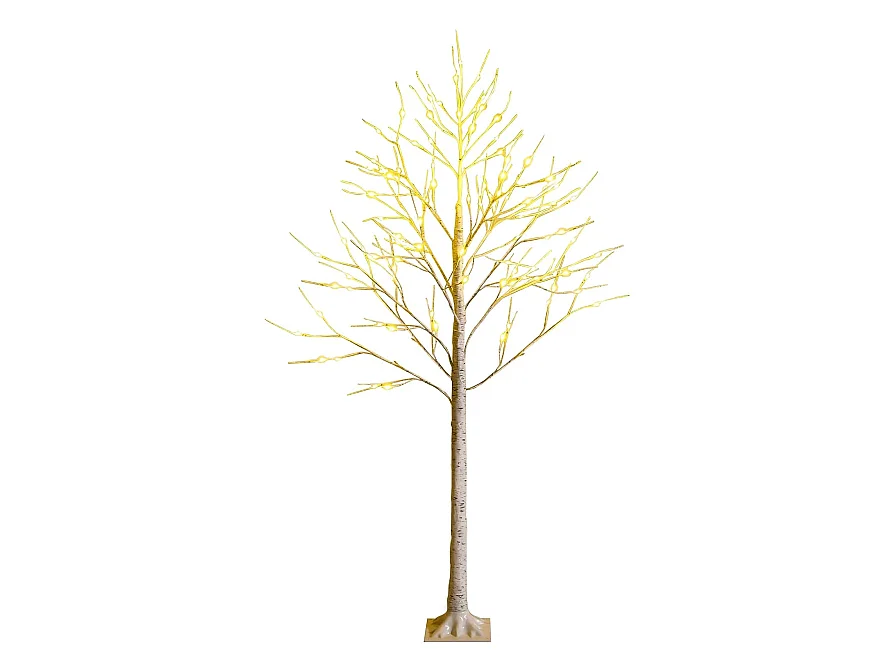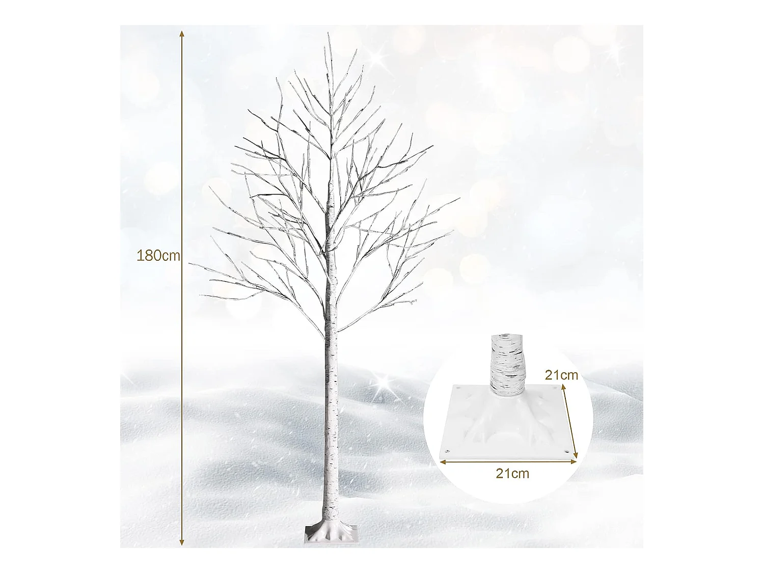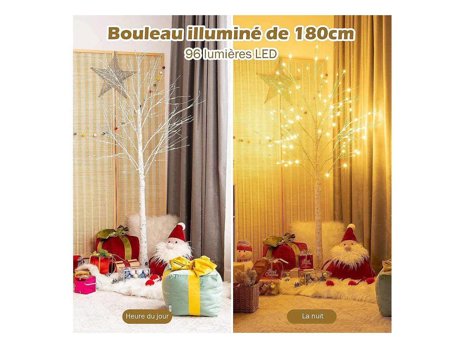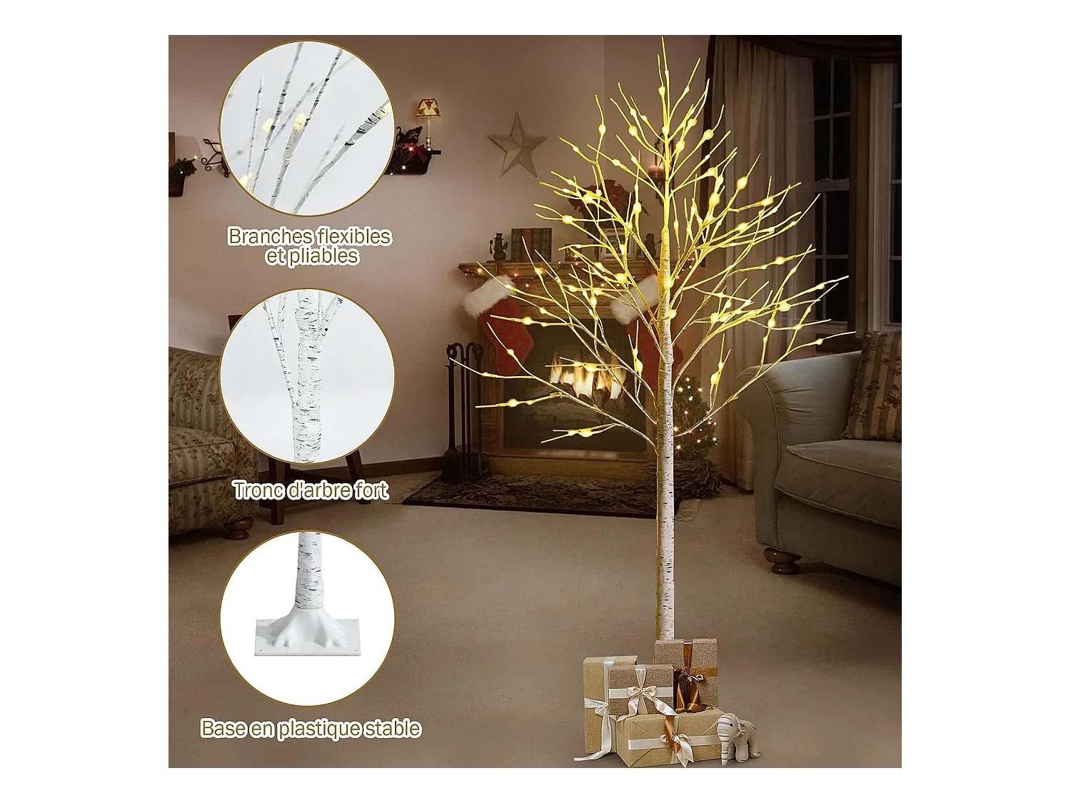 Arbre de noël bouleau blanc chaud artificiel 180cm avec 96 led lumineux base plastique décoration intérieur pour noël