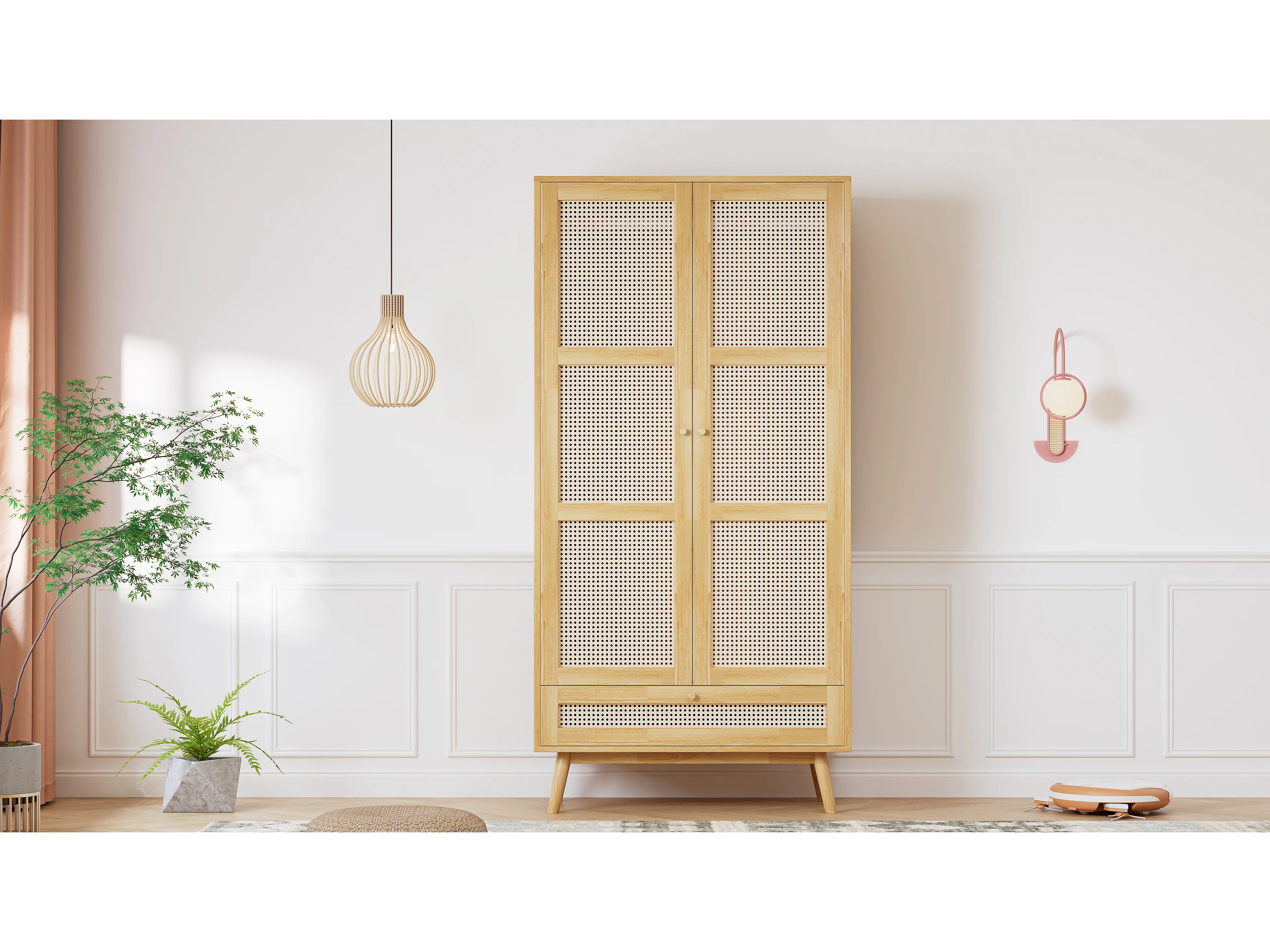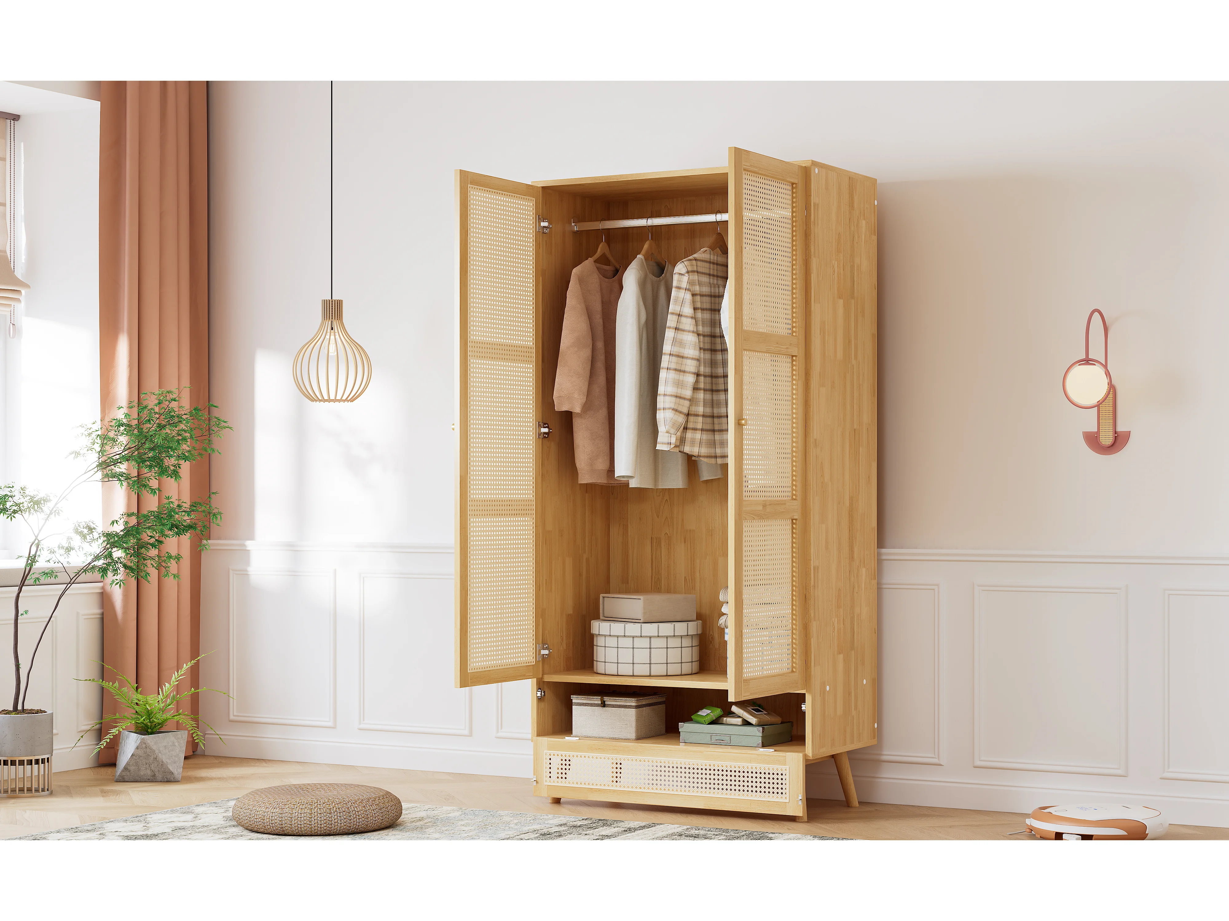 Armoire 2 portes avec barre à vêtements, design élégant avec rattan PE et couvercle rabattable, panneaux de particules + rattan PE,(90x45x183cm)