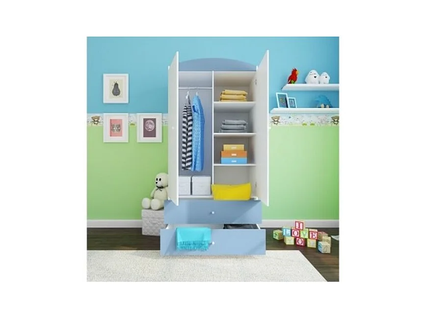 Armoire pour enfant - 90 x 45 x 180 cm - avec 2 portes + tringle à vêtements + 2 tiroirs - aggloméré - bleu