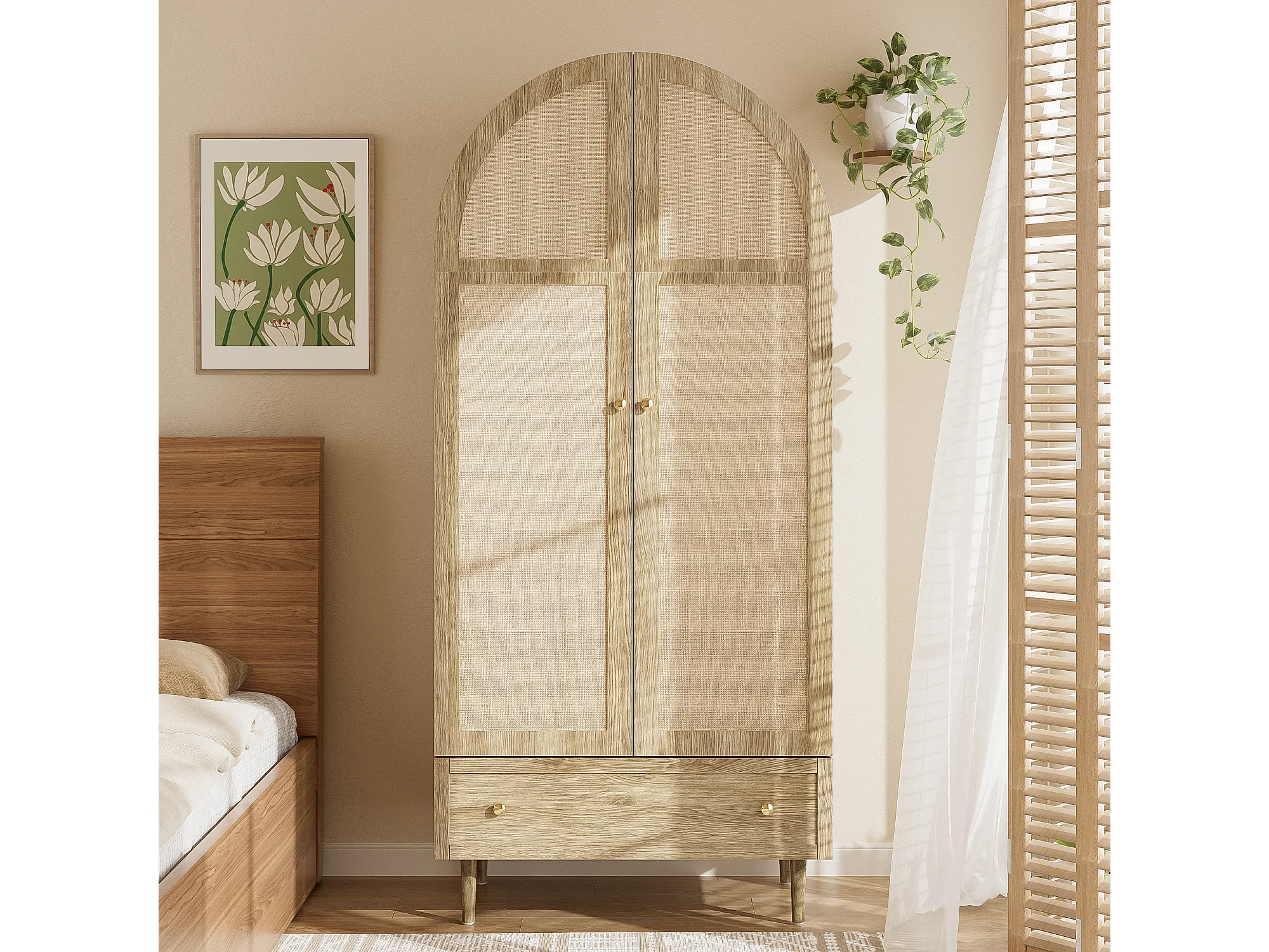 Armoire 85.5x52x180.5cm - Étagères et tringles à vêtements réglables - avec 2 portes en rotin et 1 tiroir - style campagnard - Blanc + Naturel