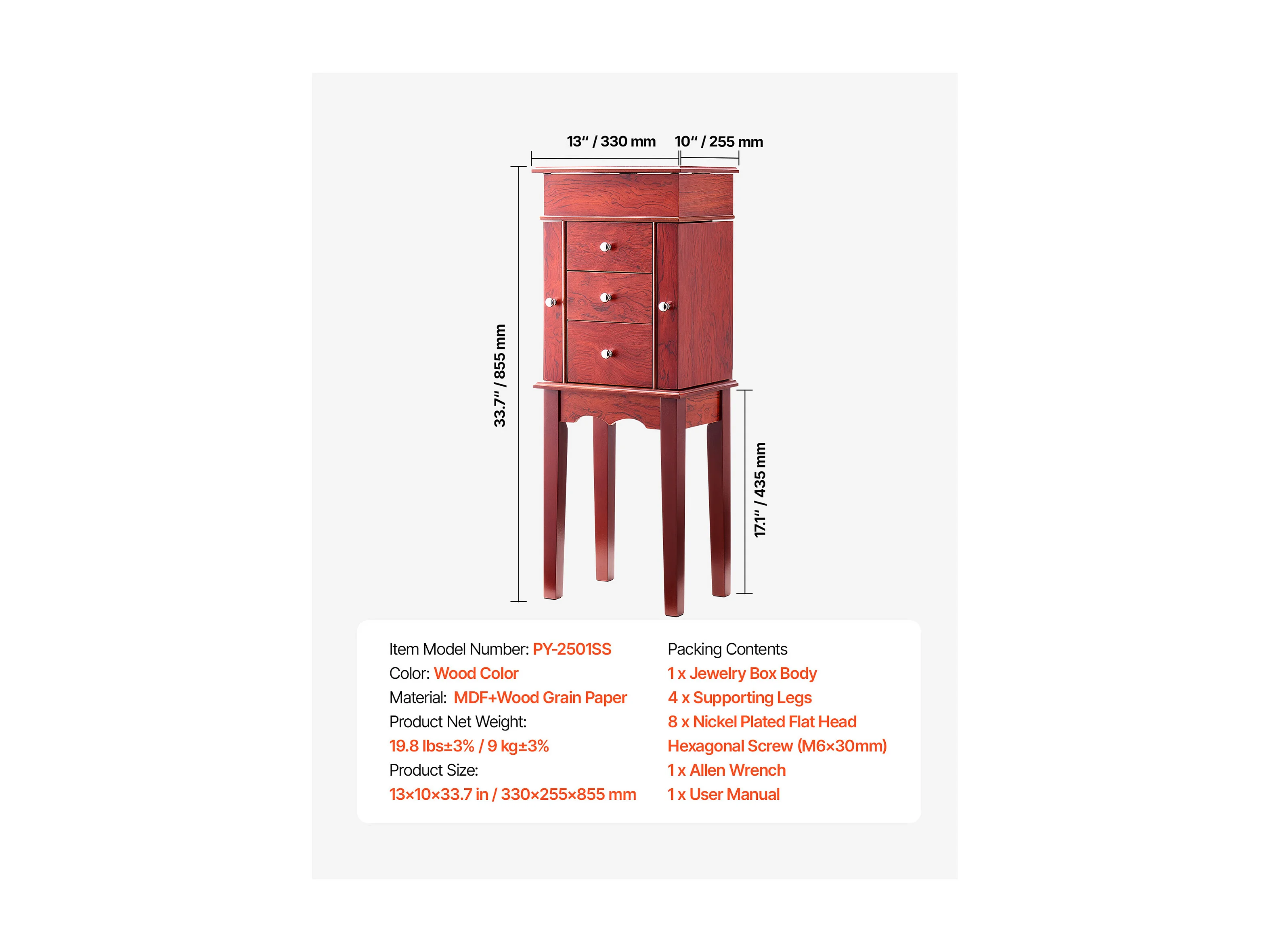 Armoire à Bijoux SucceBuy sur Pied en Bois, Coffre Rangement à Bijoux avec 3 Tiroirs, Miroir Rabattable, 4 Compartiments Rangement Supérieurs, Poignées