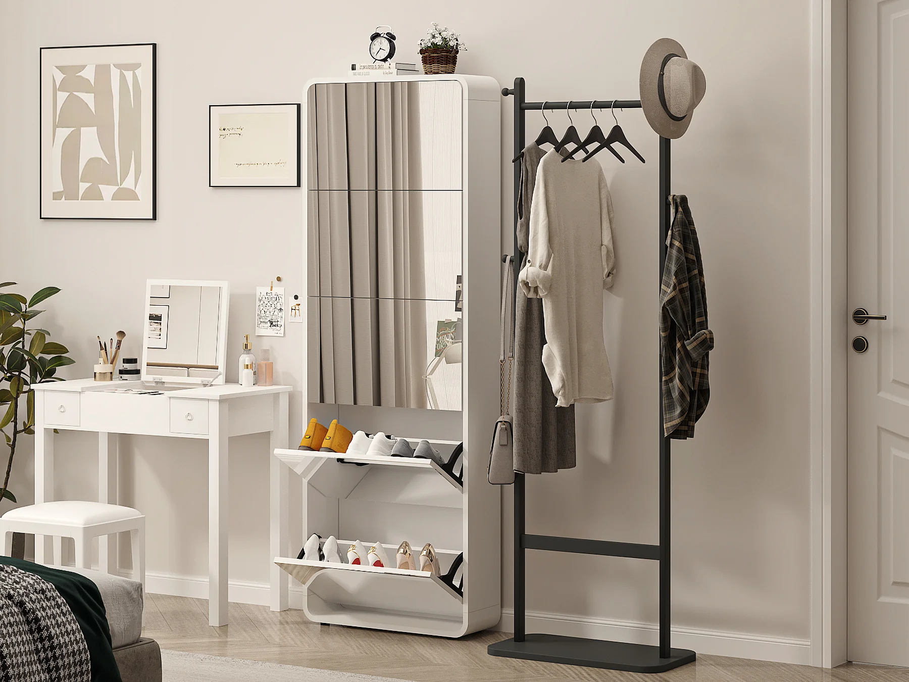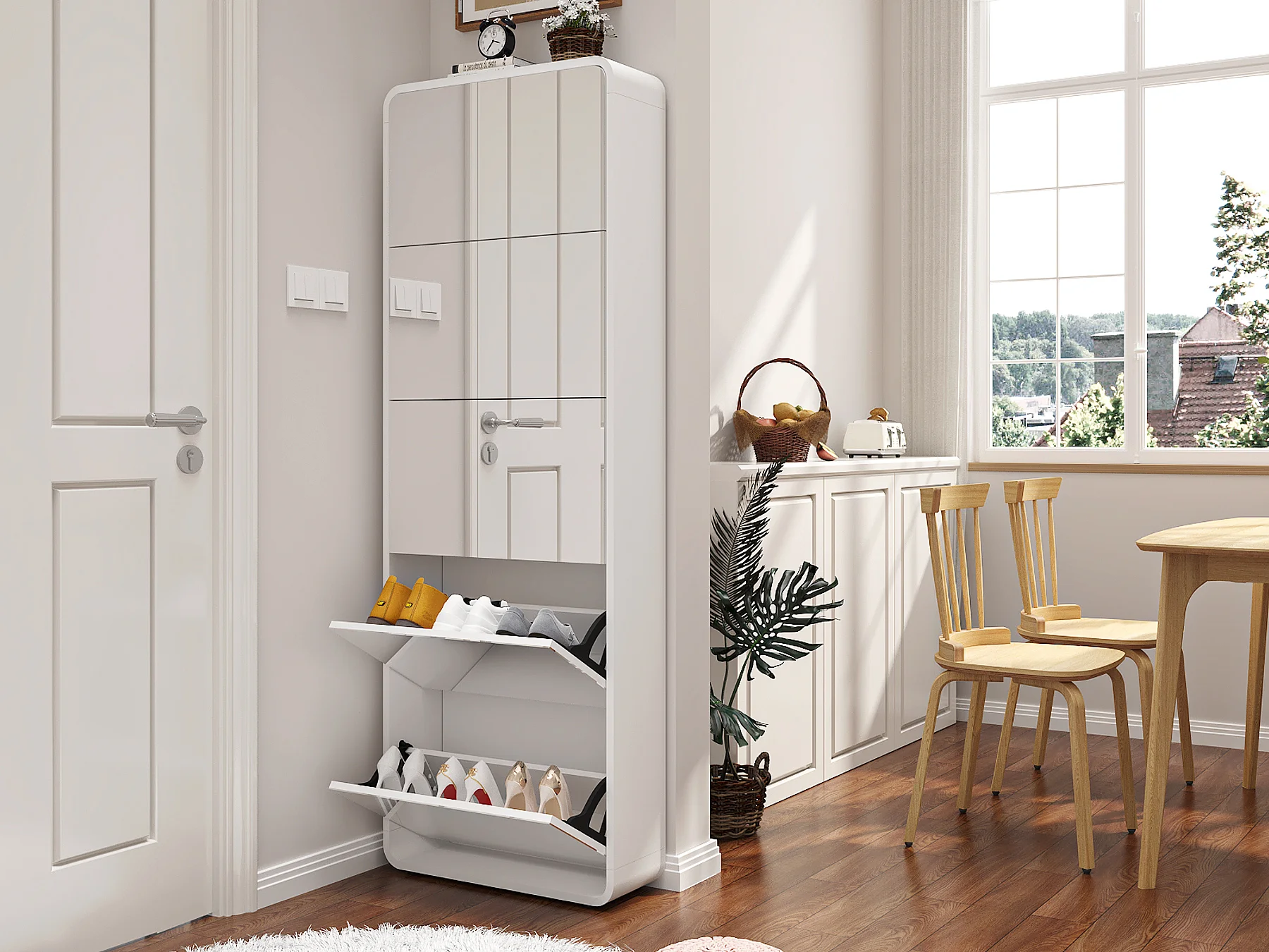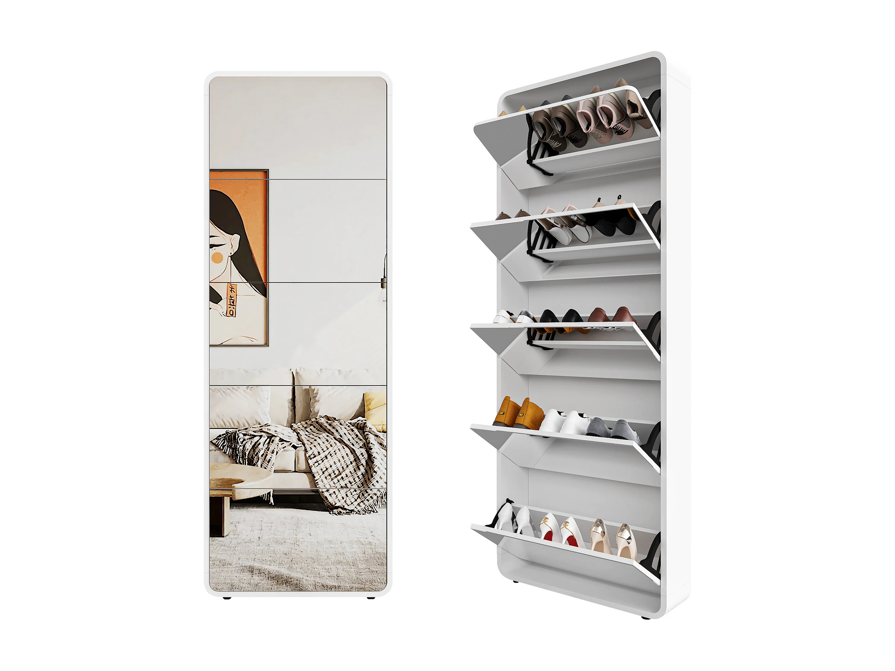 Armoire à chaussures avec miroir, 5 tiroirs flip, design courbé, MDF blanc (63x19.6x176.5 cm)