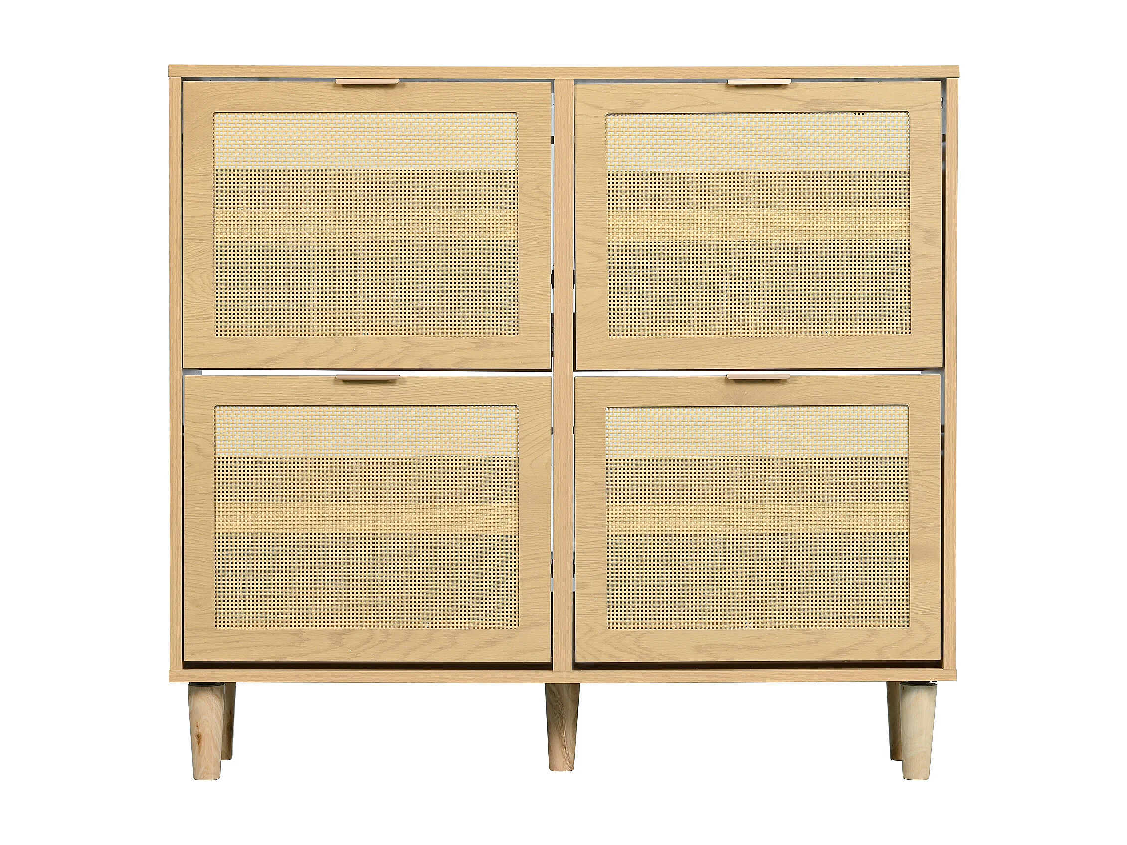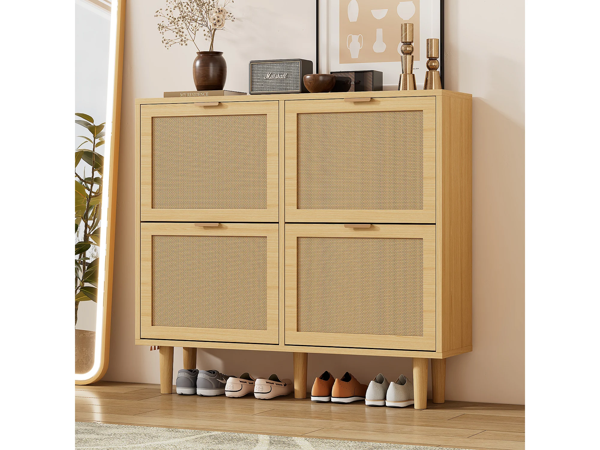Armoire à chaussures en rotin naturel, 4 tiroirs, design en bois, avec 2 portes et étagères ajustables (100x25x90 cm)