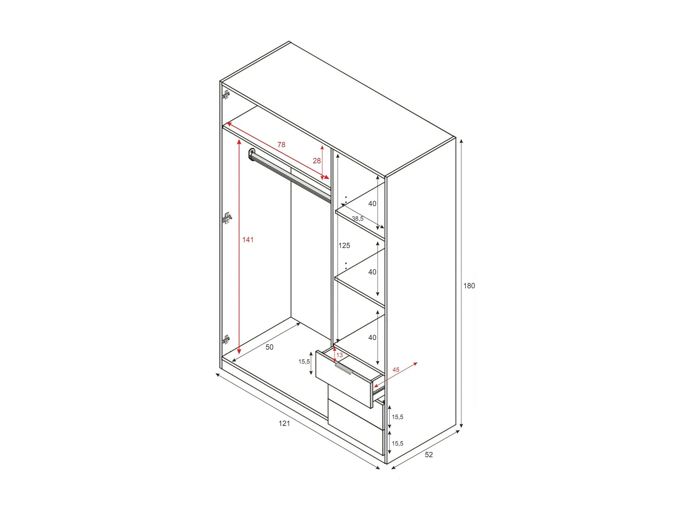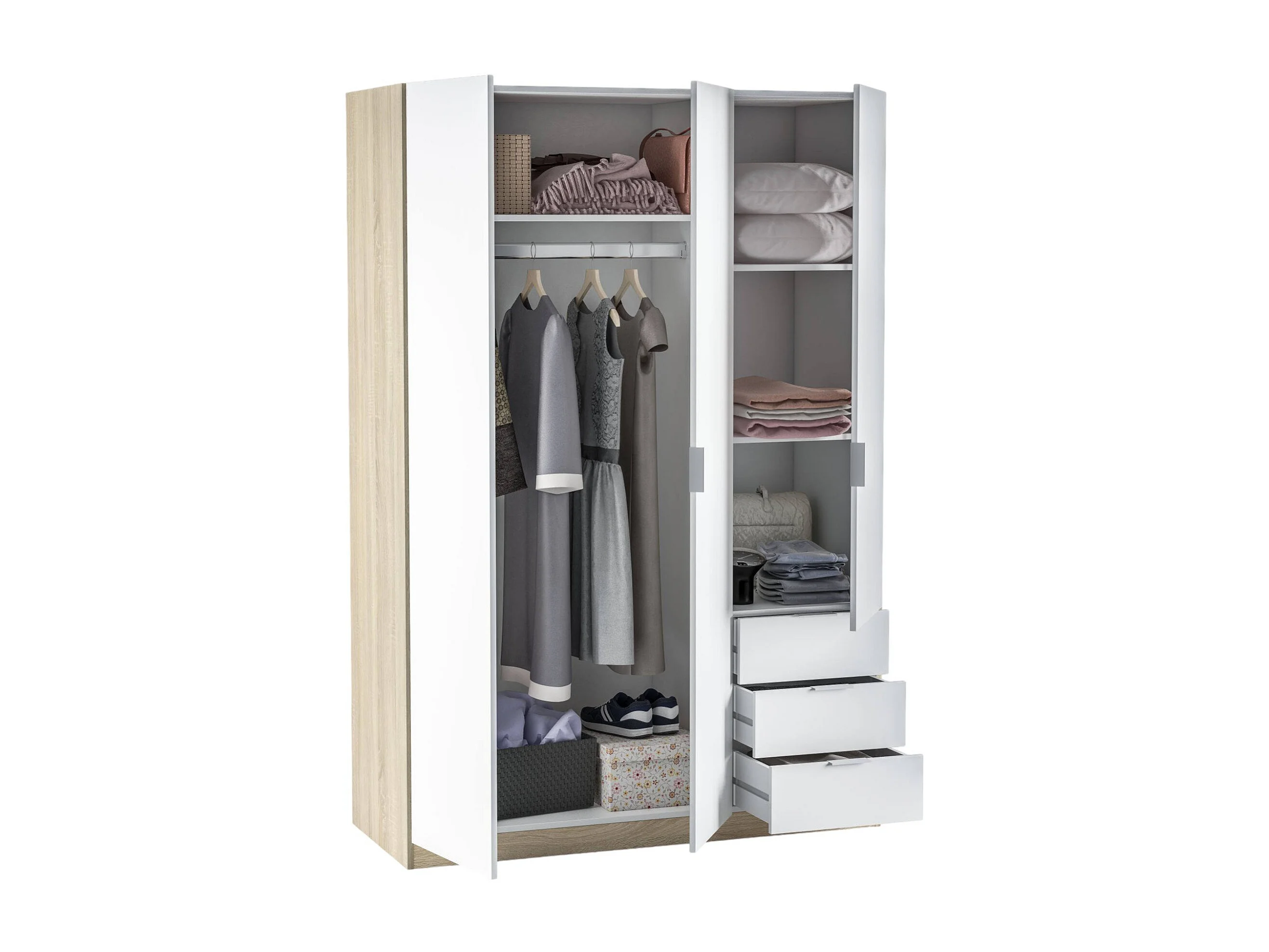Armoire Allentown, Armoire de Chambre avec 3 Portes et 3 Tiroirs, Armoire avec Barre de Suspension et 3 Étagères, 121x52h180 cm, Blanc et Chêne