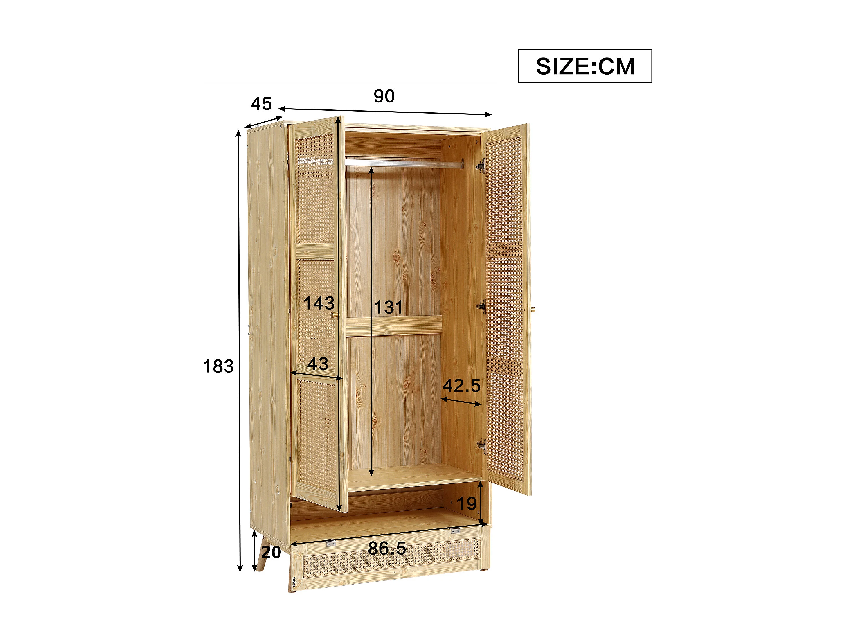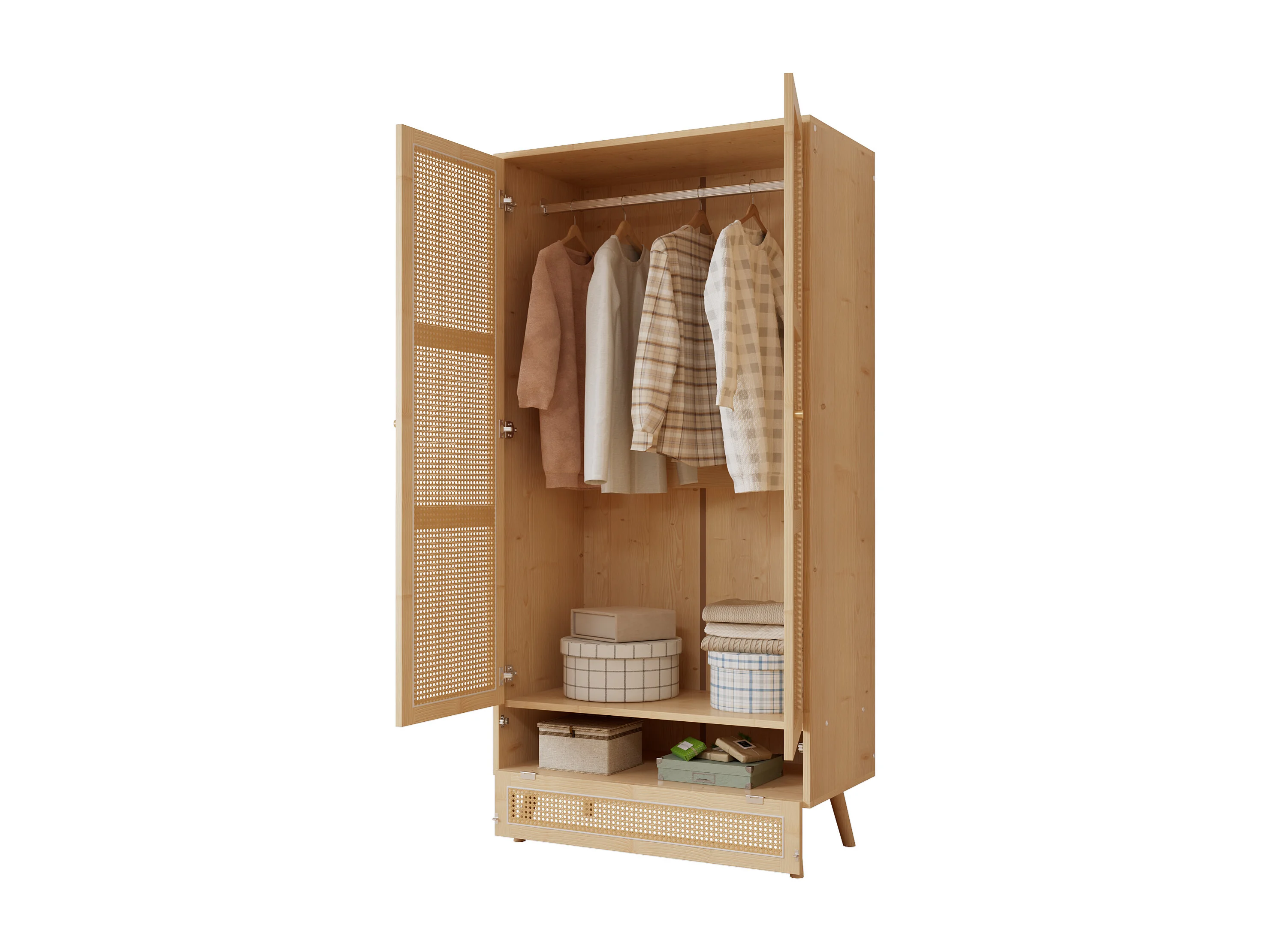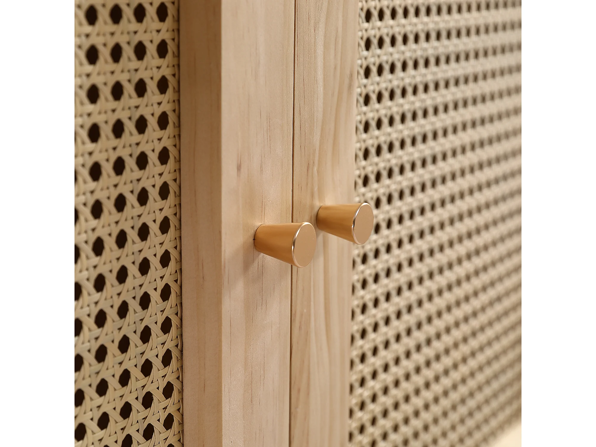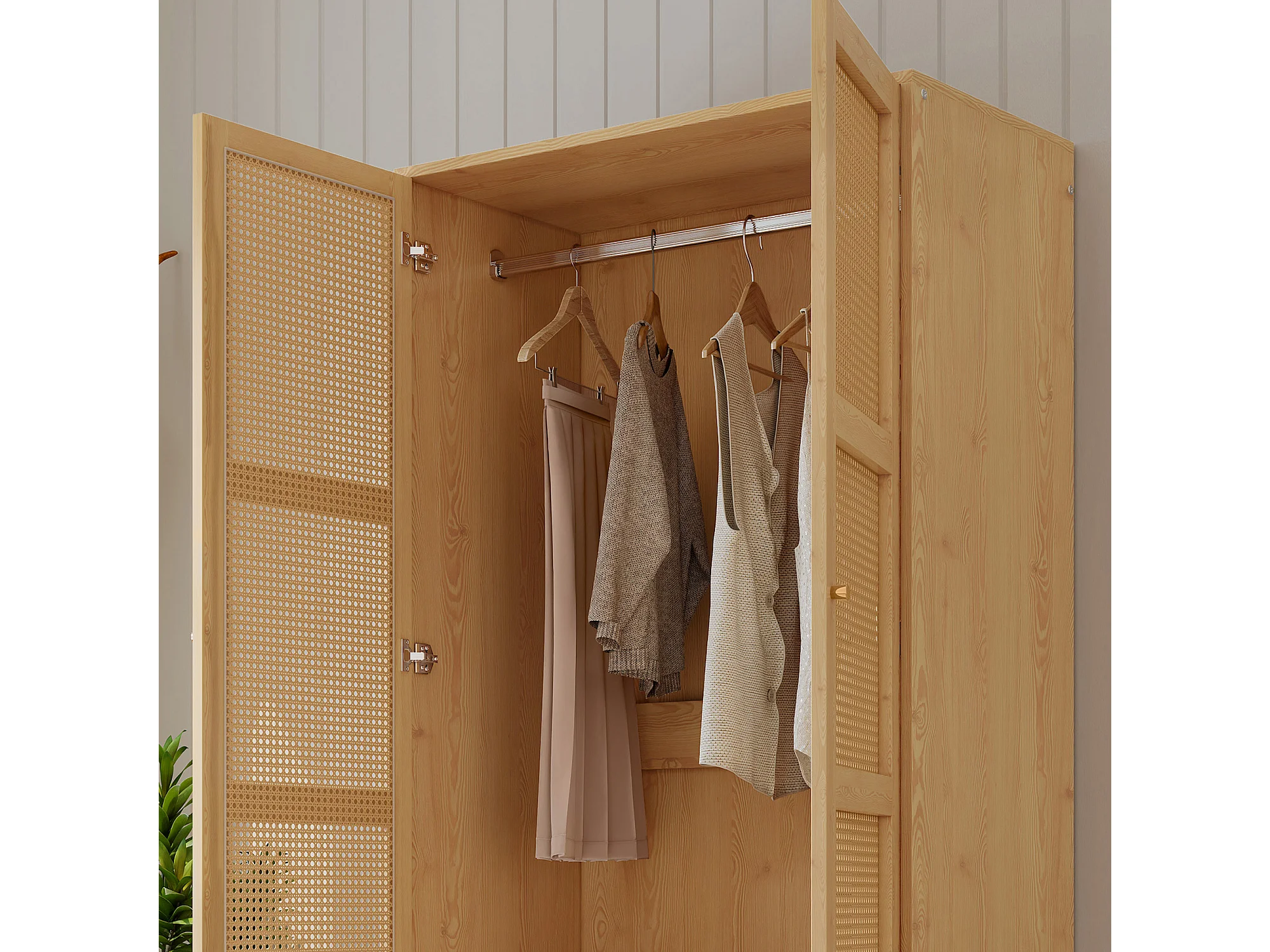 Armoire avec tringle - 2 portes grillagées en rotin et 1 compartiment abattant - Naturel