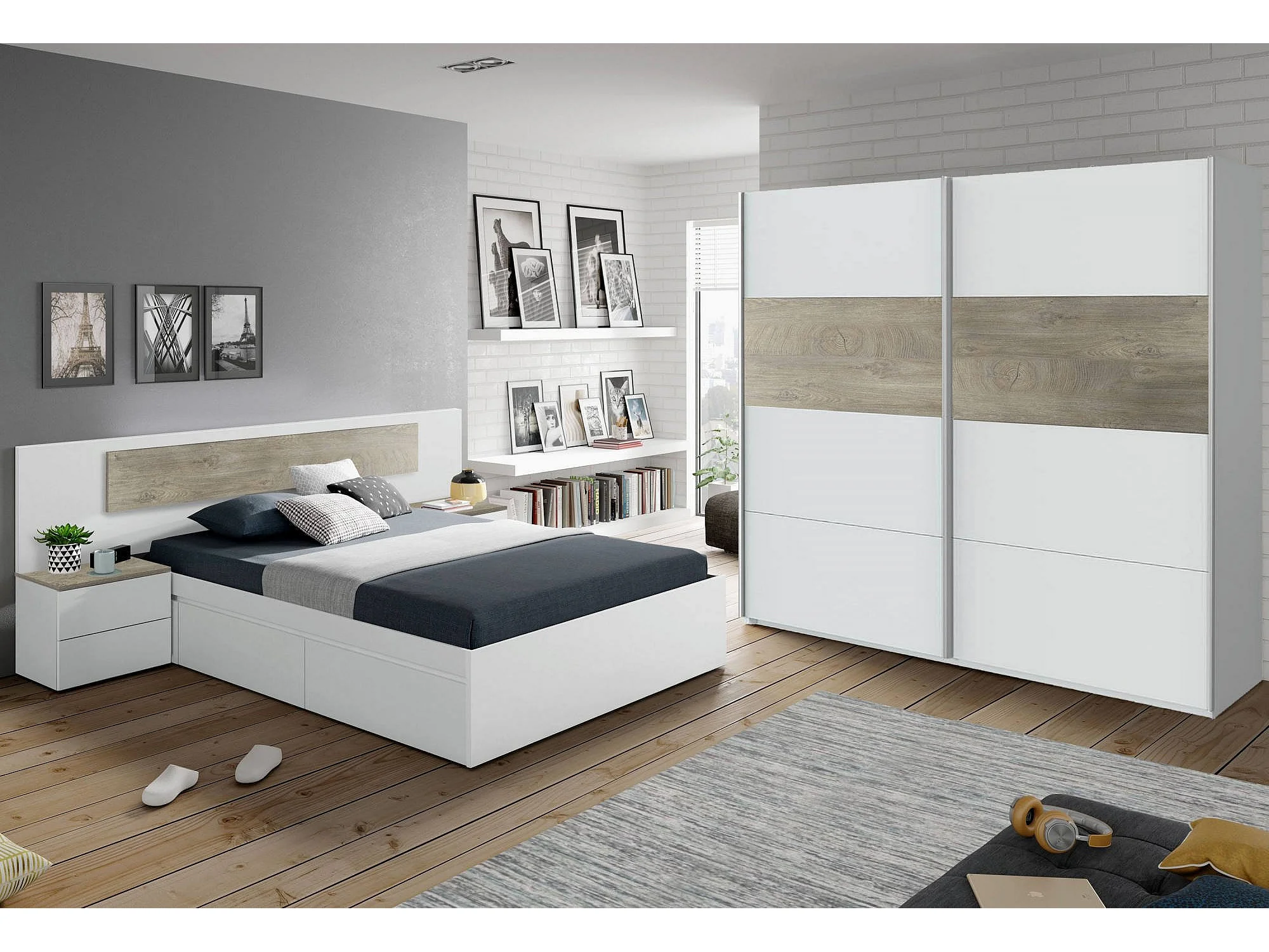 Armoire Dcioff, Armoire de chambre avec 2 portes coulissantes, Armoire avec tringle à vêtements et 3 étagères, 180X60h200 cm, Blanc et Chêne