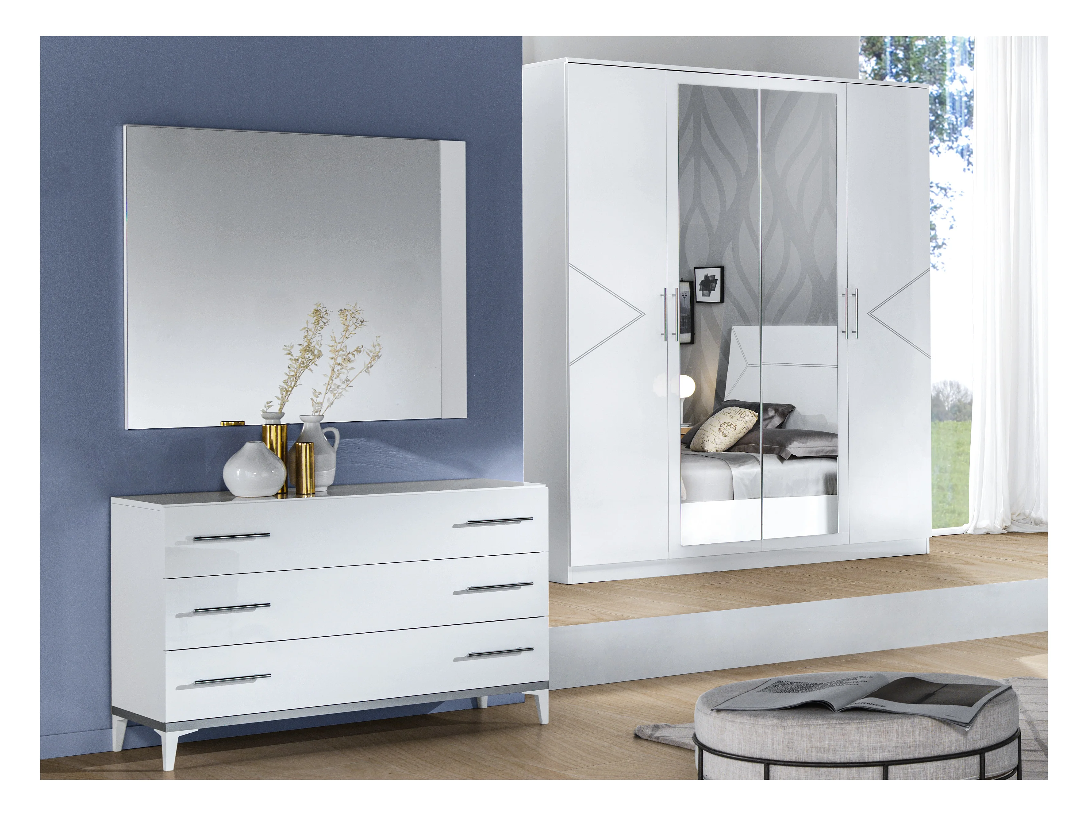 Armoire de chambre design 4 portes battantes bois blanc laqué et métal argenté Diamanto 182cm