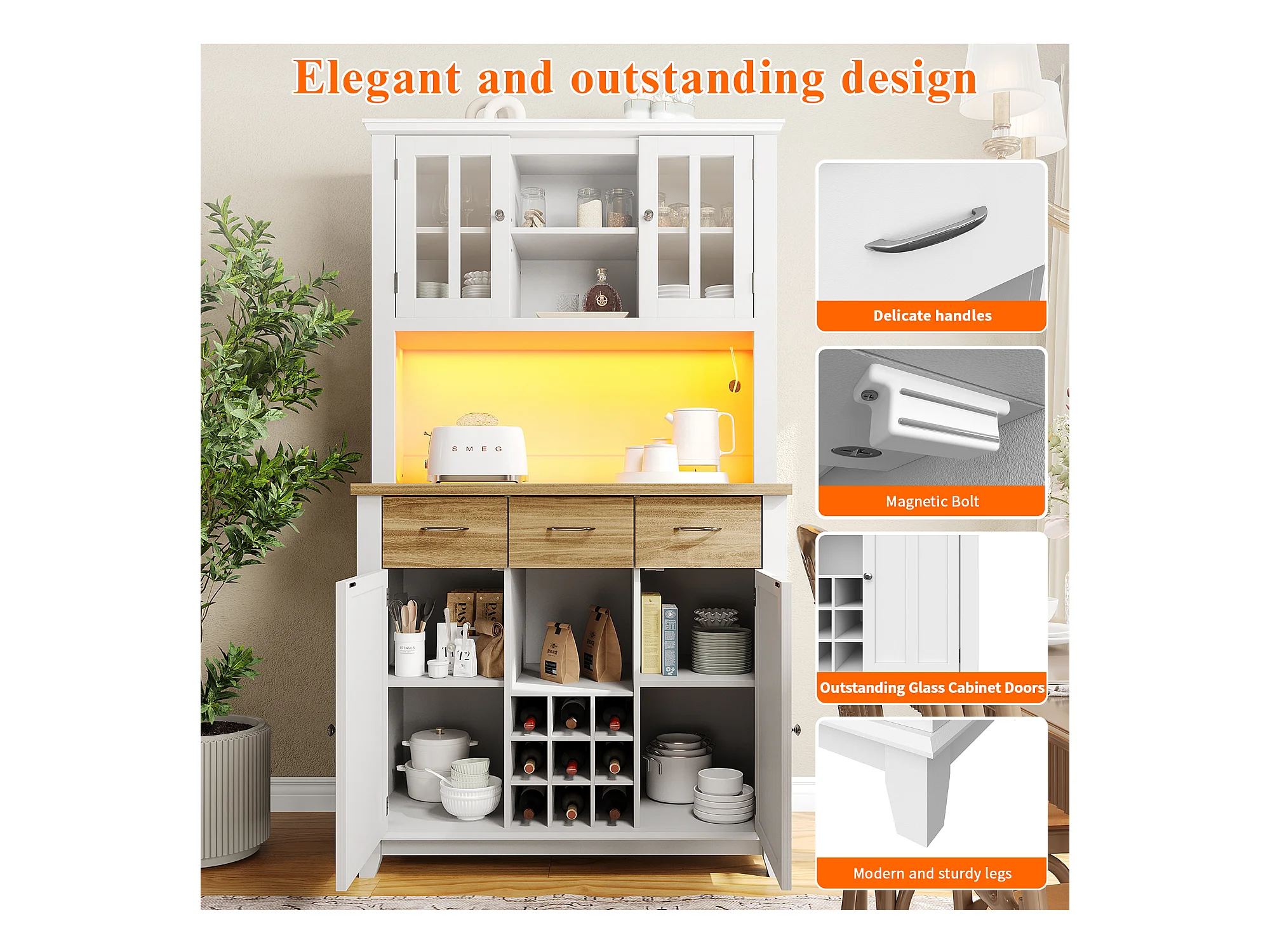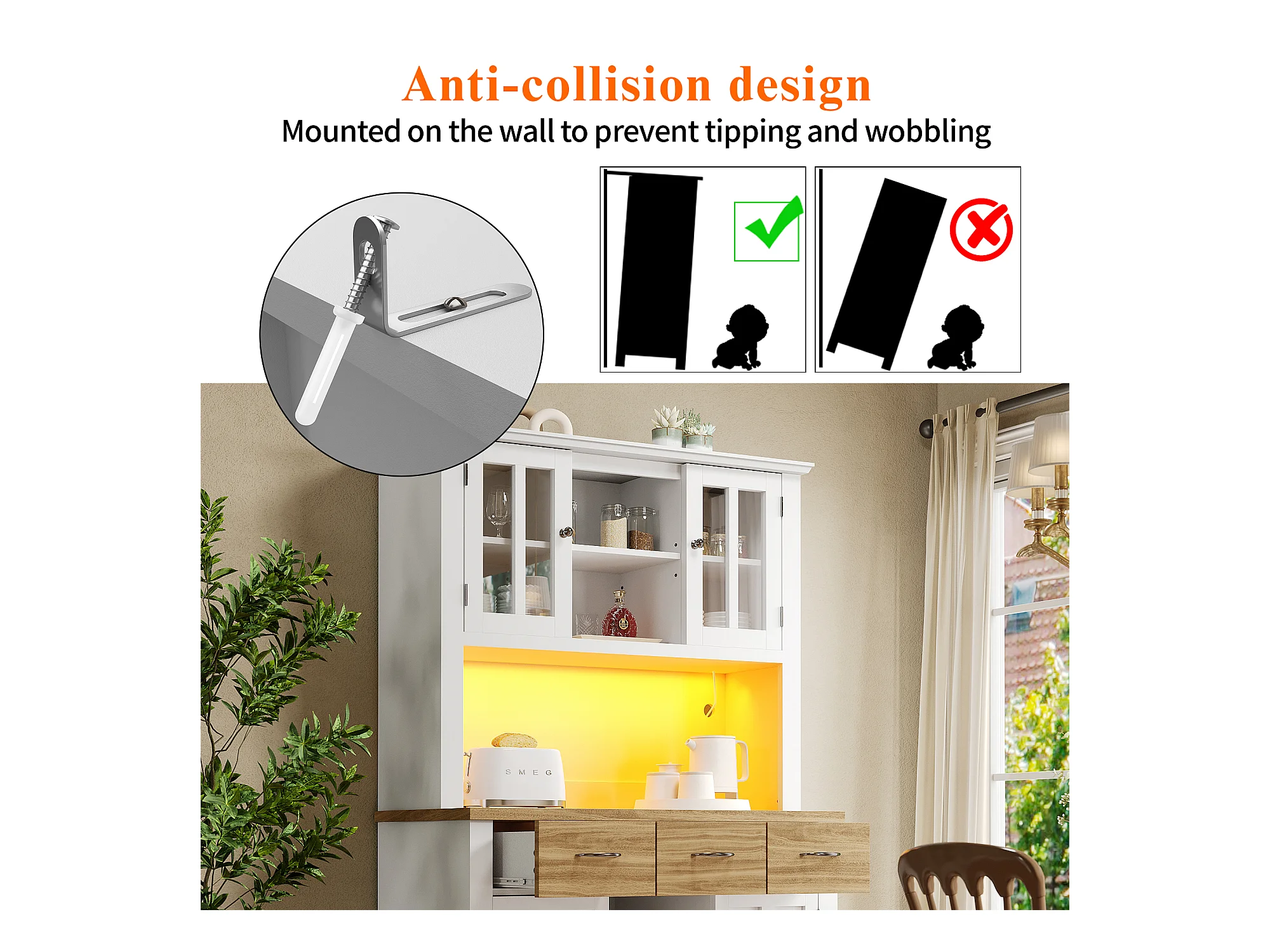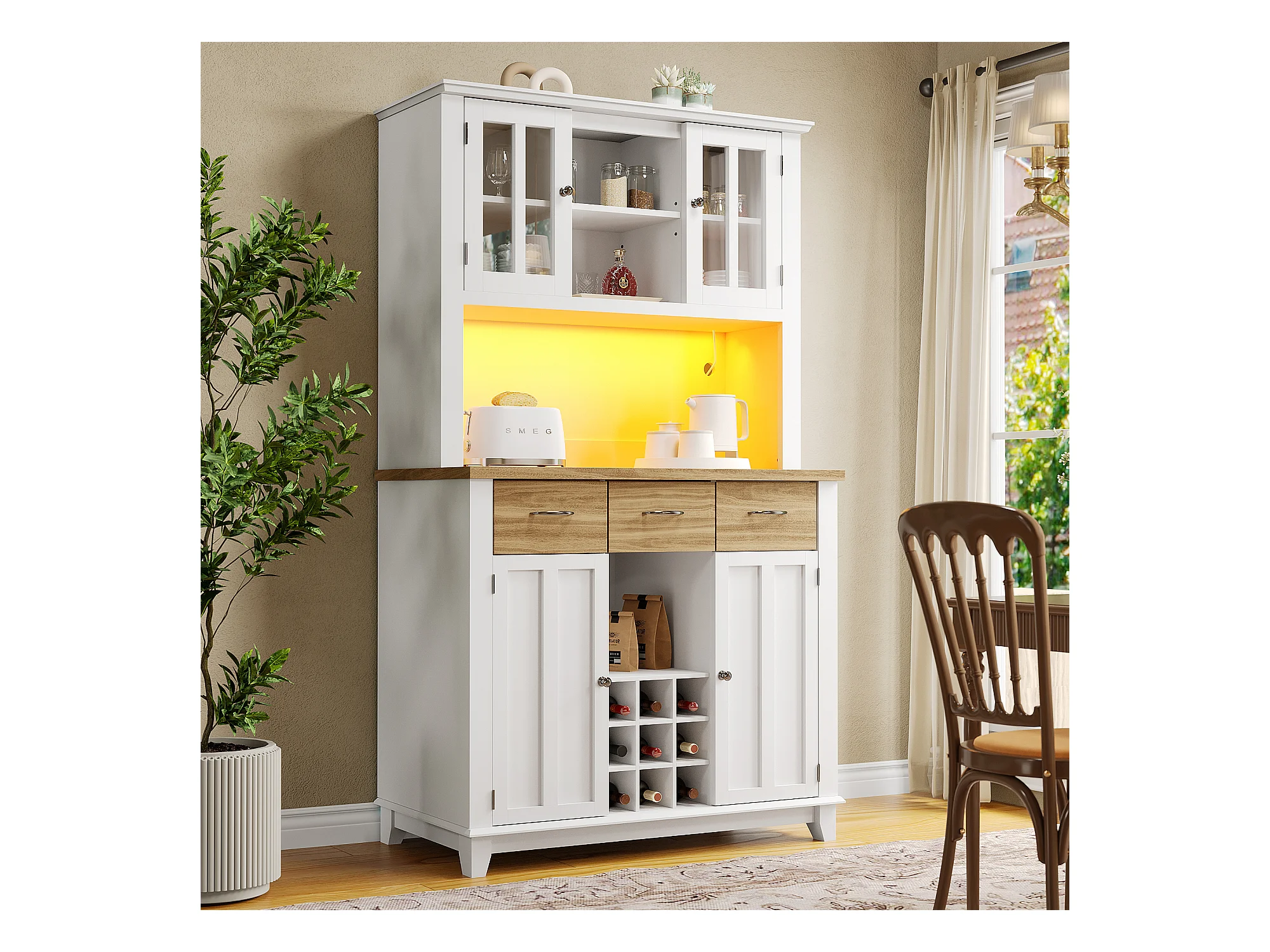 Armoire de cuisine avec éclairage LED, rangement spacieux, MDF, blanc (106x40x179.5 cm)