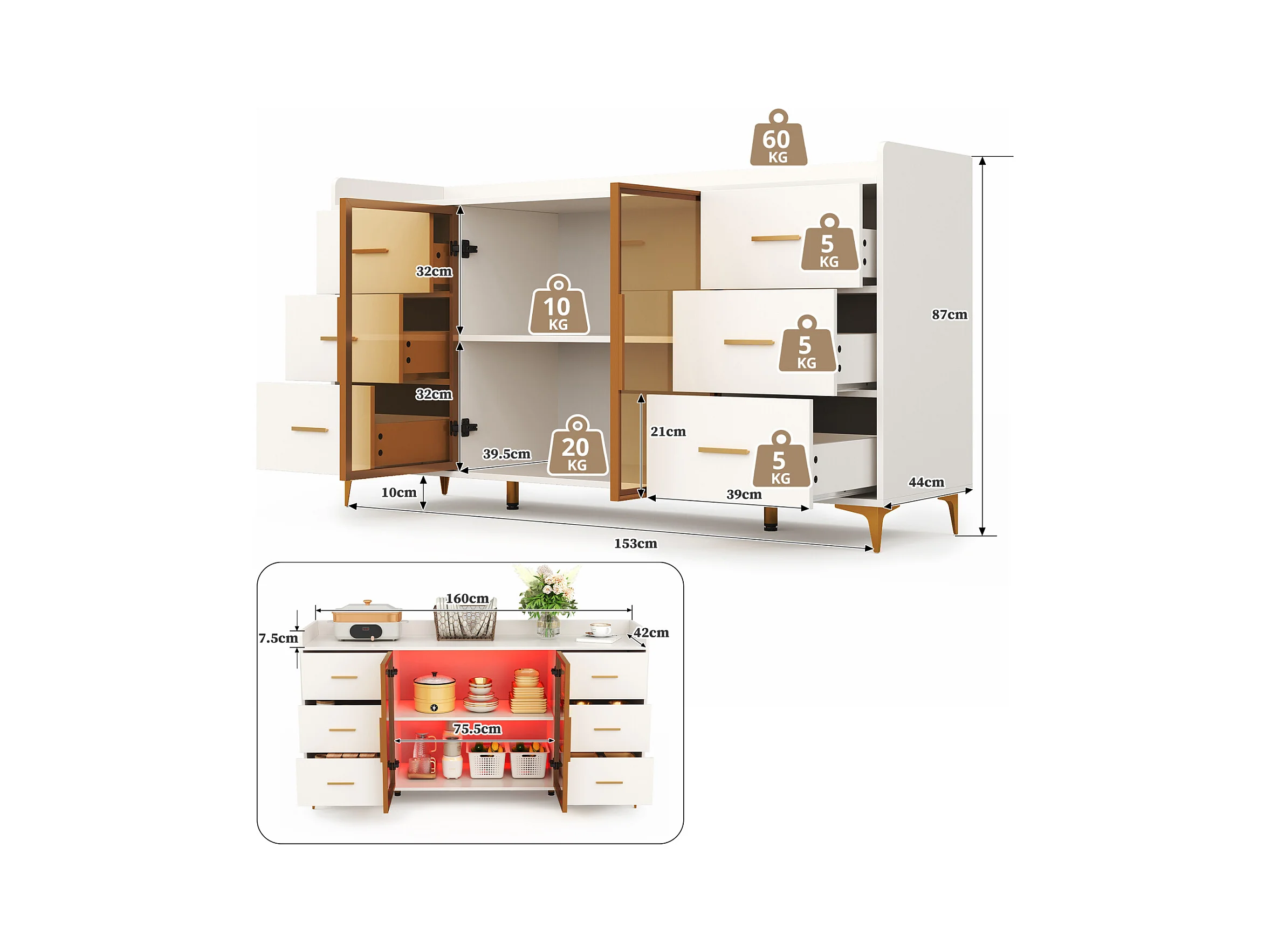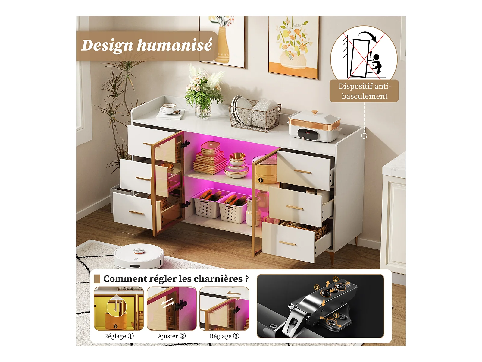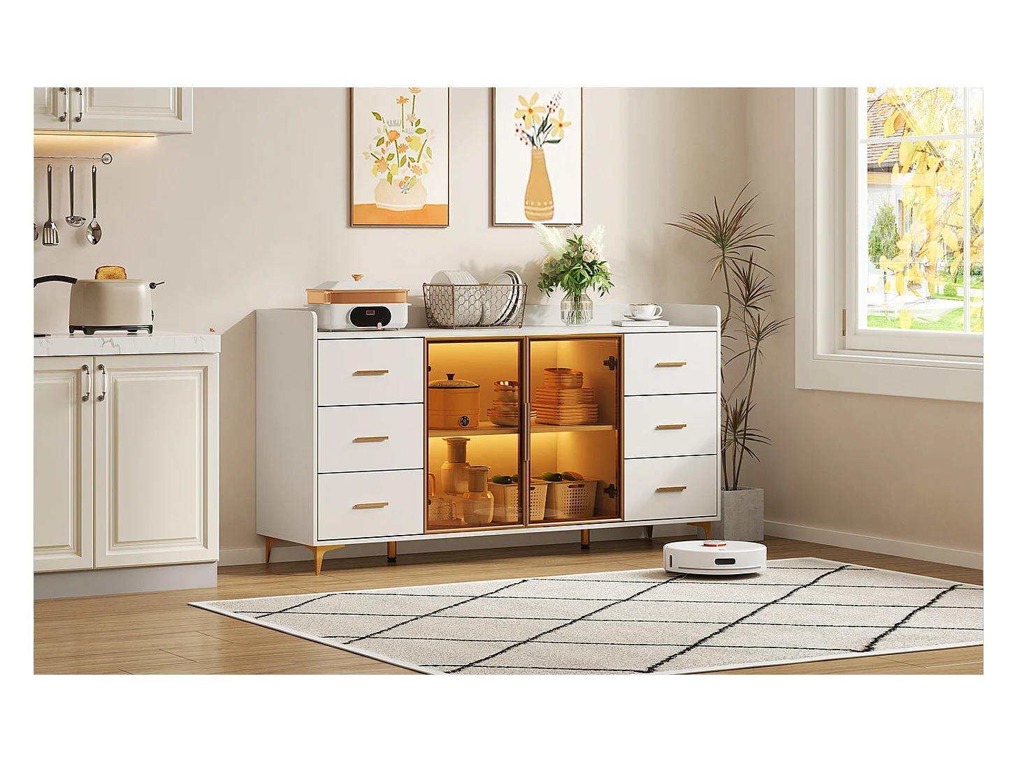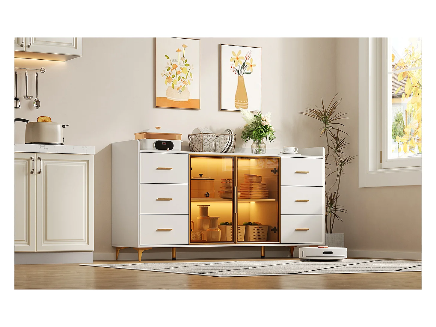 Armoire de cuisine moderne blanche 160x44x87 cm, 6 tiroirs portes en verre, LED, poignées métalliques, idéal cuisine, salon, chambre