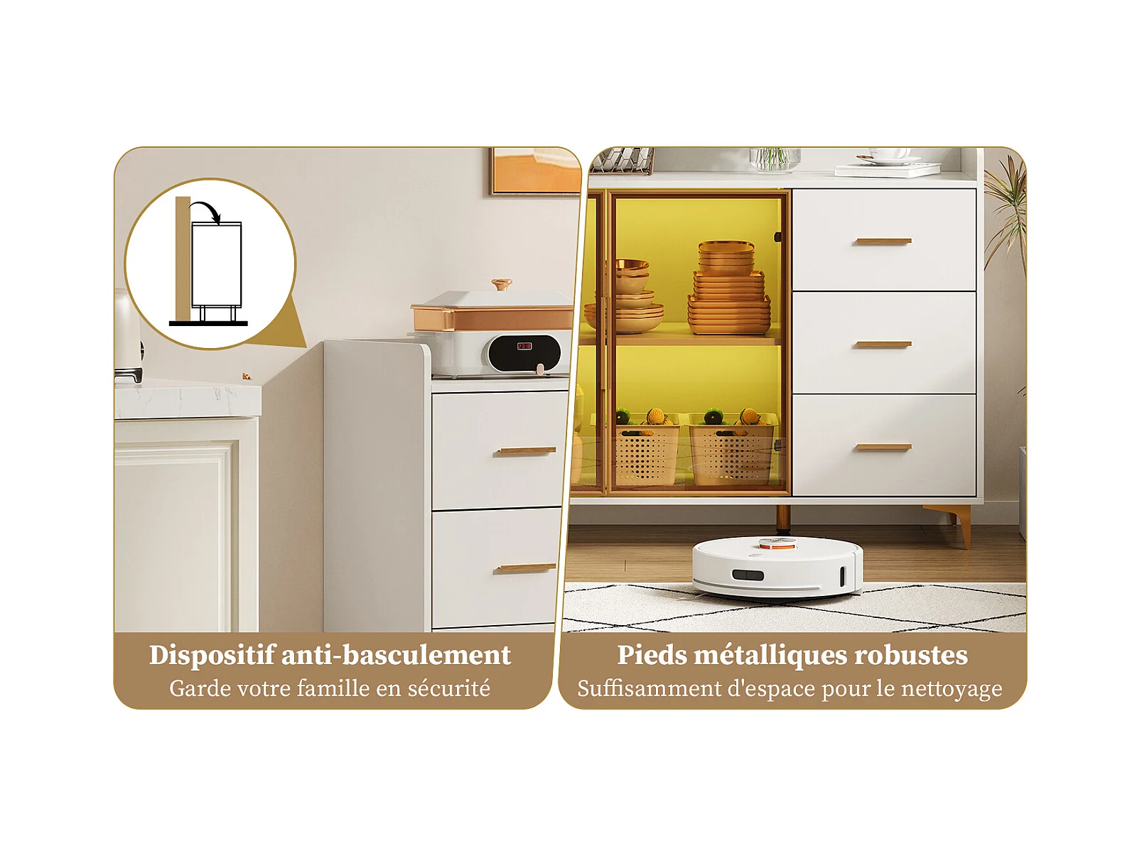 Buffet-bar avec LED et prises – Grand meuble de cuisine avec 2 tiroirs, portes style grange, étagères réglables – Bar rustique blanc