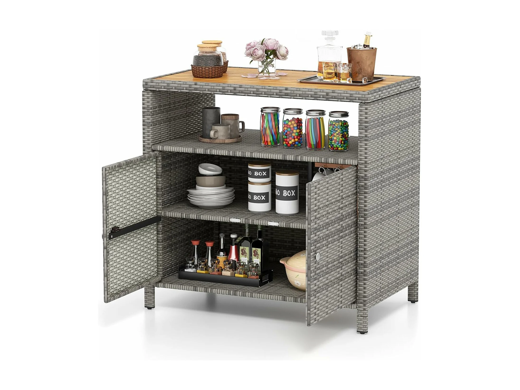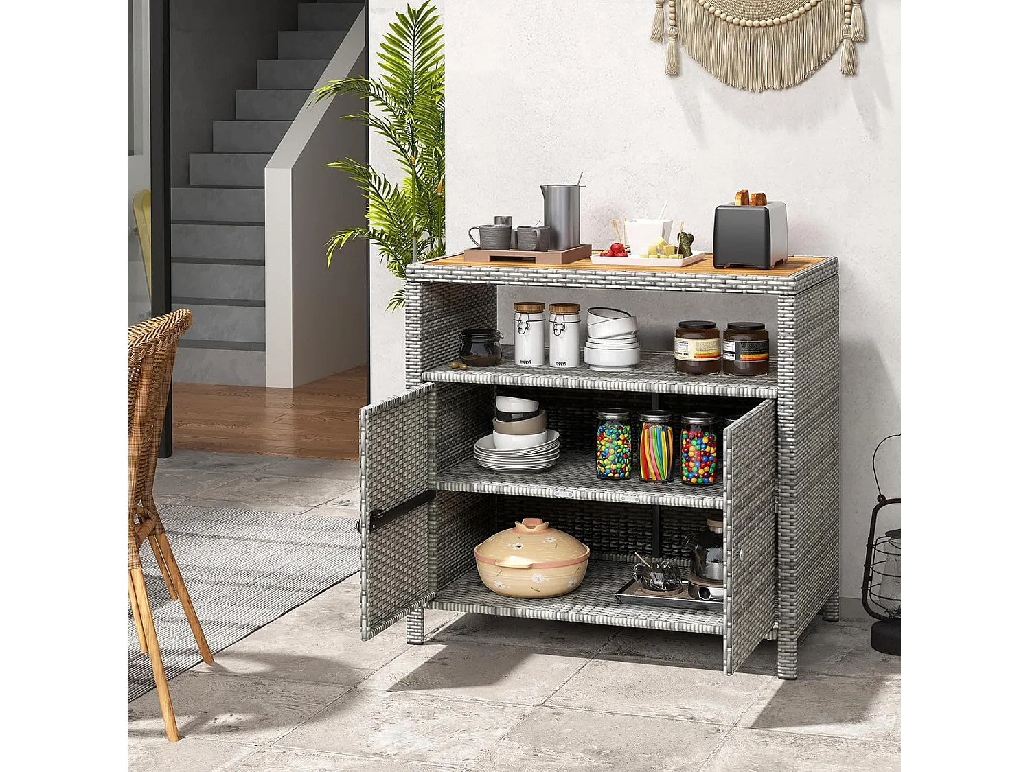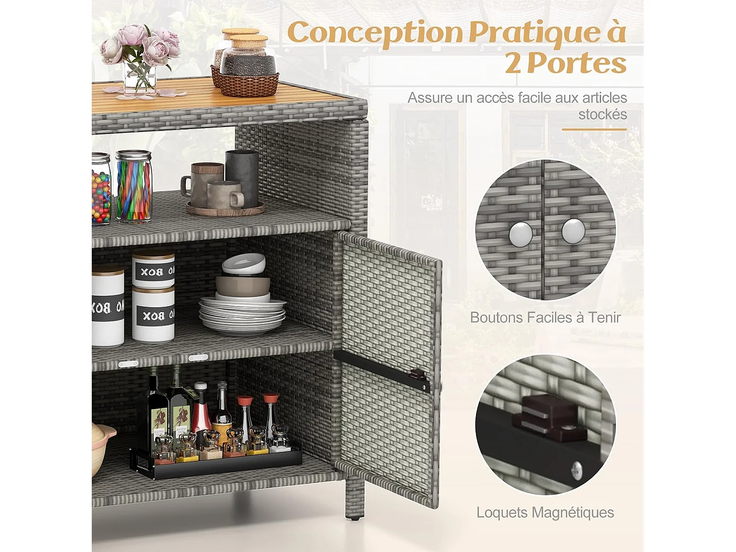Armoire de Rangement Exterieur en Rotin, Armoire de Jardin avec Plateau en Bois d'Acacia Compartiment Ouvert Buffet à 2 Portes, Organisateur de Rangement (Gris)
