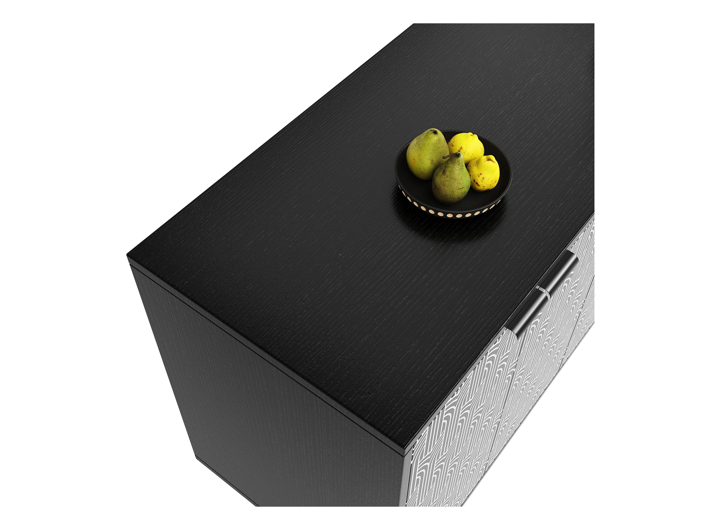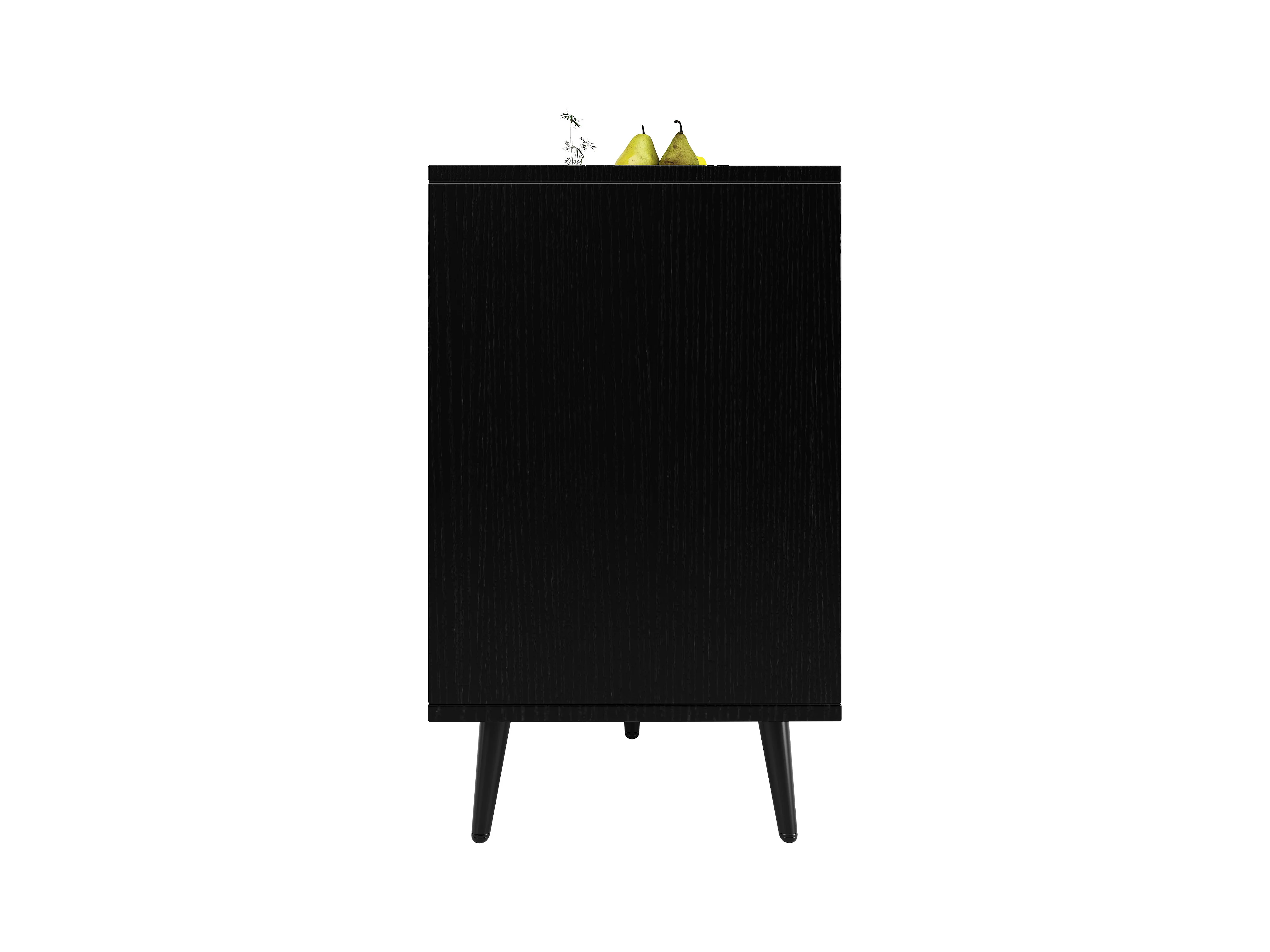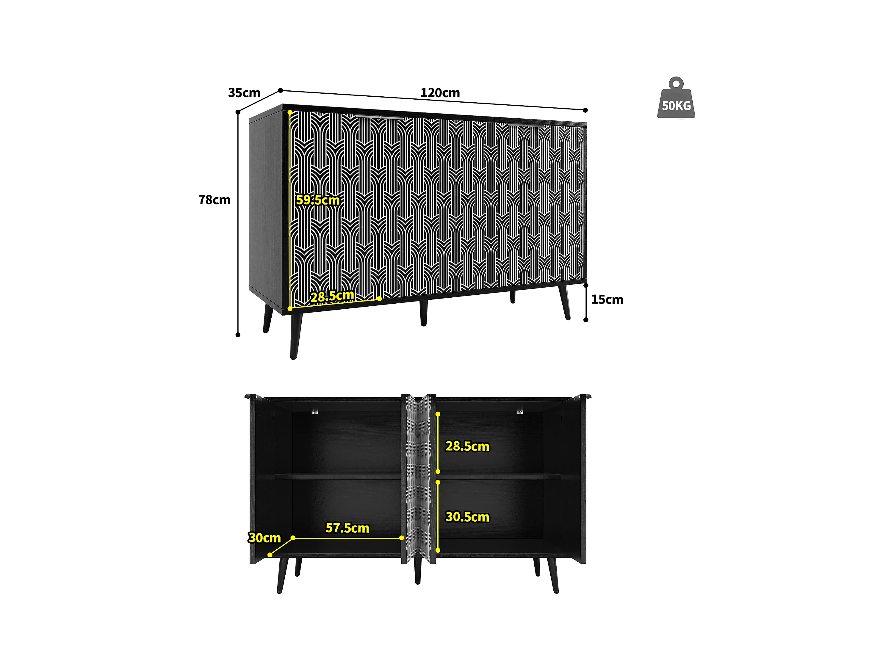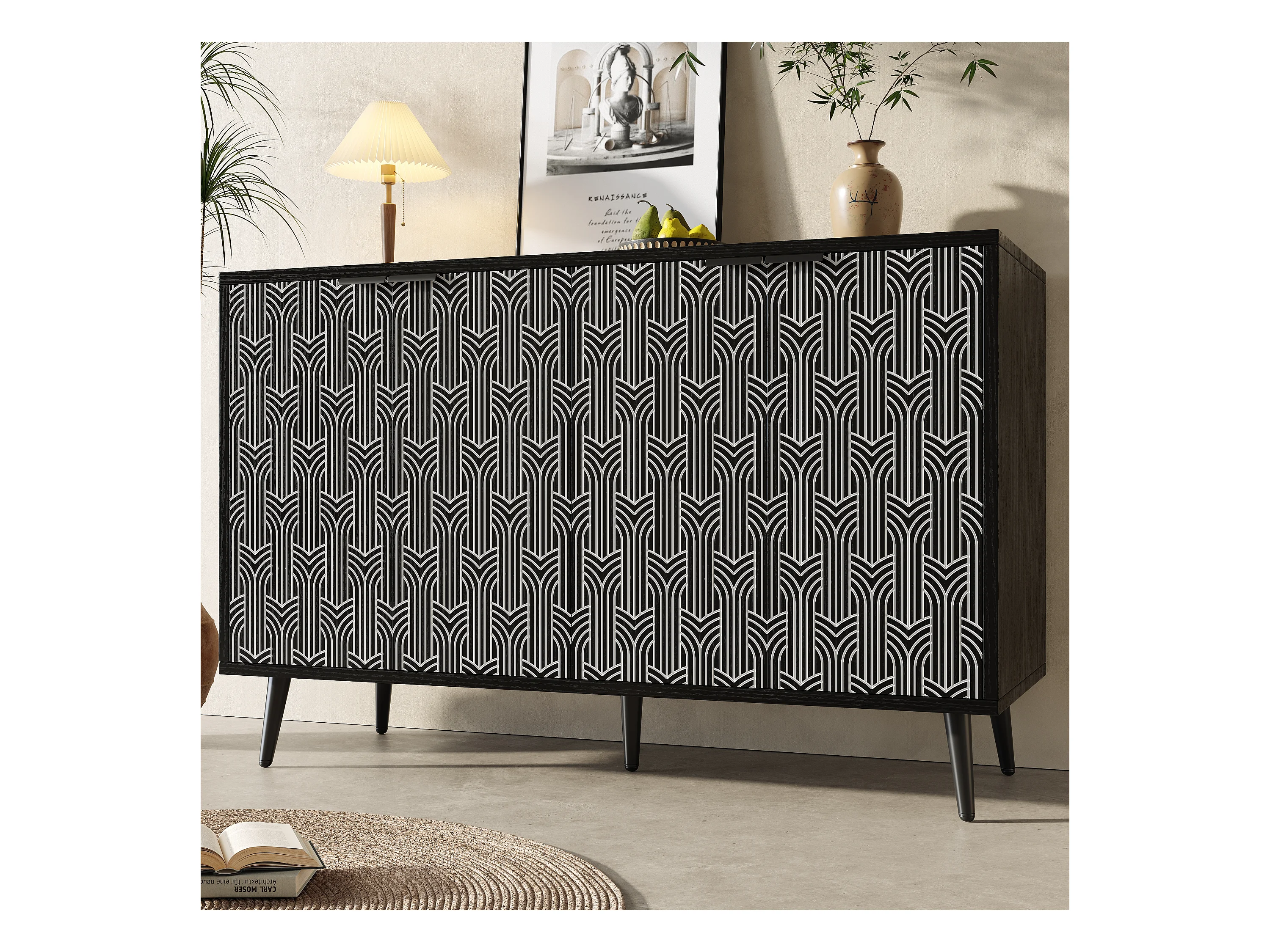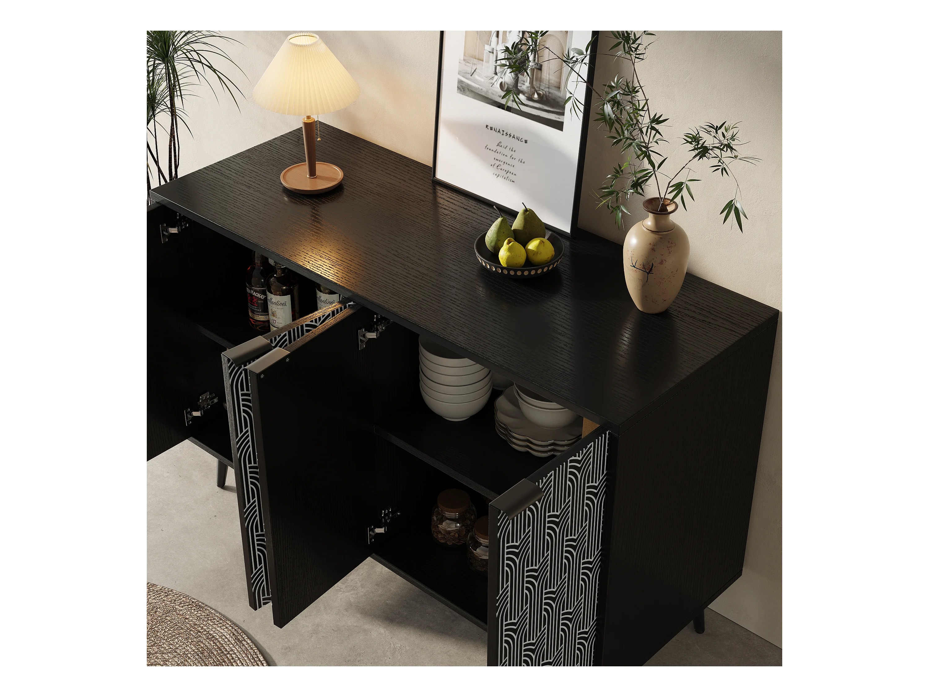 Meuble de rangement avec 4 portes sculptées, étagères ajustables, poignées métalliques, pieds sphériques, MDF, noir (120x35x71.5 cm)