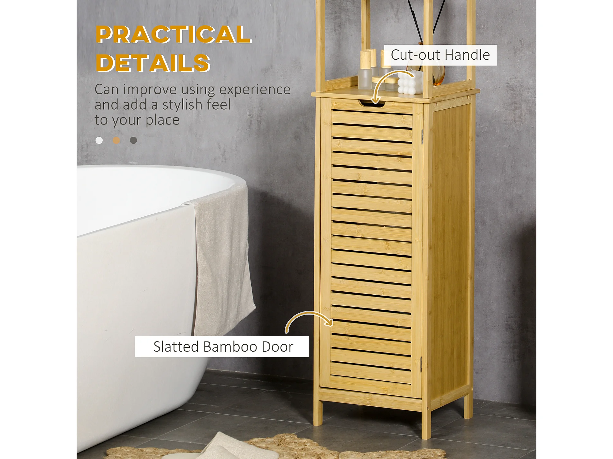 Armoire de salle de bain en bambou, 3 étagères ouvertes, 1 porte avec protection anti-basculement, naturel (34x30x173cm)