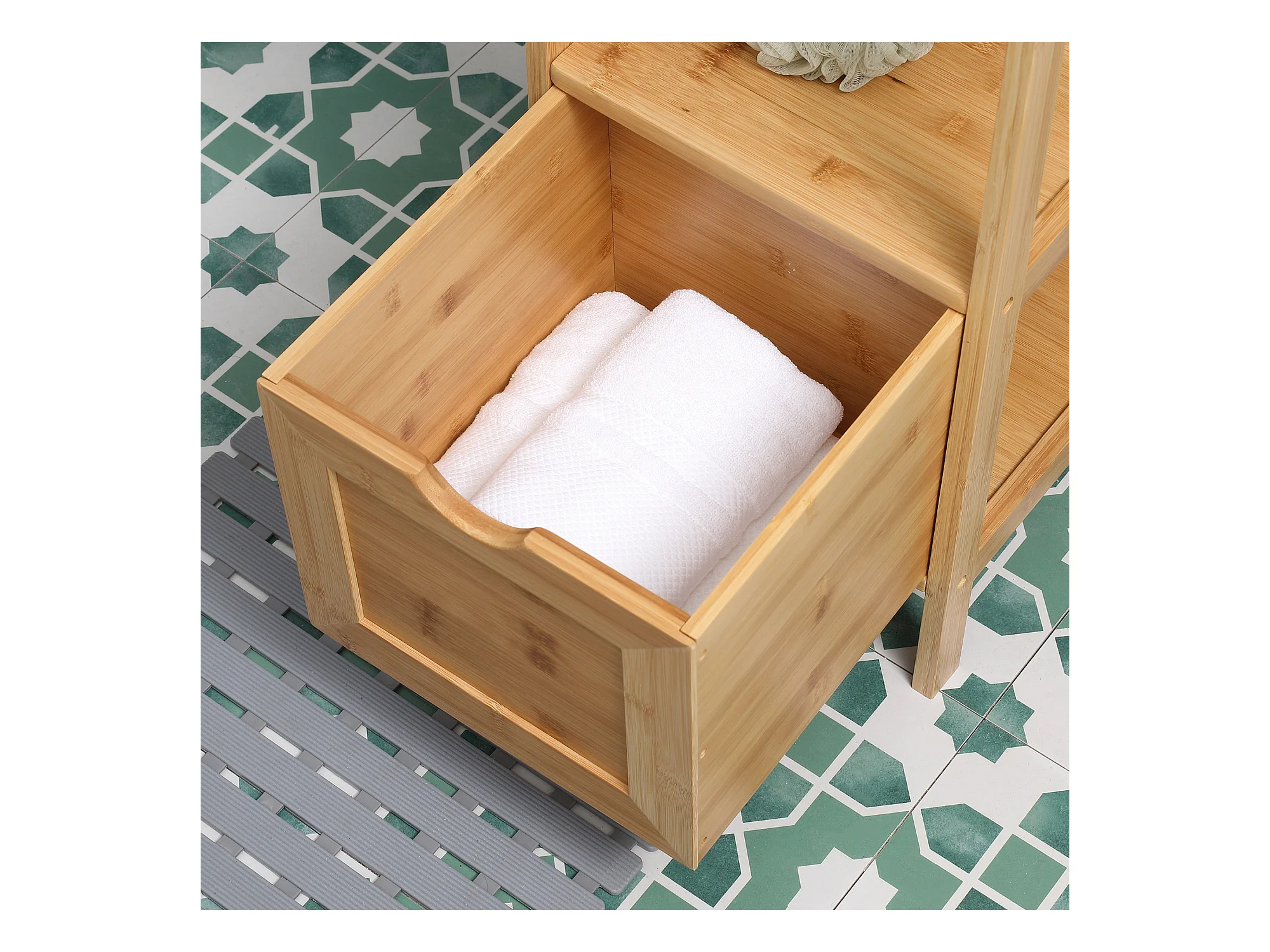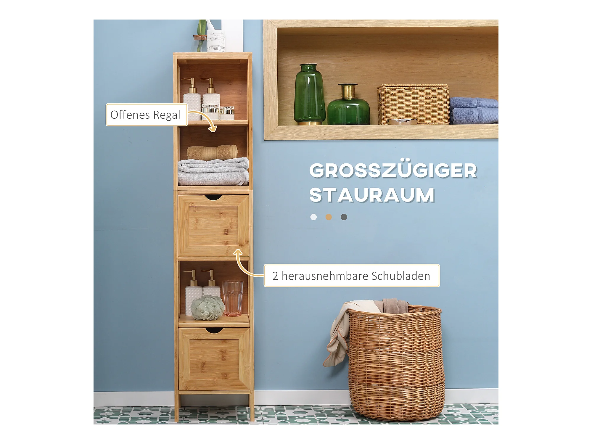 Armoire de salle de bain en bambou, avec 3 étagères et 2 tiroirs, protection contre le basculement, naturel (30x30x140 cm)