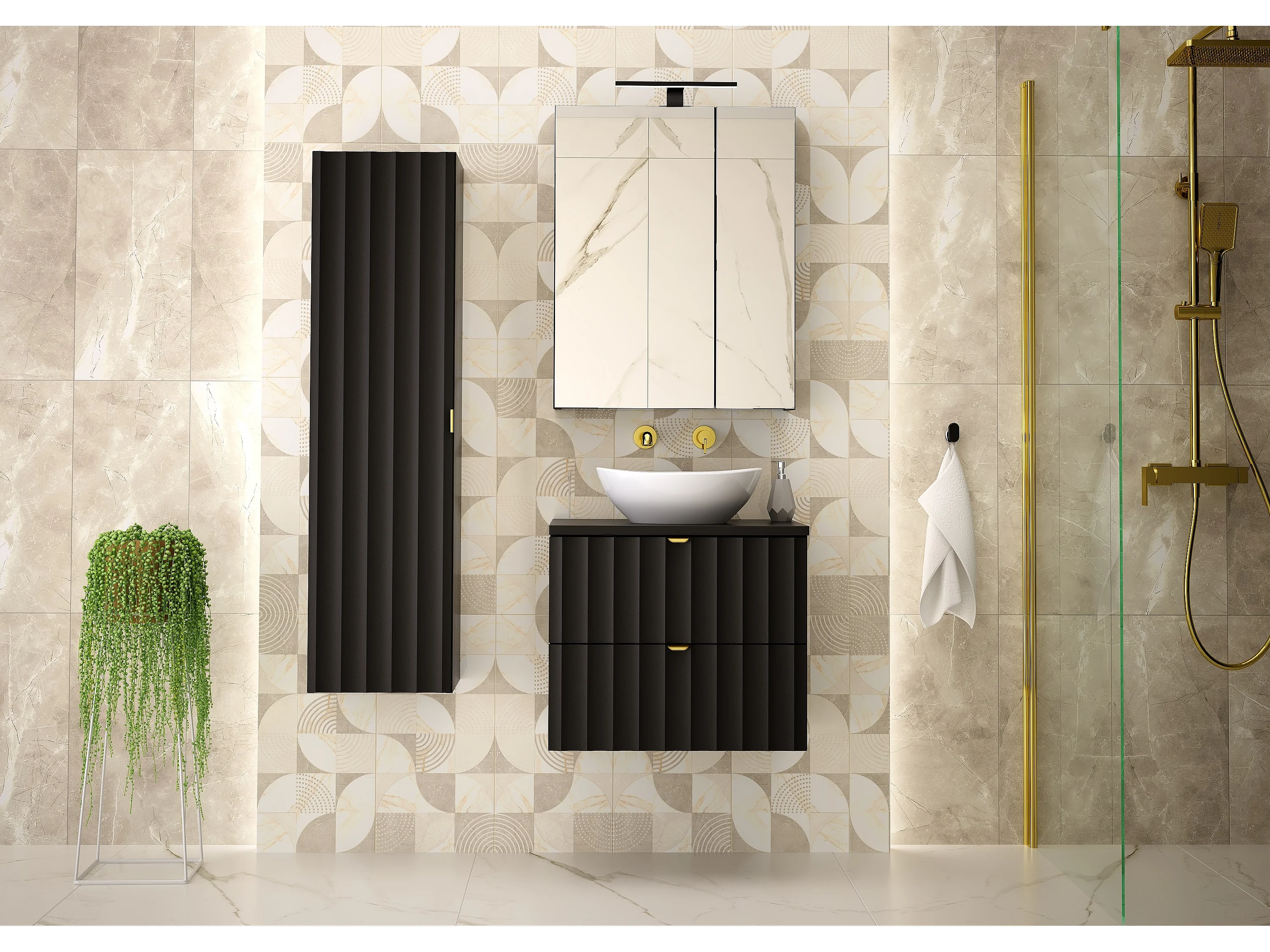 Armoire de salle de bain noire sous lavabo 60 cm Façades rainurées Arcos