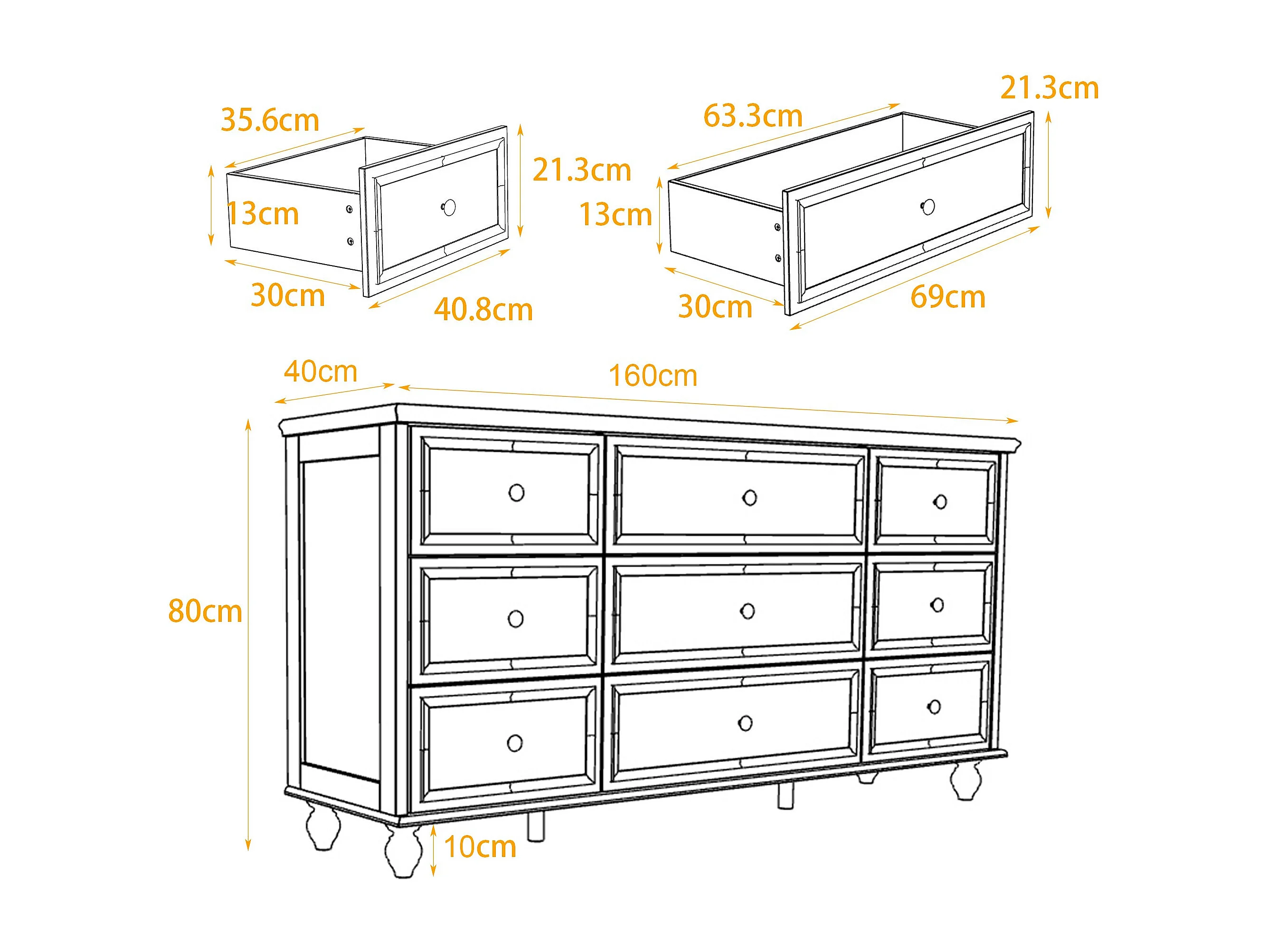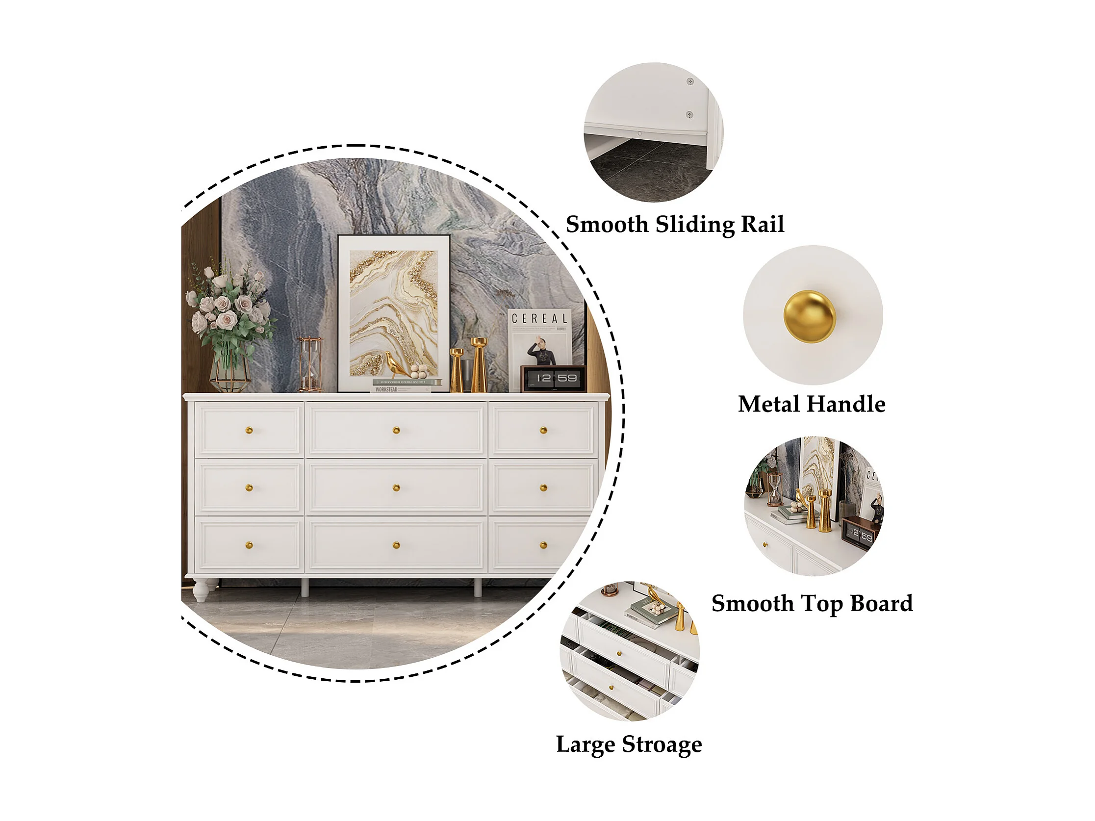 Grande commode avec 9 Tiroirs pour Chambre et Salon, Armoire de Chambre Sculptée avec Poignées Dorées, 160x40x80, Blanc