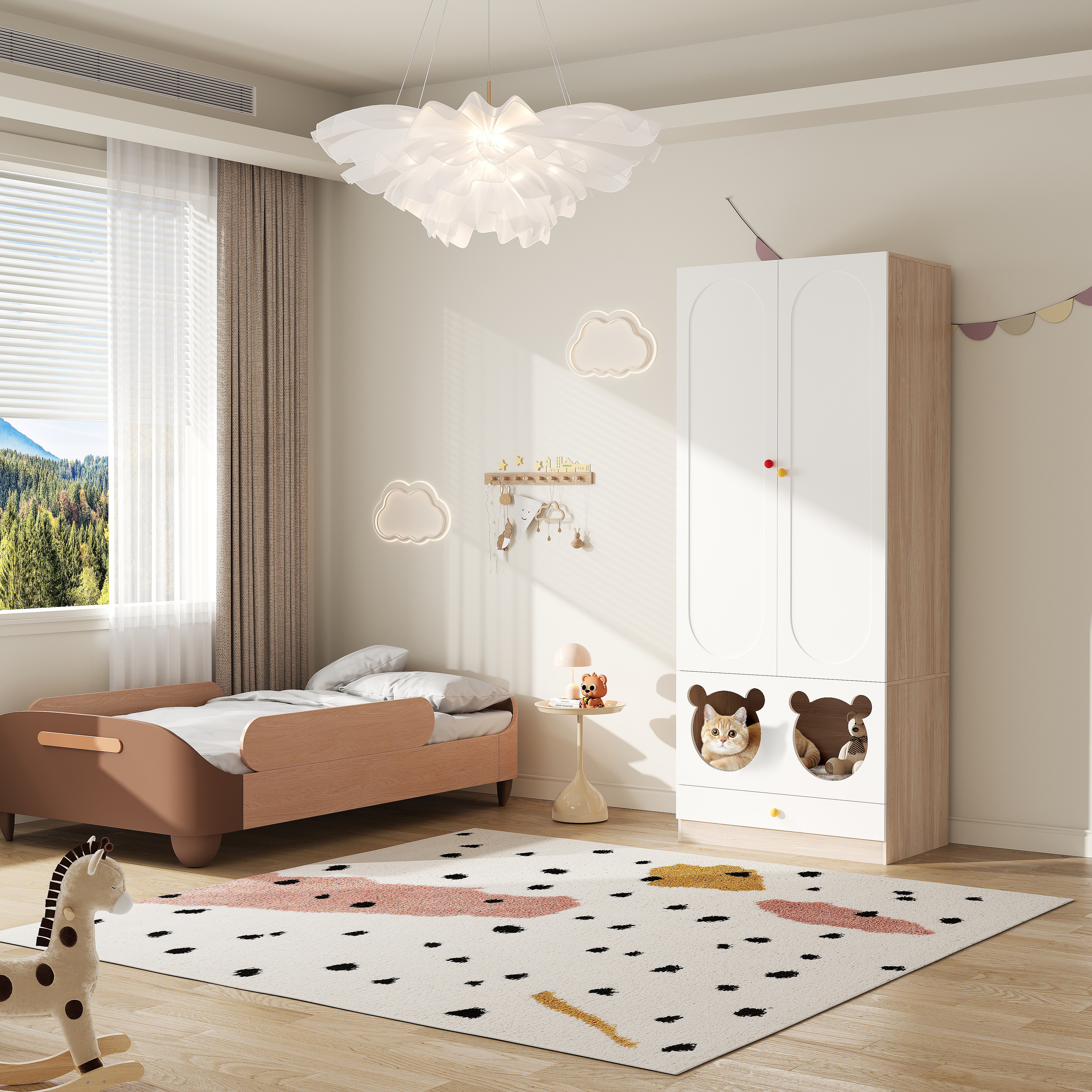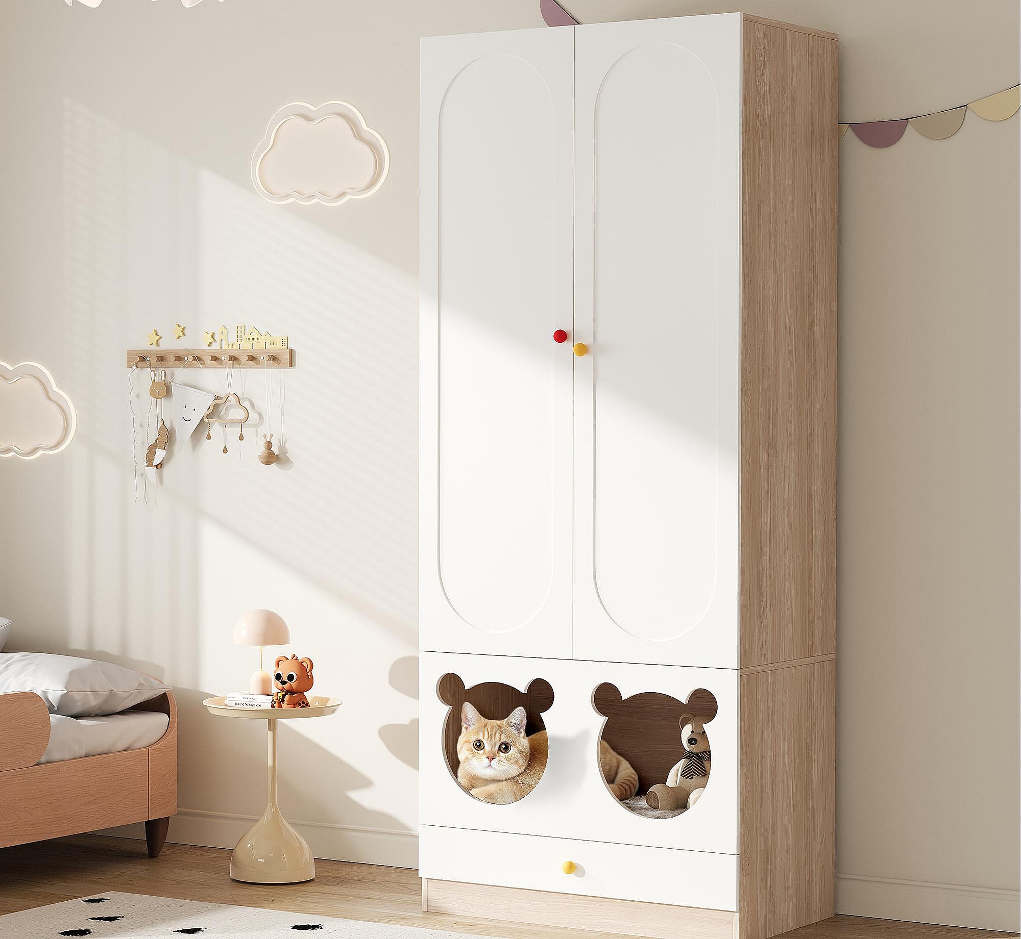 Armoire enfant 80x50x200cm - avec tringle à vêtements - avec lit pour chat - 2 portes - blanc + naturel