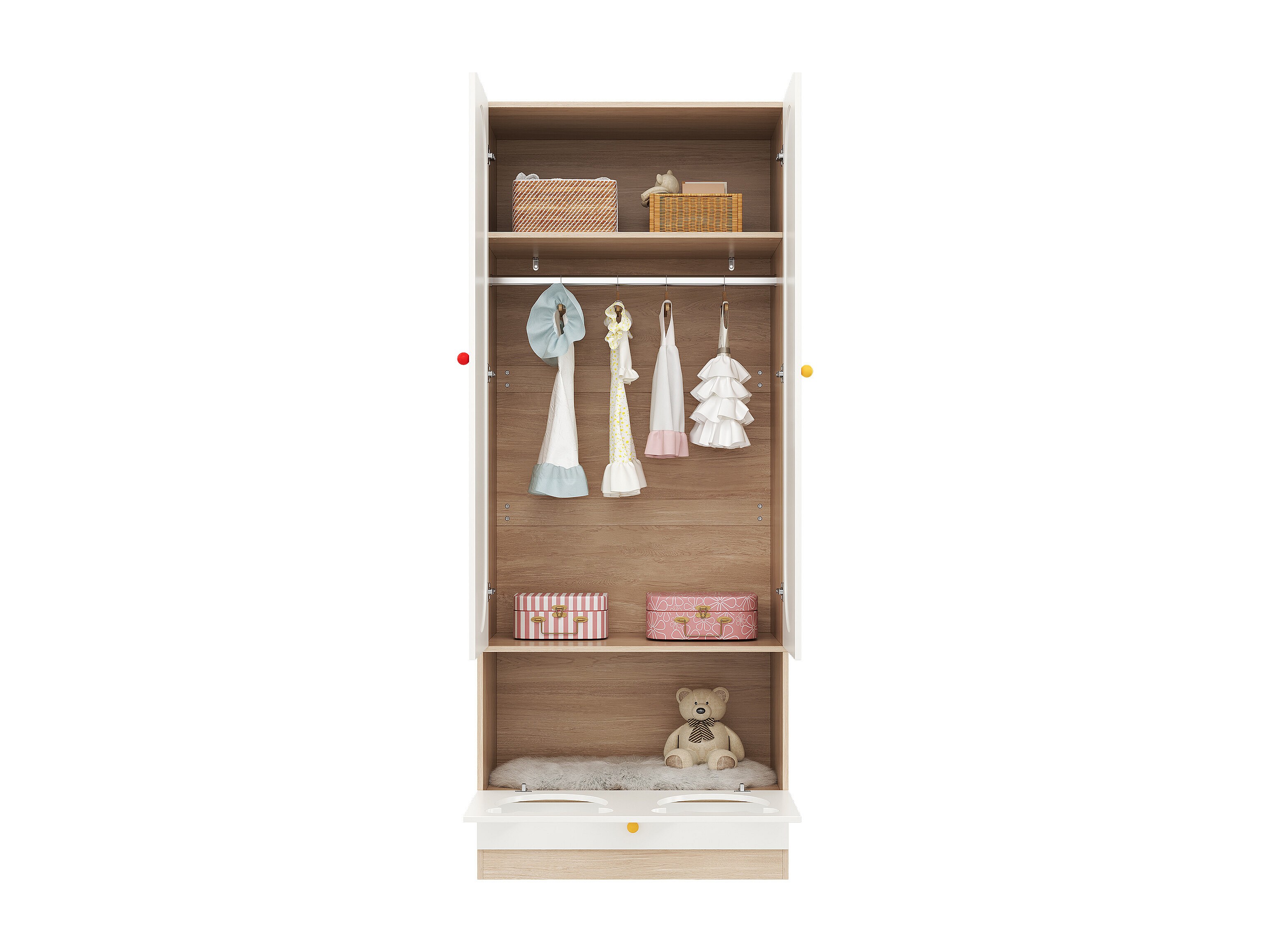La partie supérieure est équipée d'une tringle à vêtements. Les étagères ouvertes au milieu permettent de ranger vêtements et accessoires, tandis que la découpe inférieure en forme d'ours peut également servir de panier pour animaux ou d'espace de rangement.