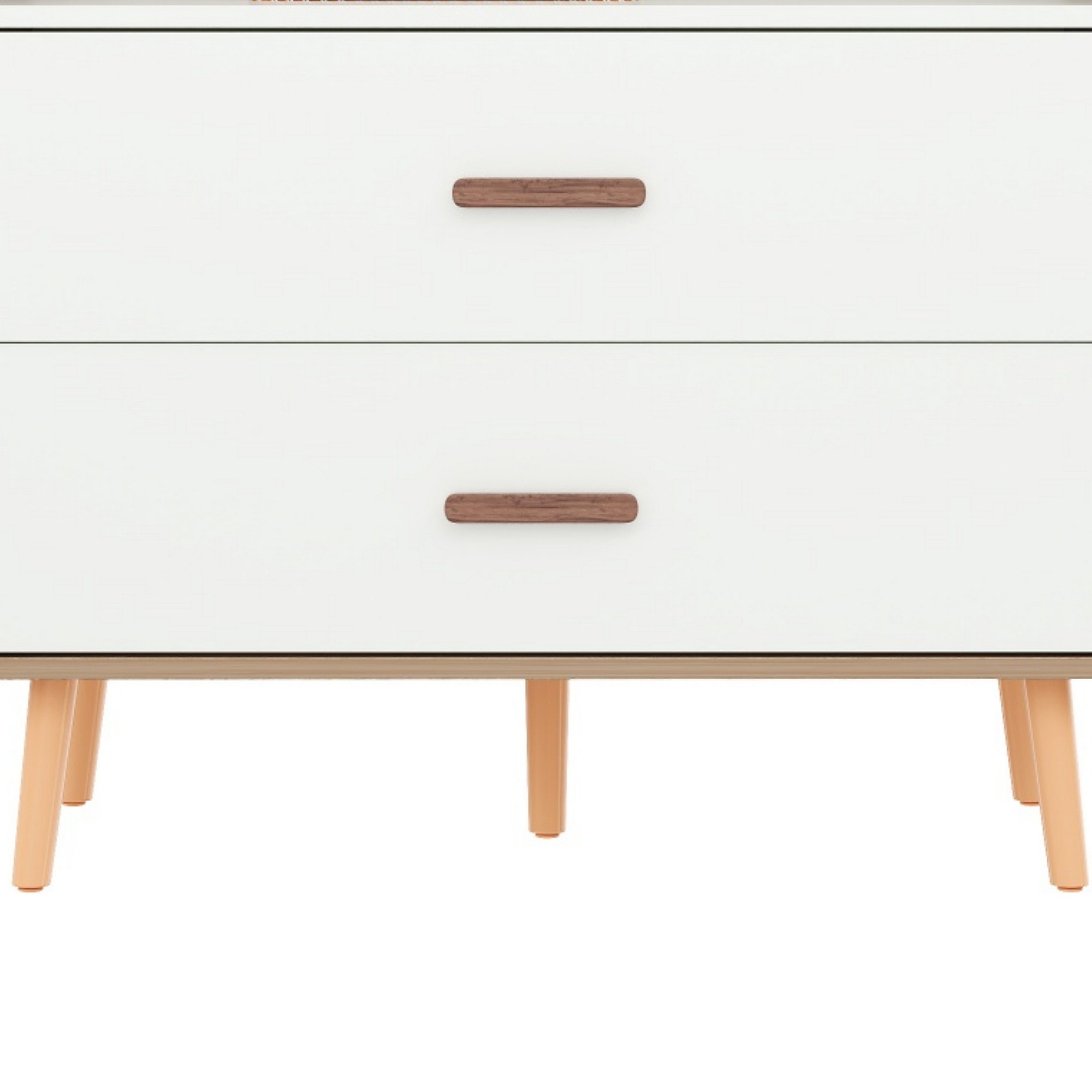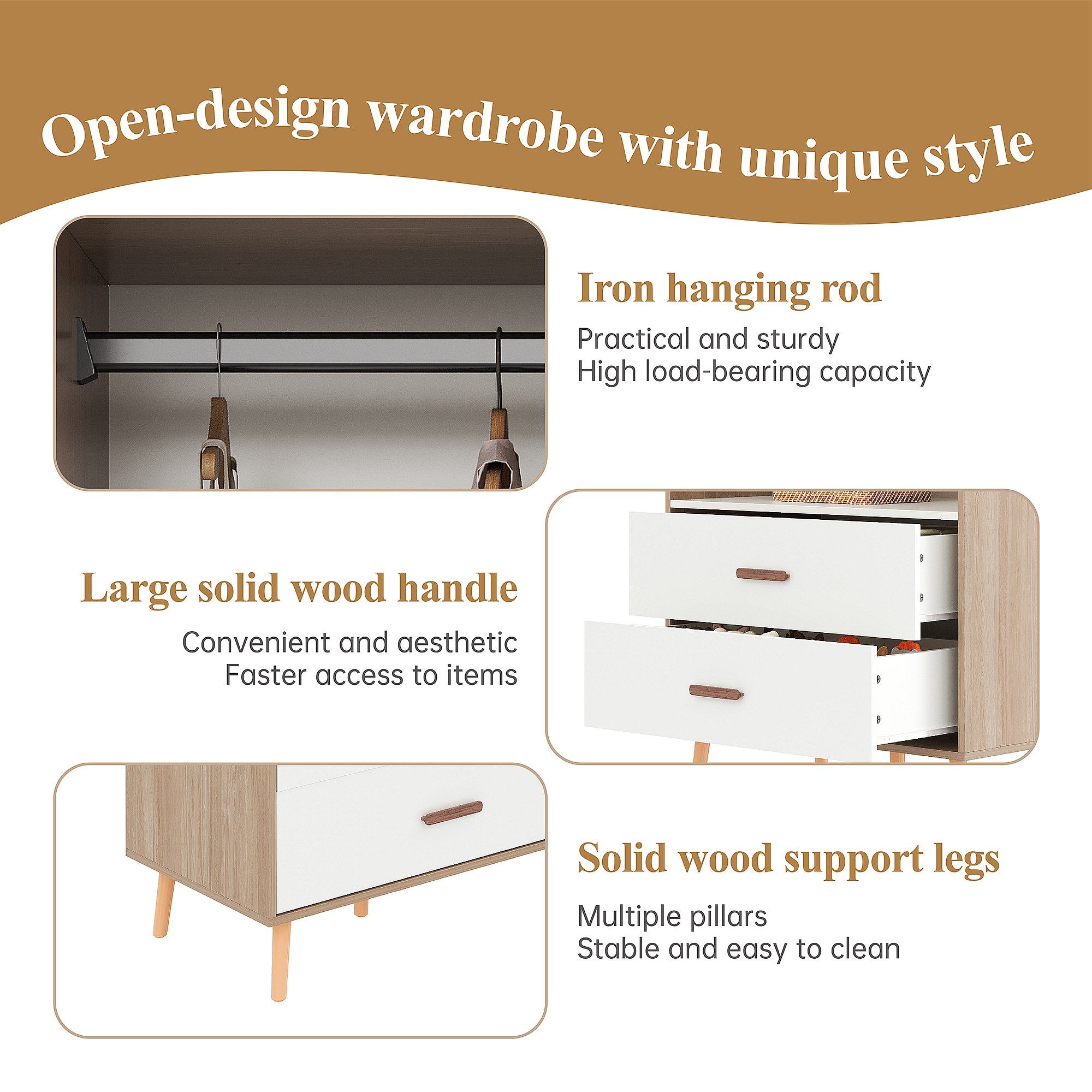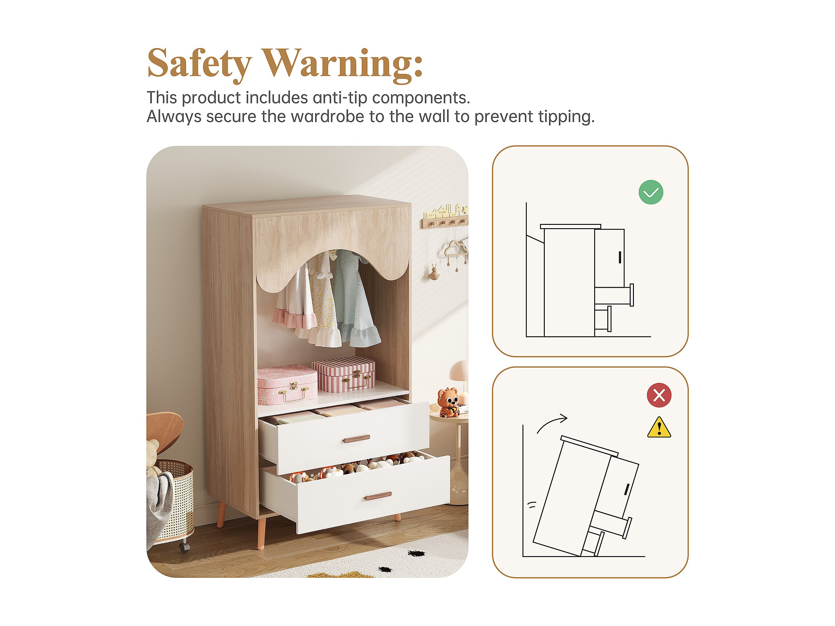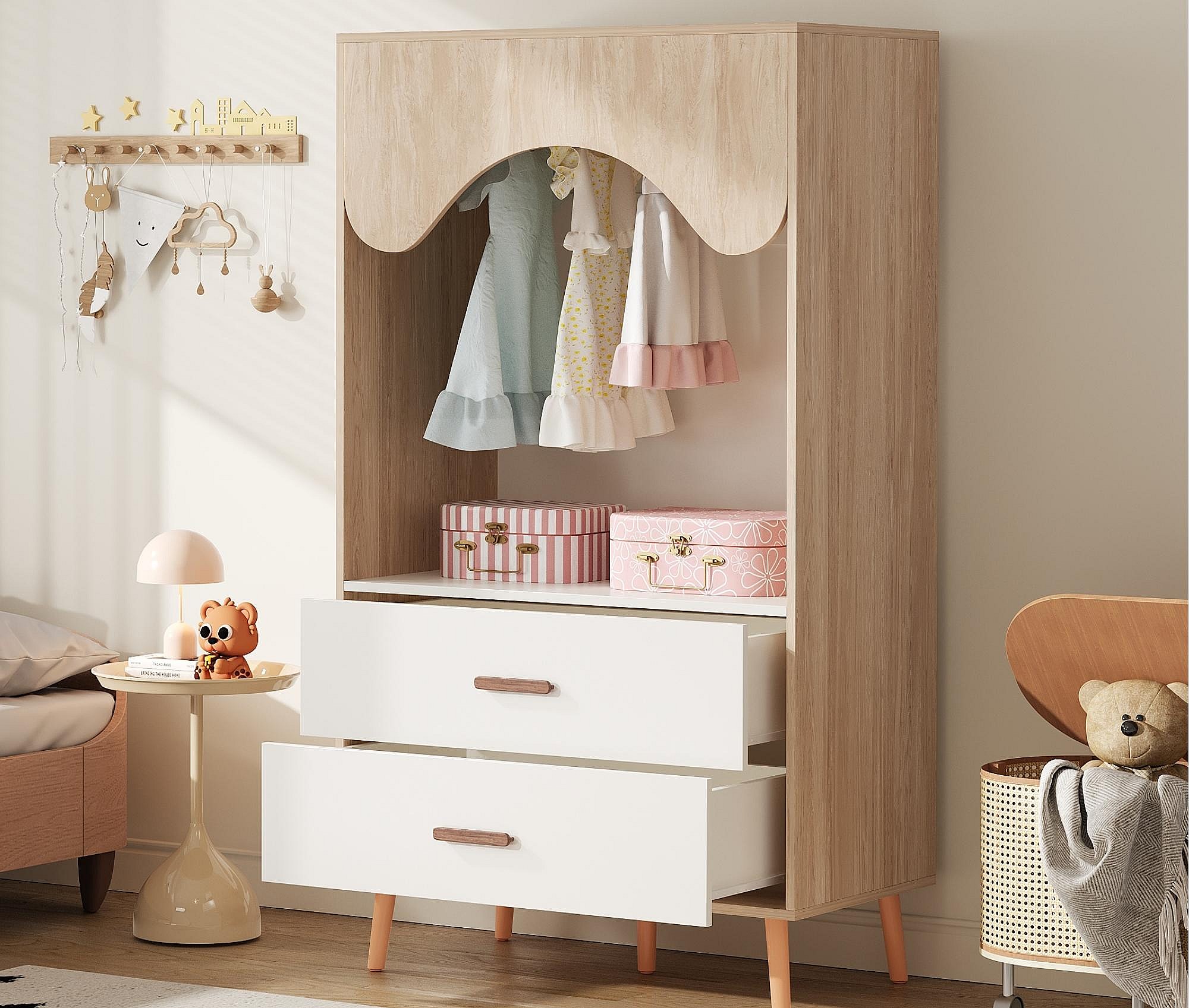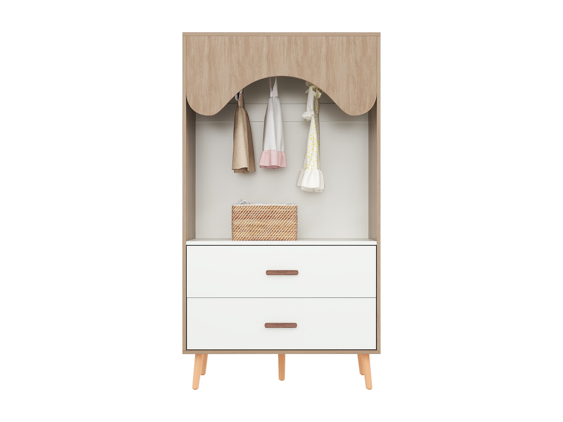 Armoire enfant ouverte 80x46x141.5 cm - avec tringle à vêtements et 2 tiroirs - pieds et poignées en bois massif - blanc + naturel