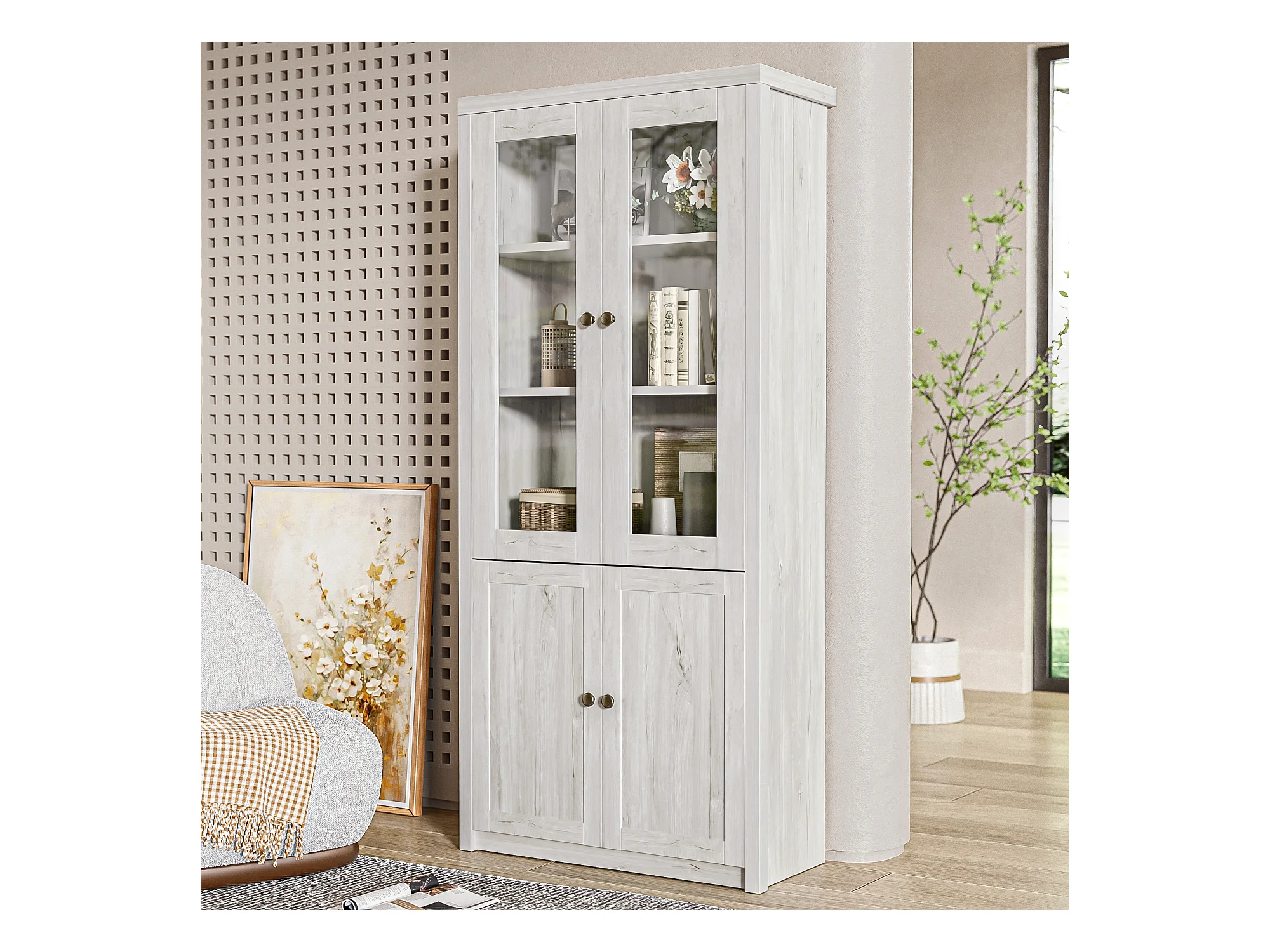 Armoire haute, 2 portes vitrées, 2 portes en bois, MDF, bois clair (80x34x171 cm)