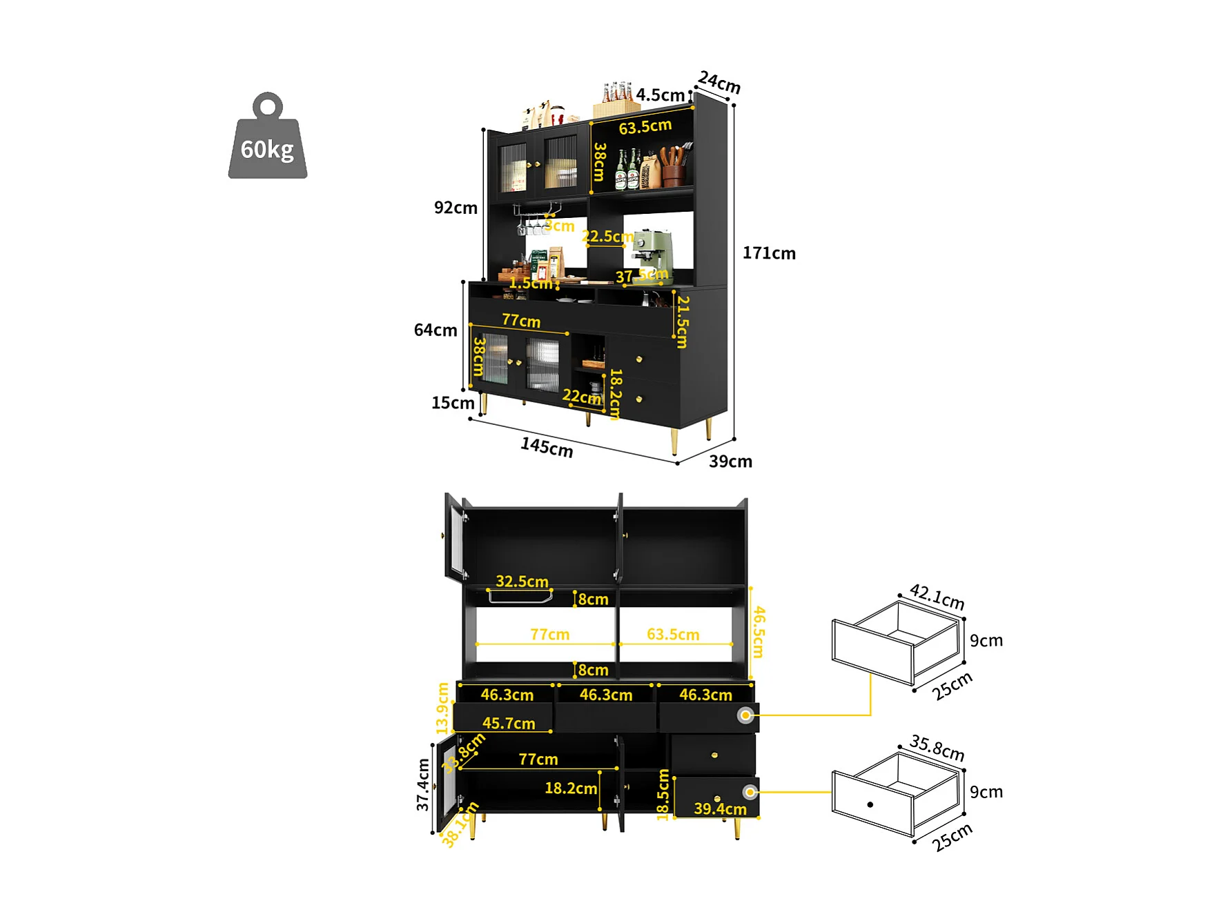 Armoire haute de salle à manger noire et dorée (145 x 39 x 171 cm) avec portes en verre perforé et casier à vin