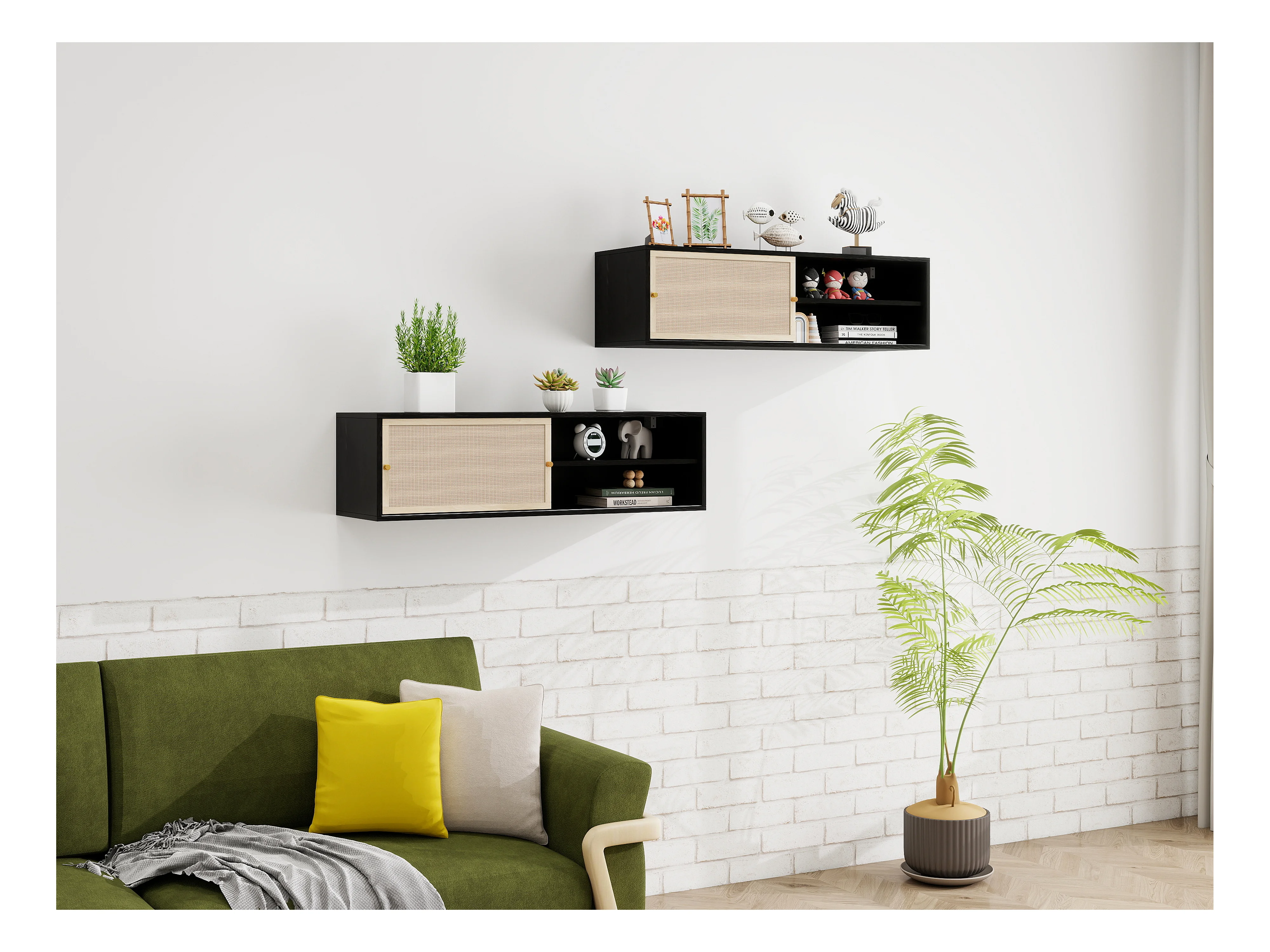 Armoire murale noire avec portes coulissantes, design avec éléments en rotin, panneau de particules, noir (110x40x31 cm)