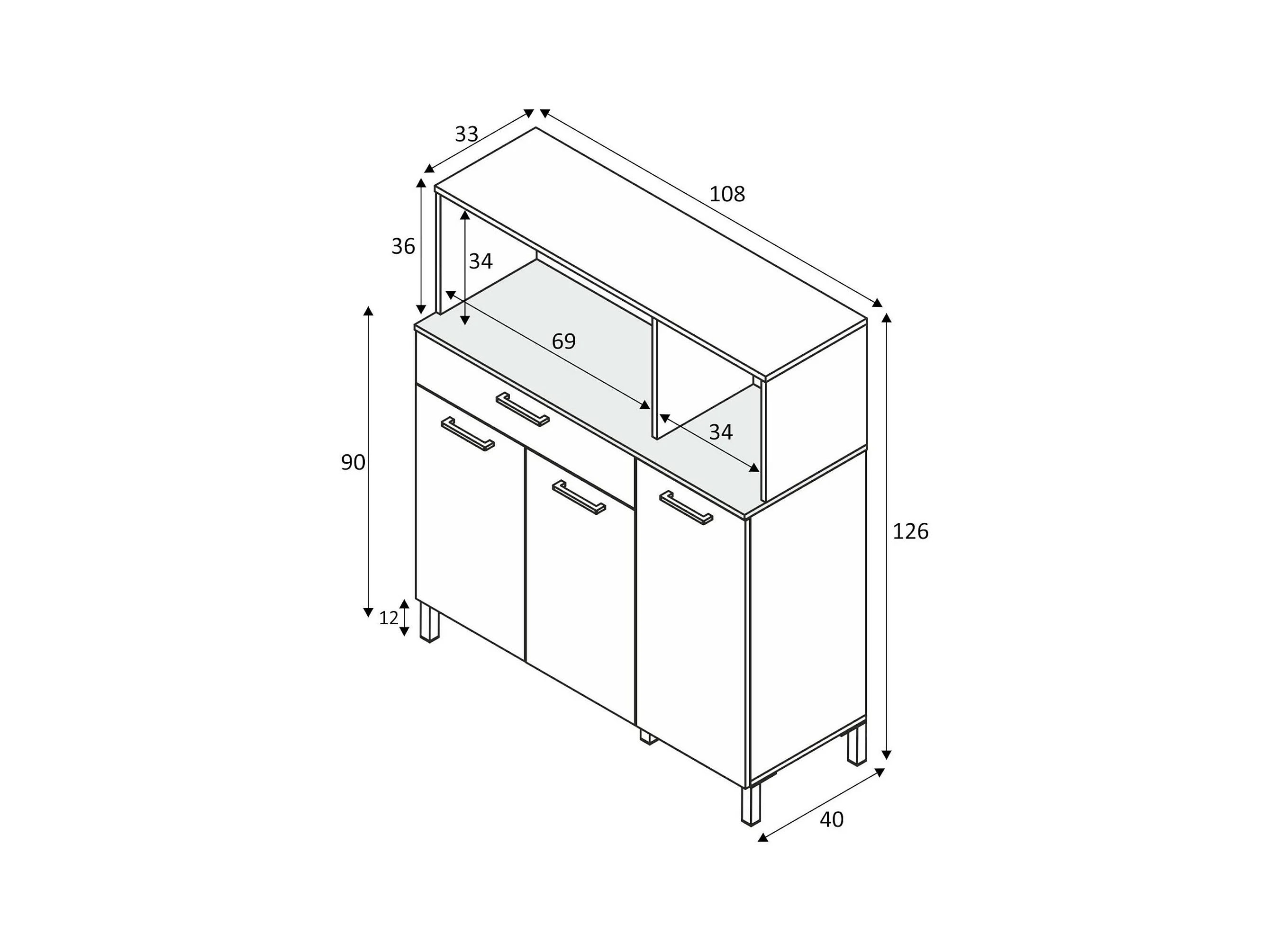 Armoire polyvalente Dlarin, Armoire de cuisine auxiliaire, Buffet avec 3 portes et 1 tiroir avec étagères, Armoire ouverte, 108x40h126 cm, Blanc et Chêne