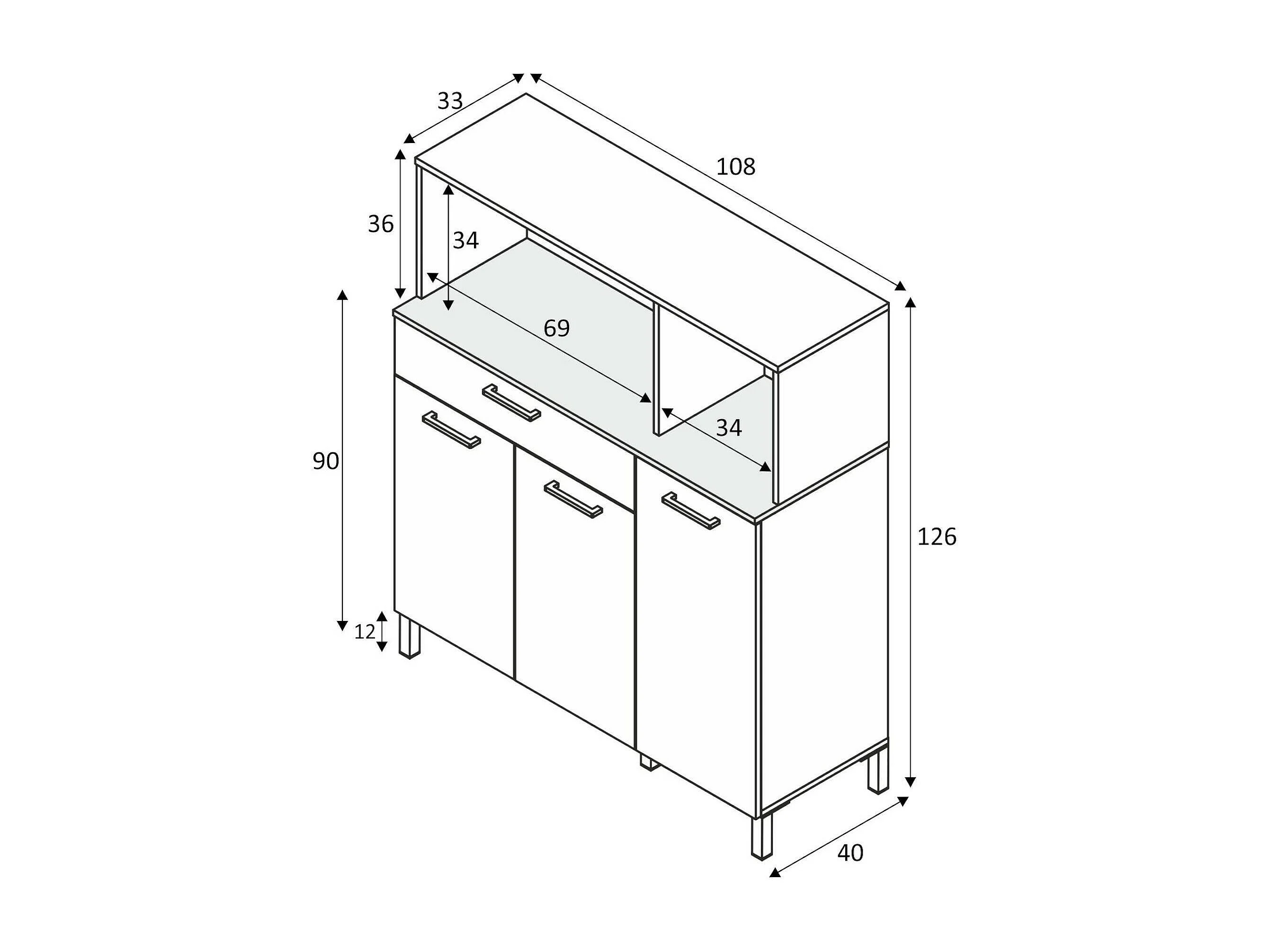 Armoire polyvalente Norfolk, Armoire de cuisine auxiliaire, Buffet avec 3 portes et 1 tiroir avec étagères, Armoire ouverte, 108x40h126 cm, Blanc et Chêne