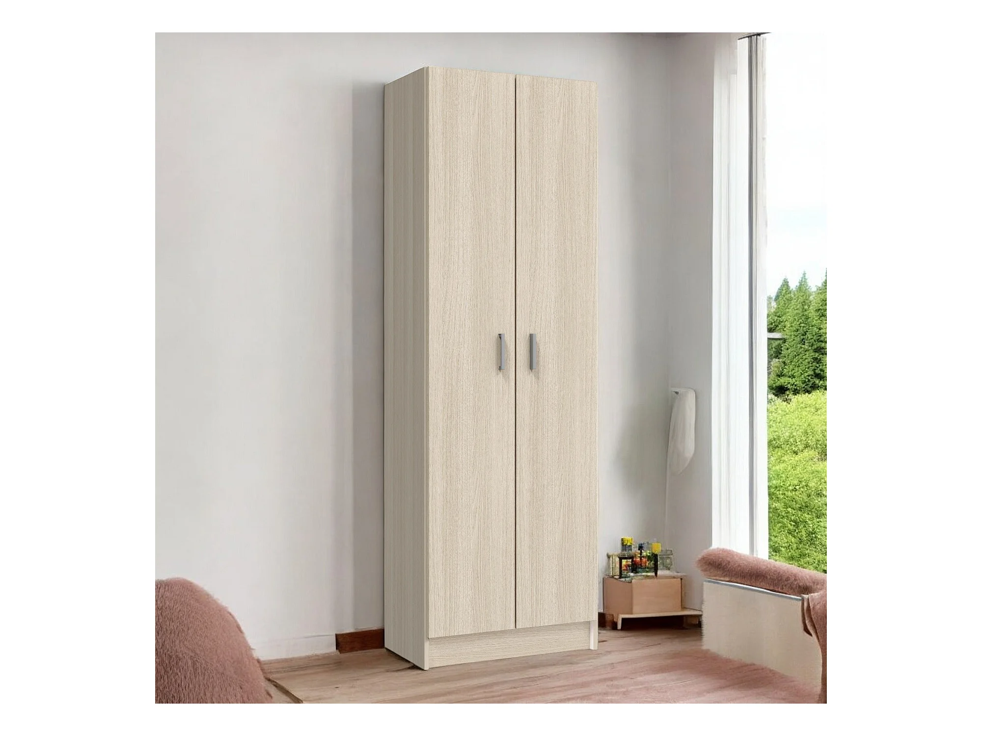 Armoire Burbank, armoire de chambre 2 portes 2 tiroirs, armoire de chambre avec barre de suspension, 81x52h180 cm, chêne
