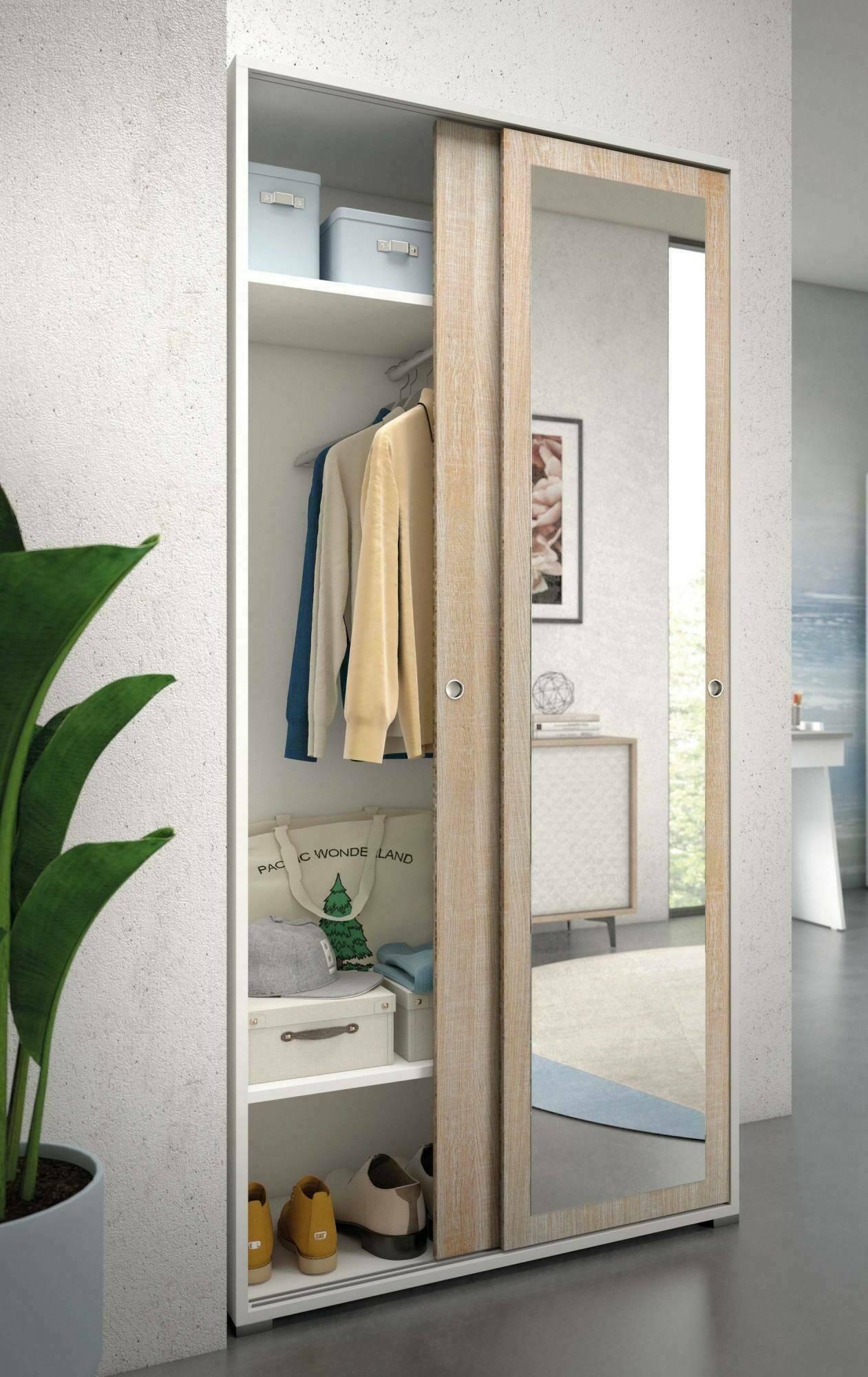 ARMOIRE 2 PORTES - Armoire avec 2 portes coulissantes et miroir, Armoire avec tringle à vêtements et étagères, 100% Made in Italy, 90x45h195 cm, Chêne et Blanc.