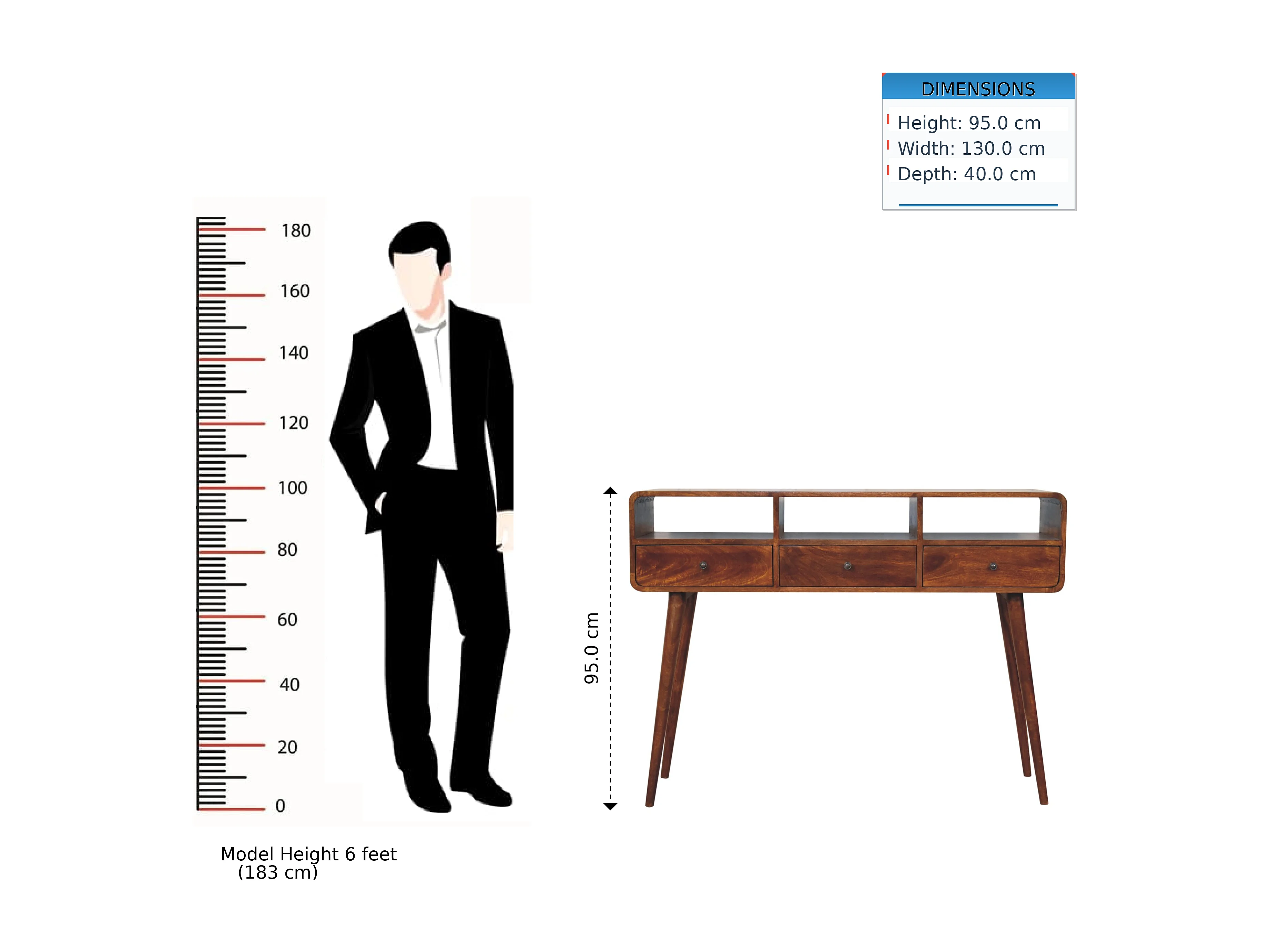 Console triple courbure en châtaignier Artisan Furniture, 3 tiroirs, 3 étagères, marron