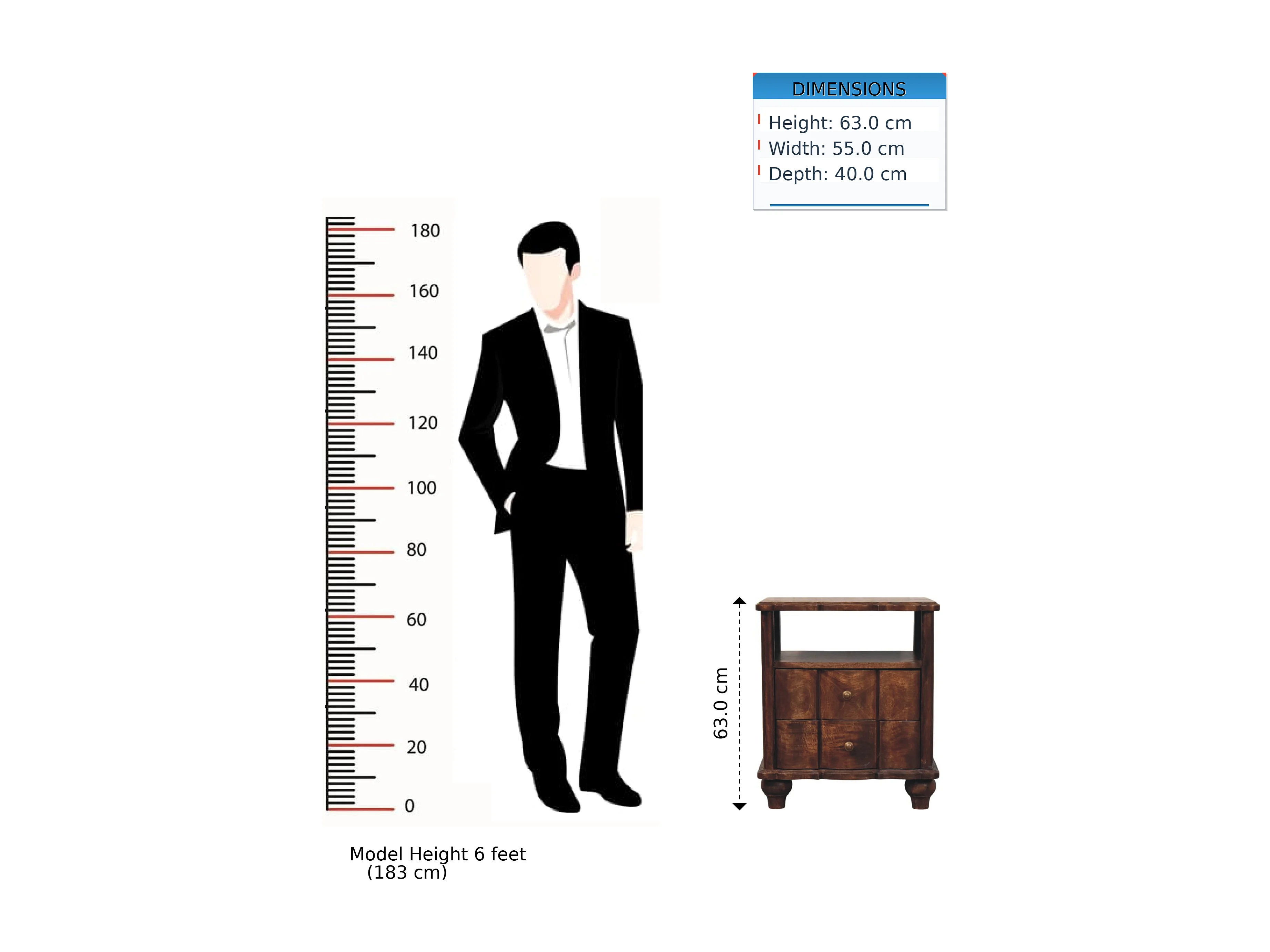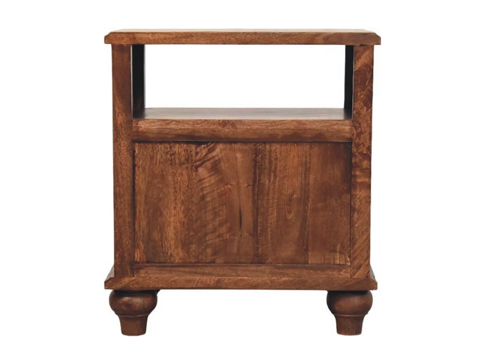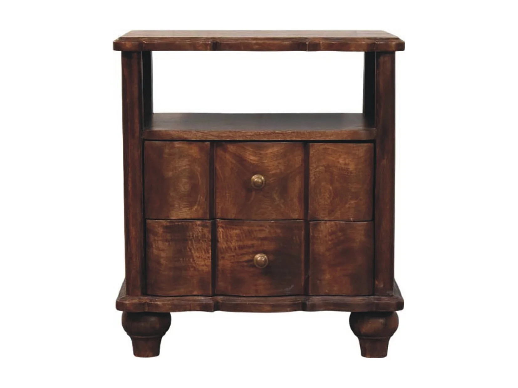 Meuble artisanal – Table de chevet Lume Roasted Shelf, 2 tiroirs, 1 étagère ouverte, marro