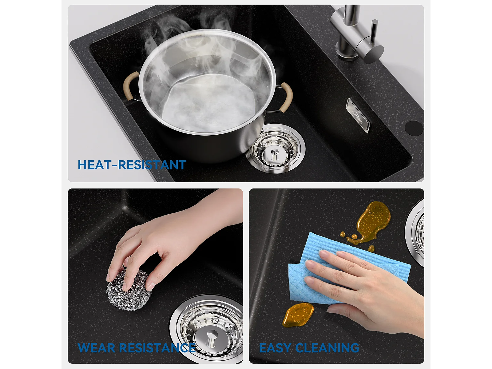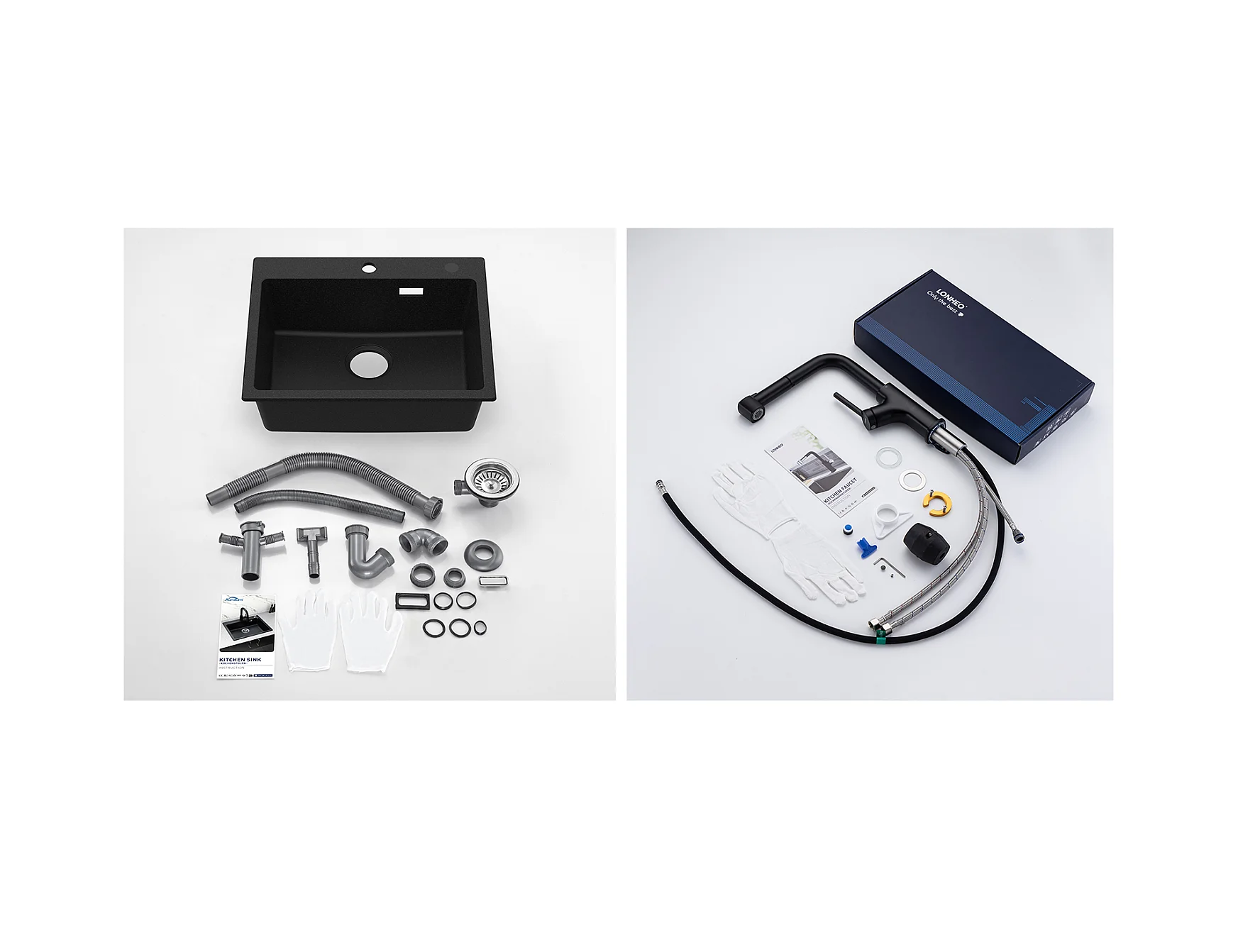 1 Bac Évier Cuisine en Granit,55*45*20cm,Kit de Vidage,Noir+Robinet Cuisine,Orientable 360°,Eau Chaude/Froide,Noir